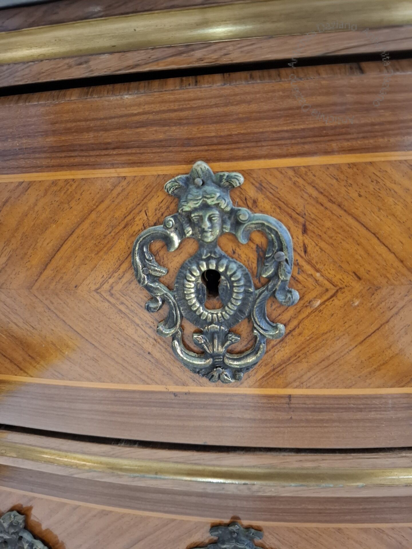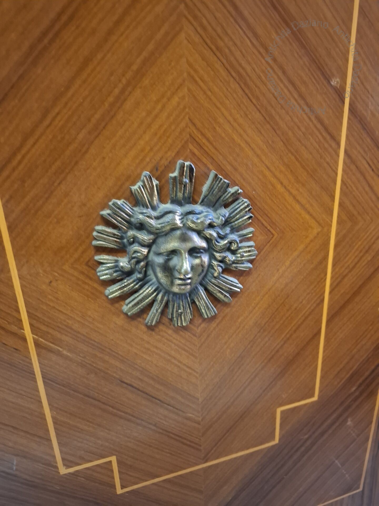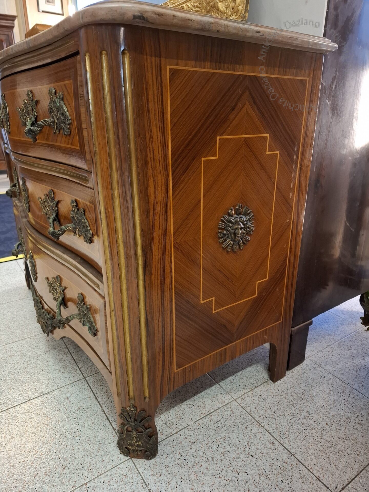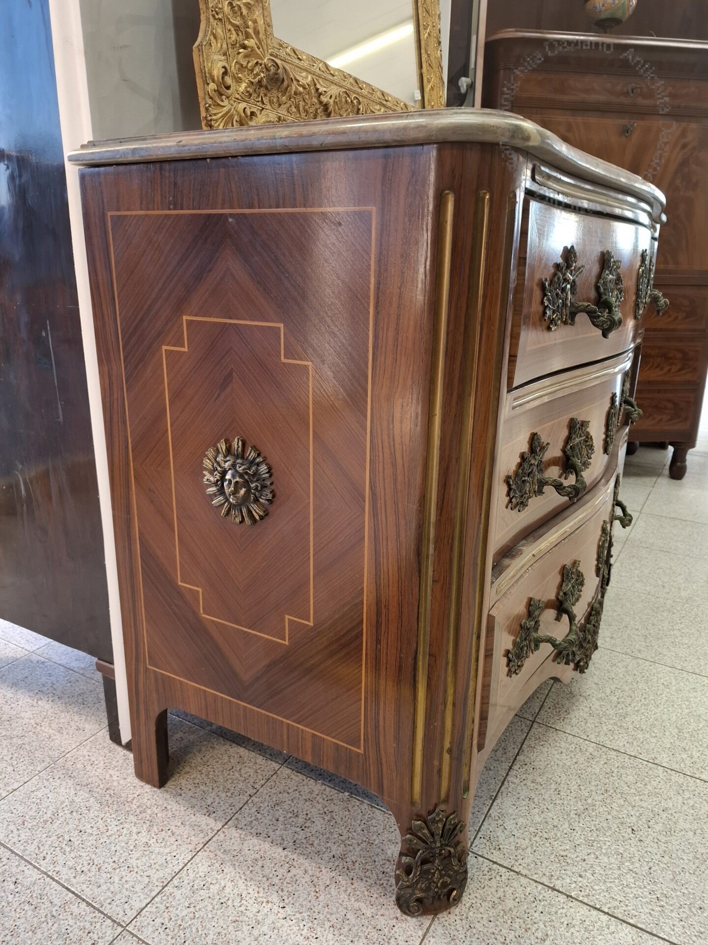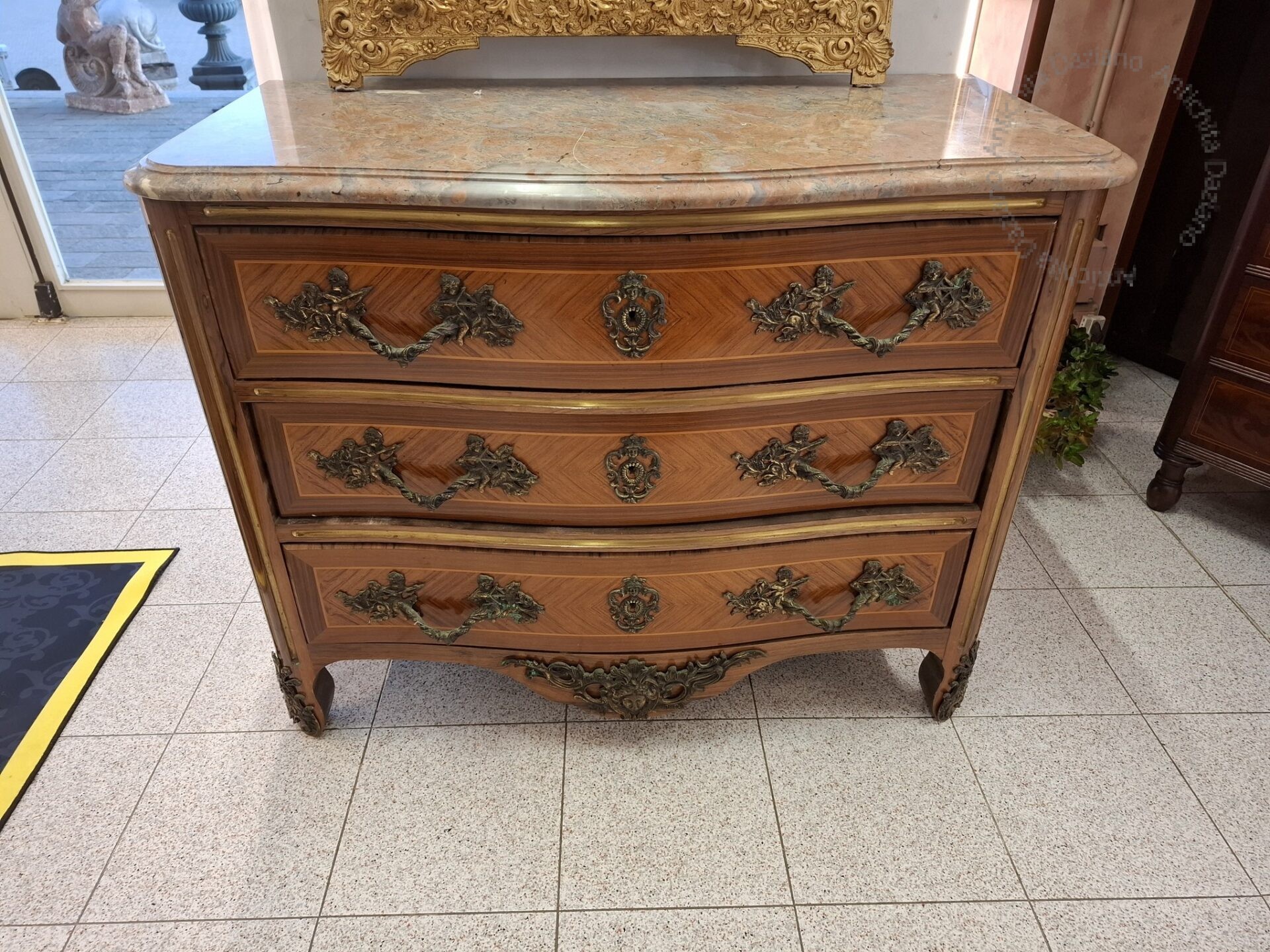 Early 19th-century chest of drawers, veneered in mahogany with original bronze finishes and a marble top.