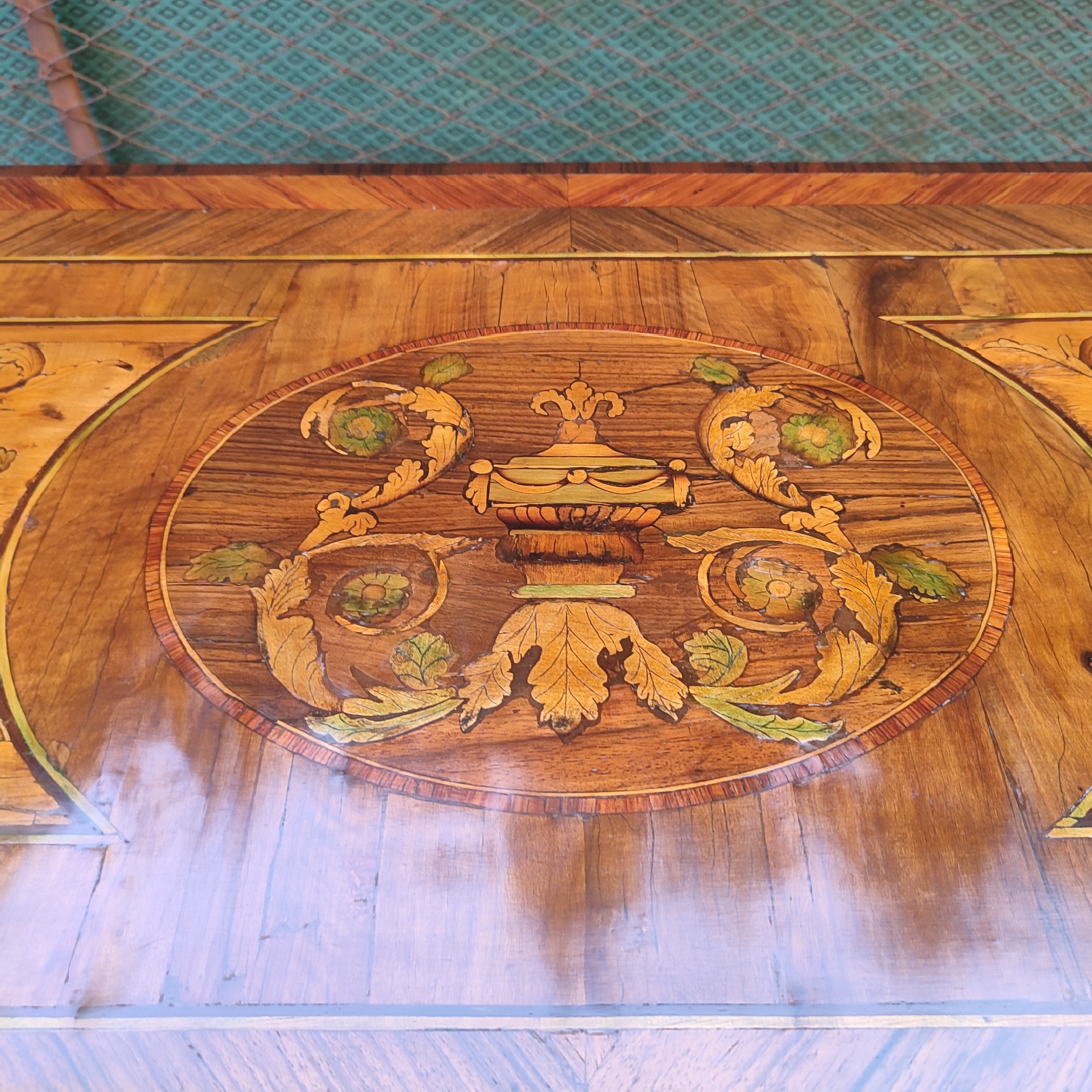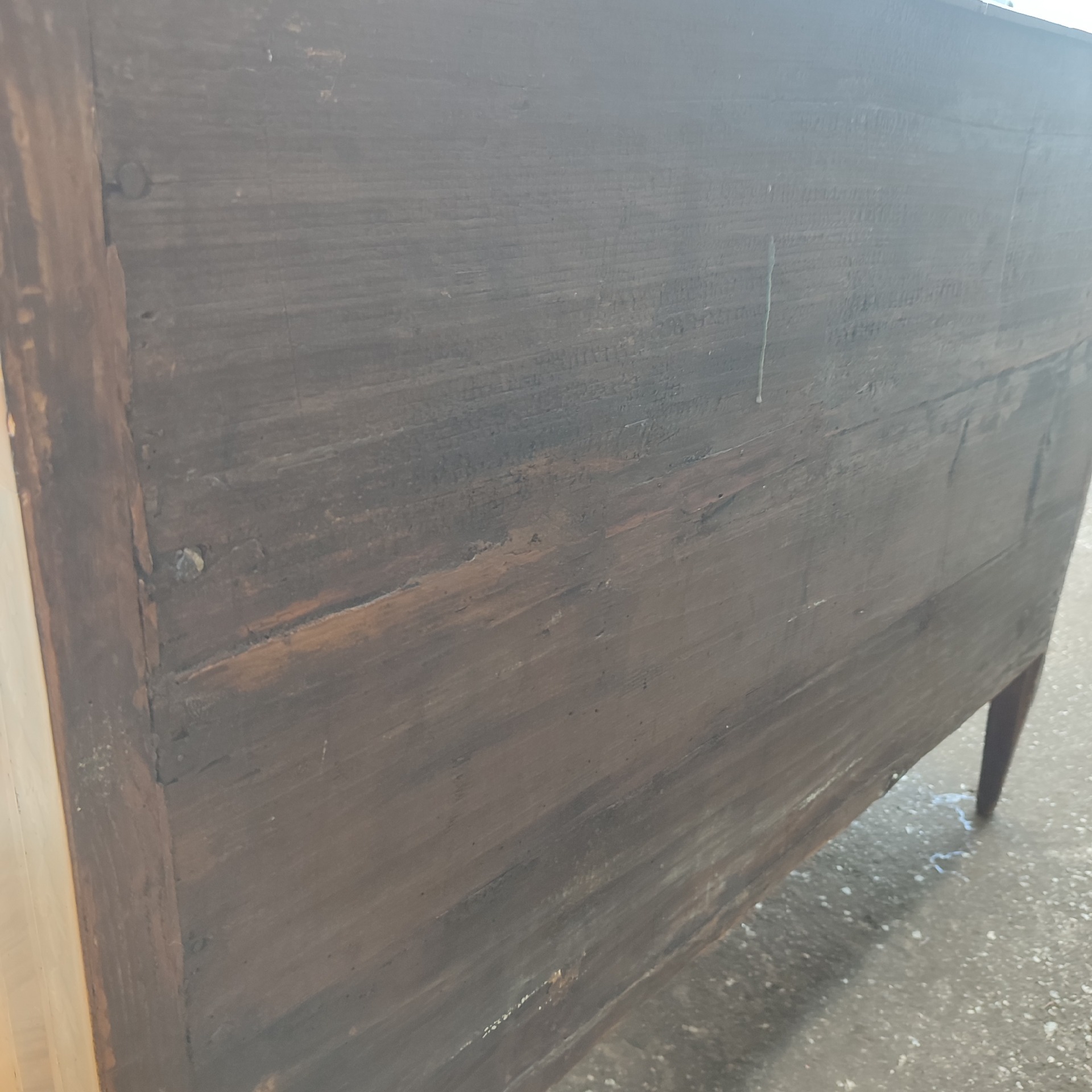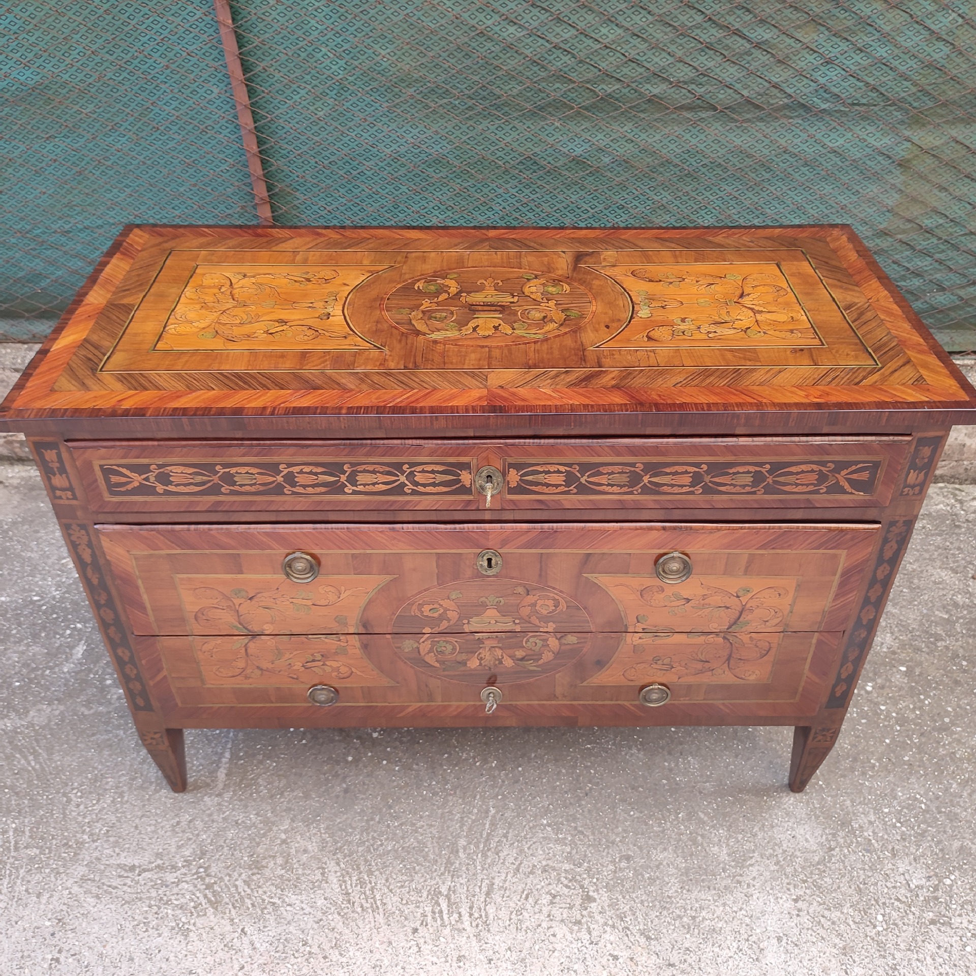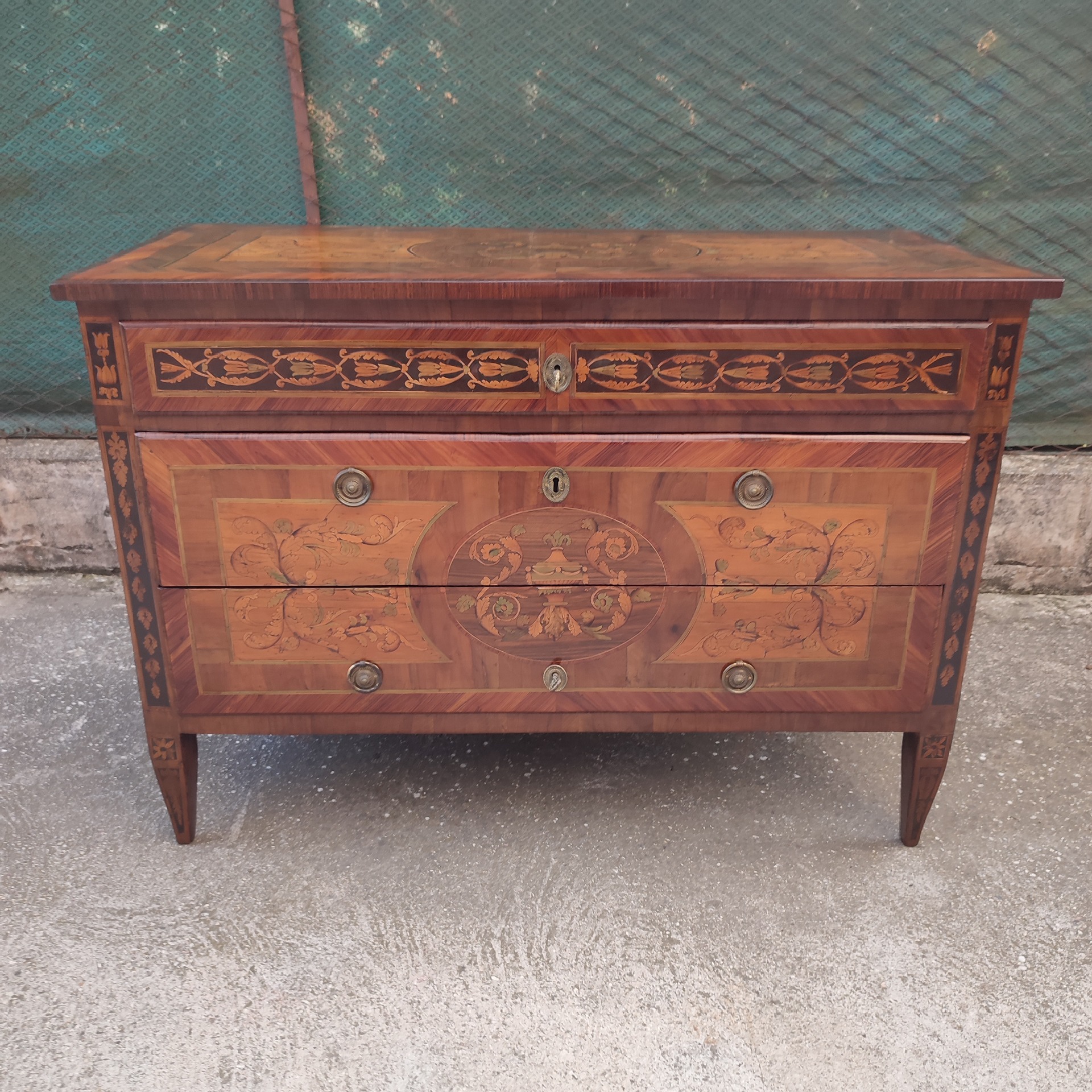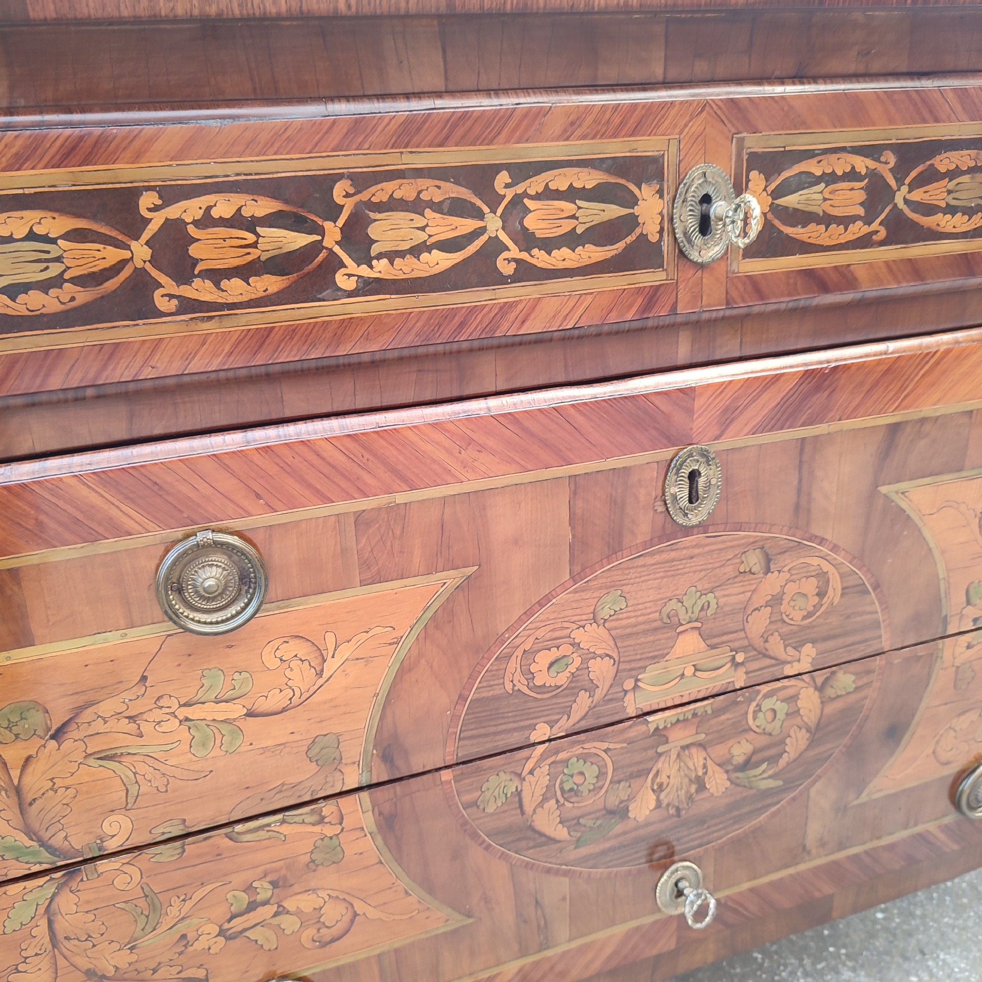 This is a beautiful Louis XVI chest of drawers, inlaid with various types of wood. Restored antique furniture, very elegant. Dimensions: Width 124 cm, Depth 57 cm, Height 90 cm. We are at your disposal for photos or questions.
