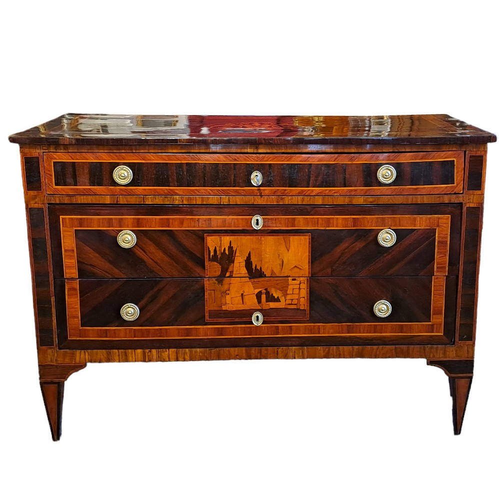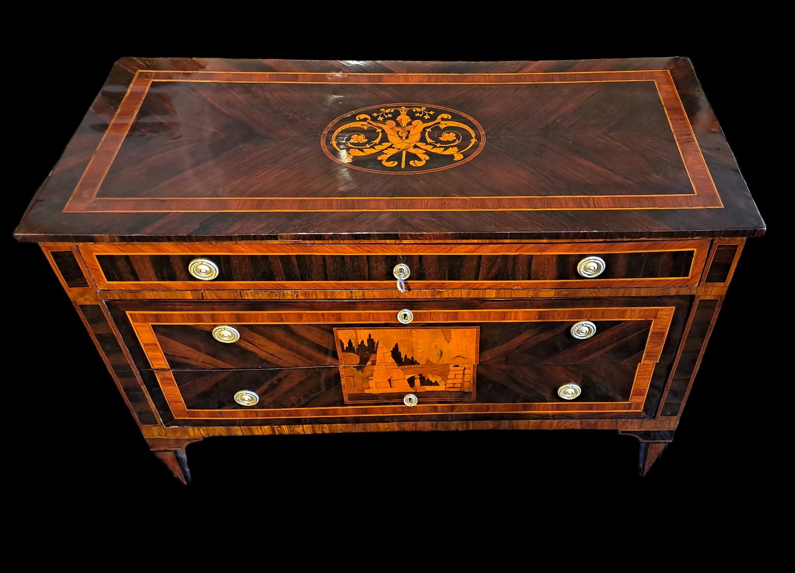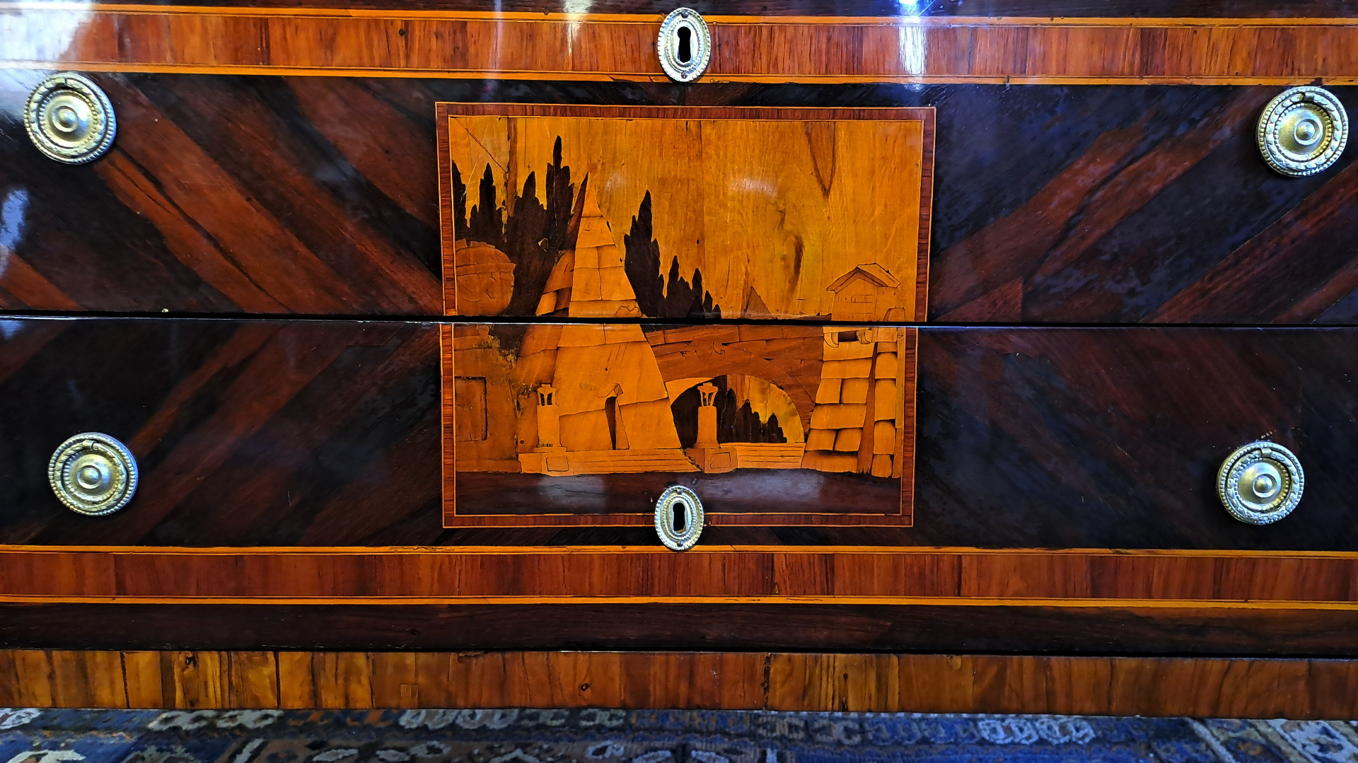 The front is centered by an inlay depicting a landscape, while the top and sides bear a rosette with phytomorphic and spiral motifs.