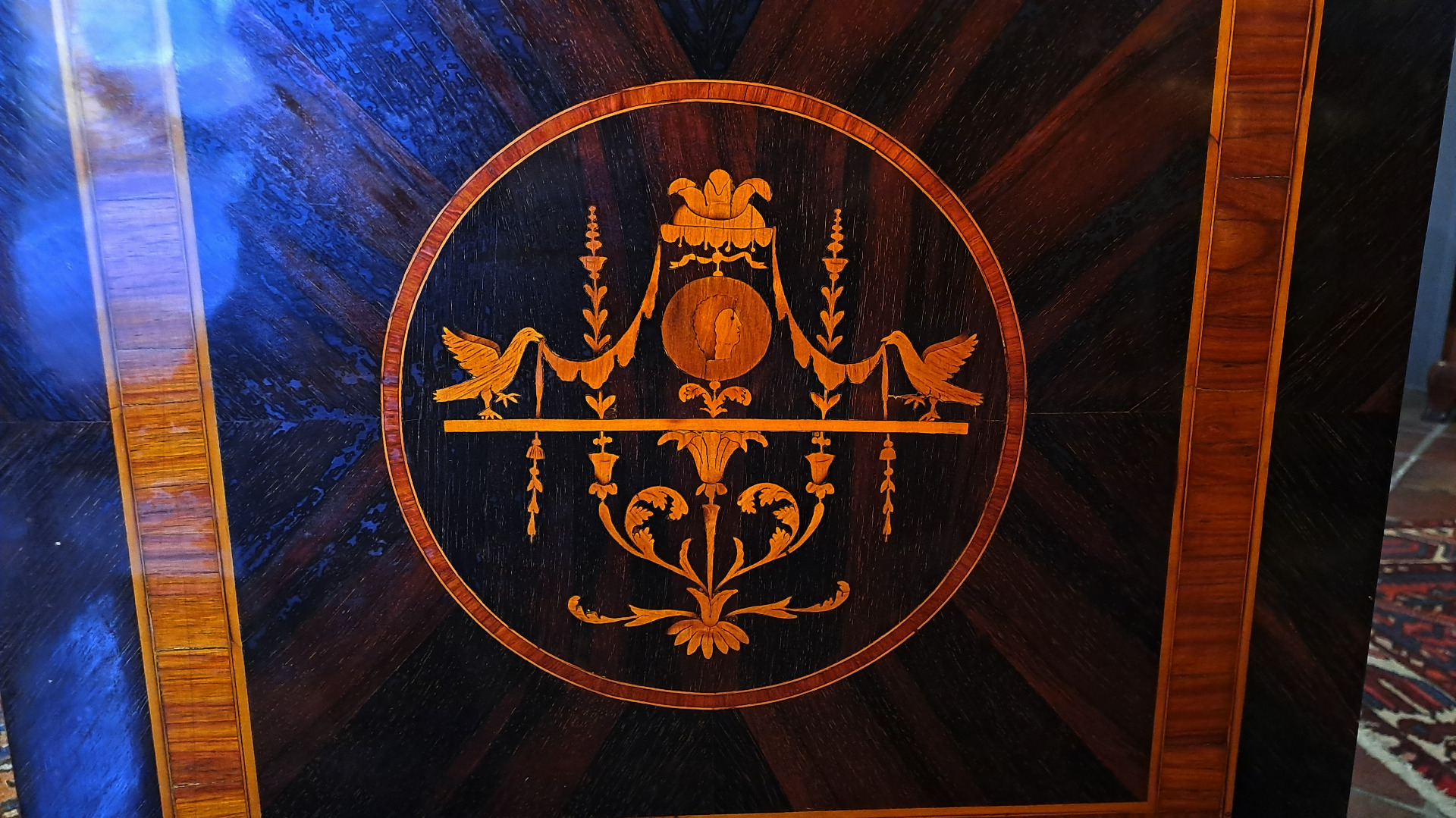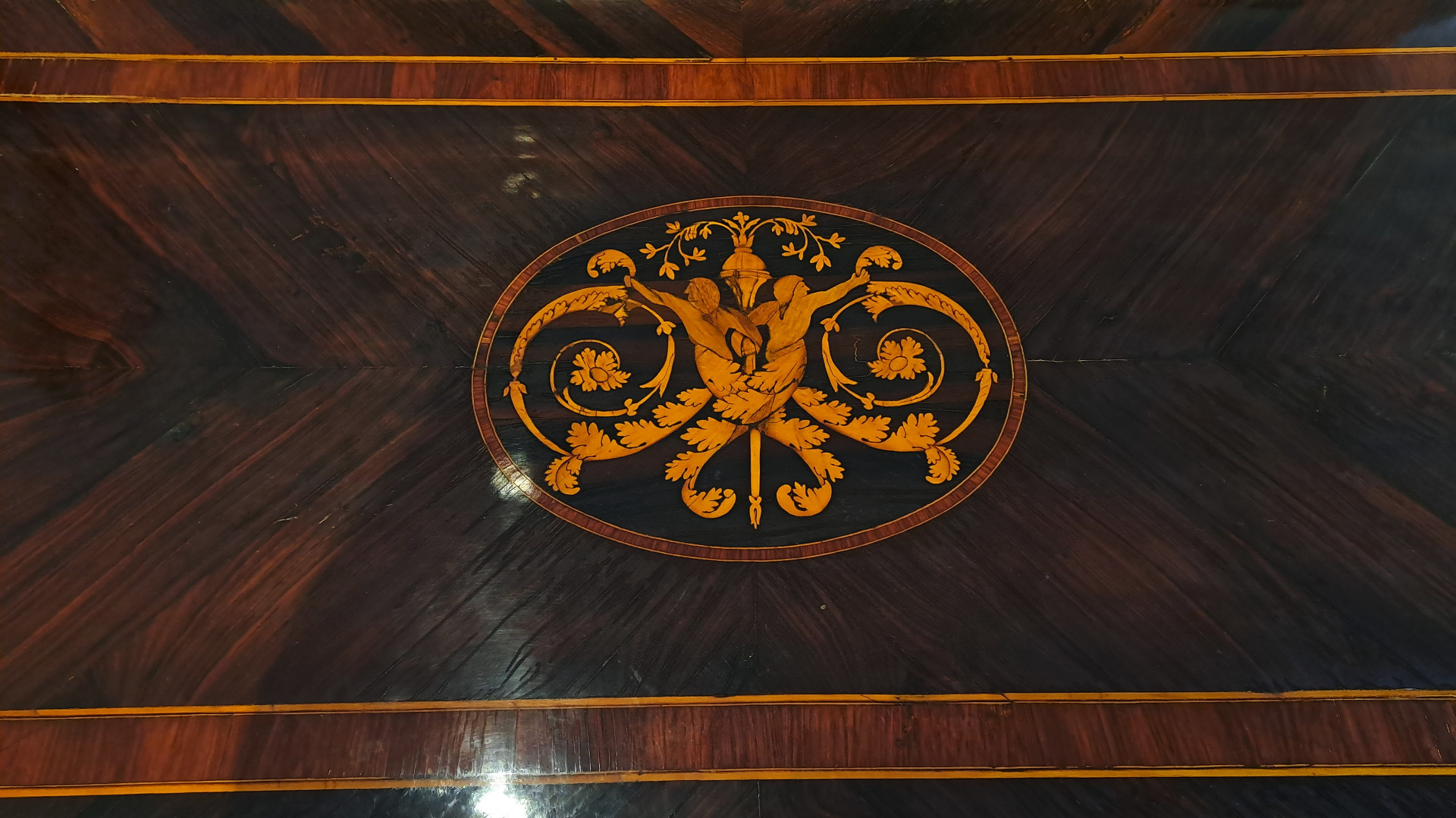 The entire surface is veneered in rosewood with herringbone grain and bois de rose fillets.