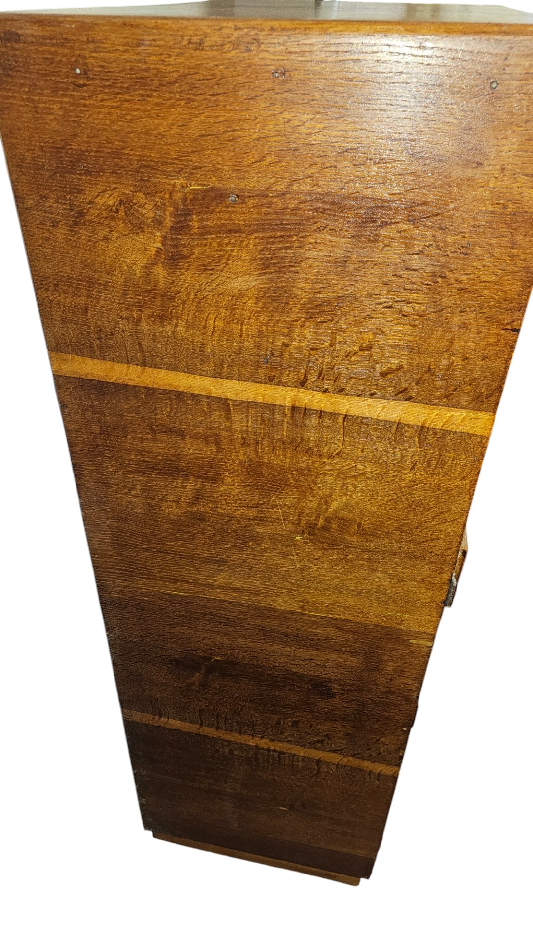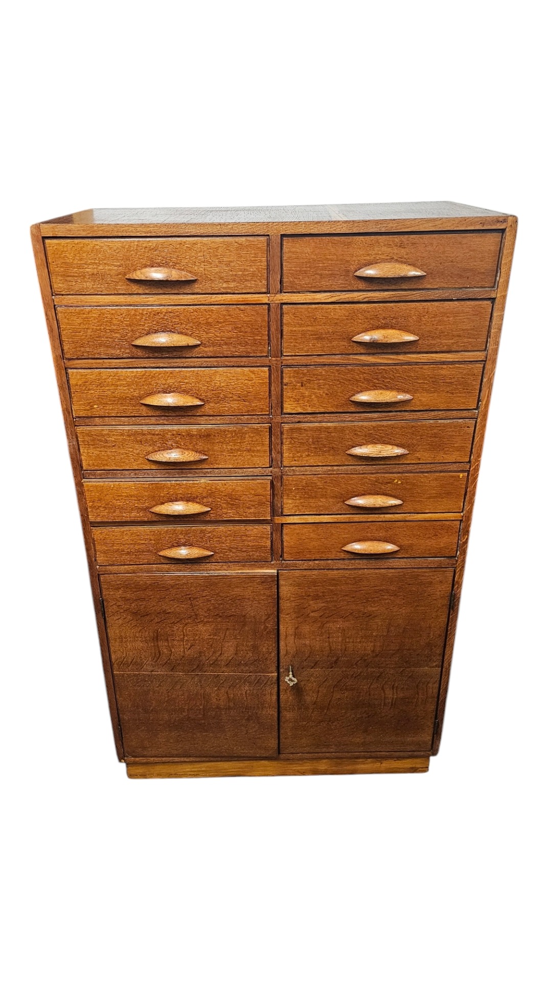 Beautiful office drawer unit from the 1950s in oak wood with original handles. The drawer fronts open downwards. Two hinges on the bottom door. Measures width eighty, depth forty, height one hundred and twenty-five. Restored.