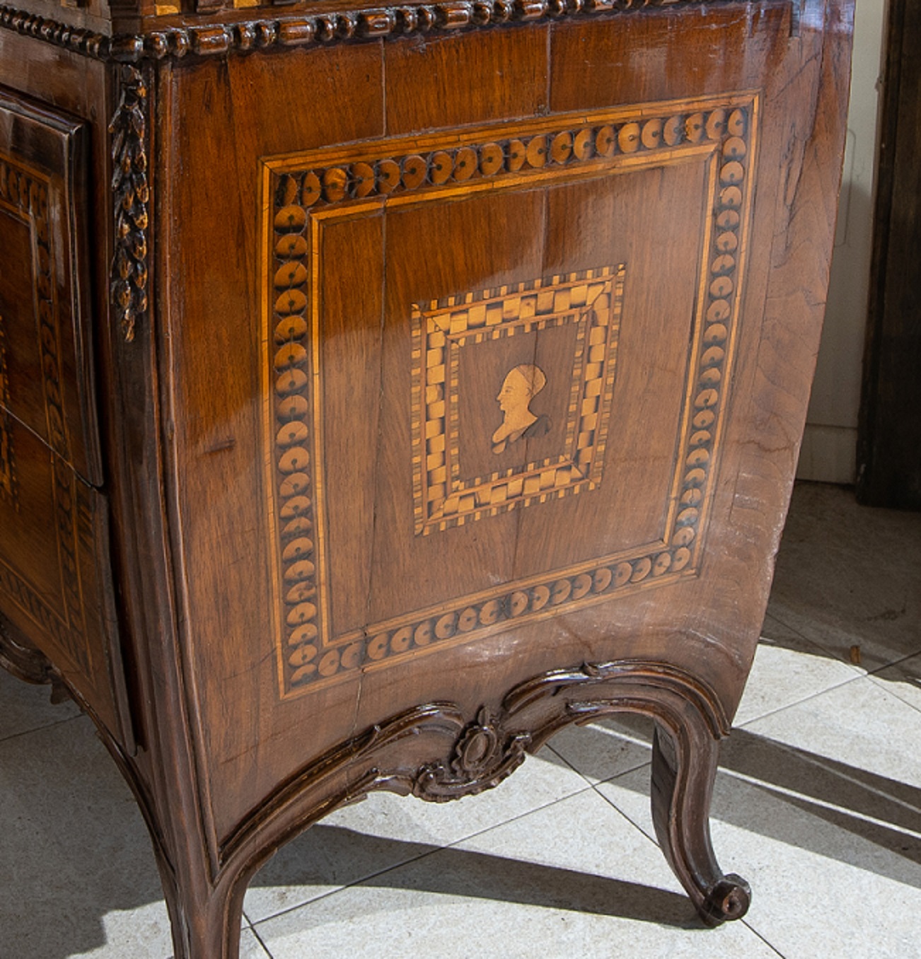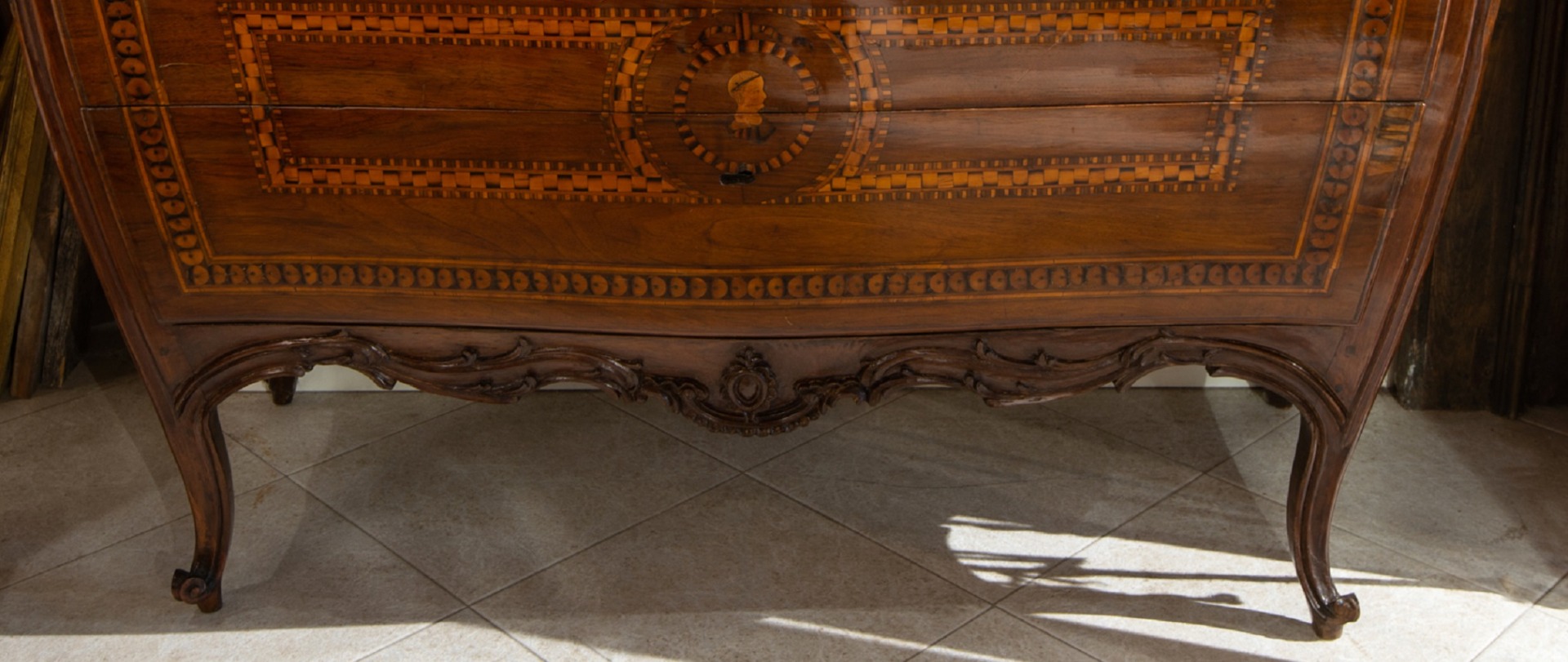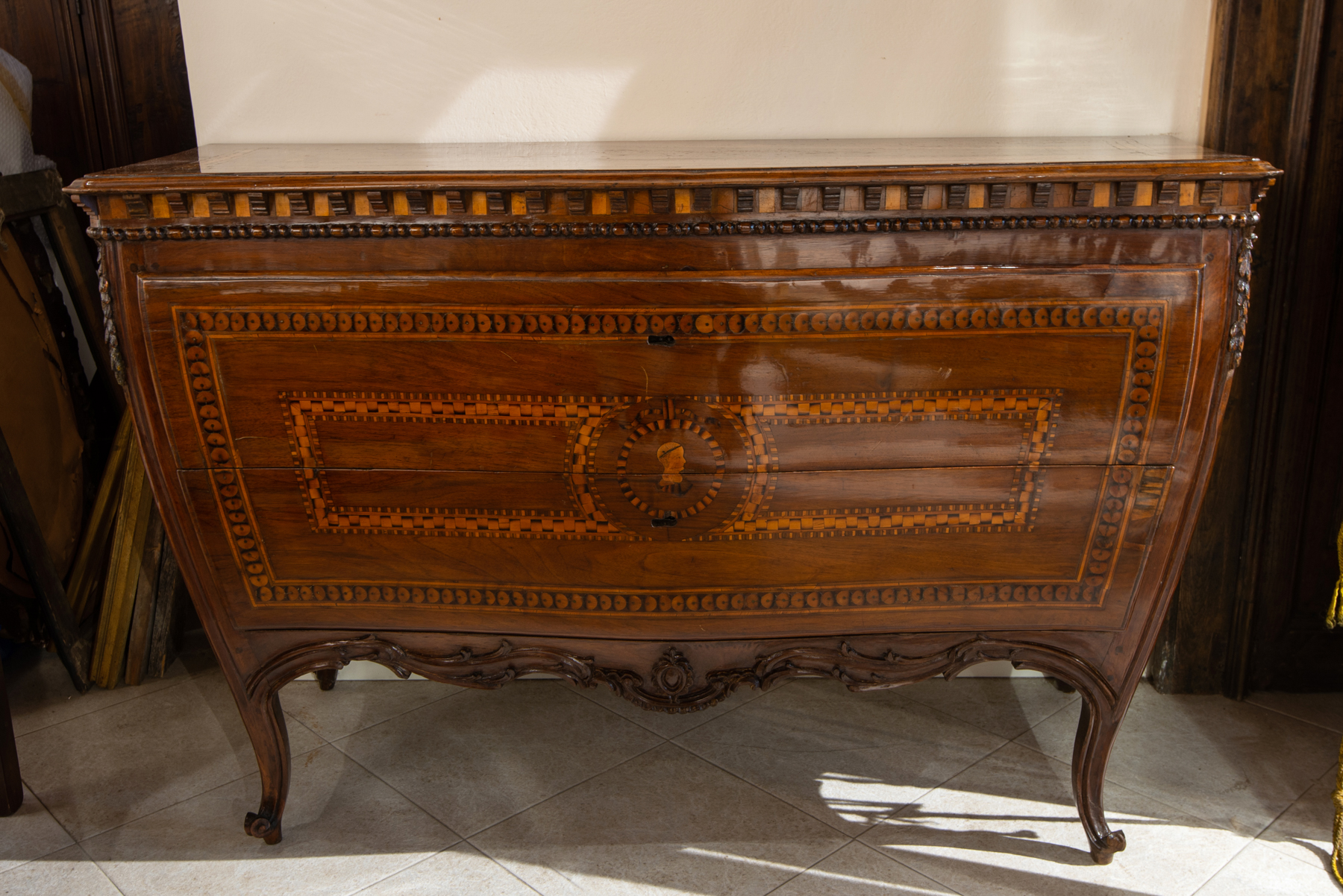 Piacenza chest of drawers with 2 drawers, carved and inlaid, curved on the front and sides - mid-18th century