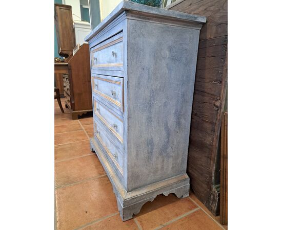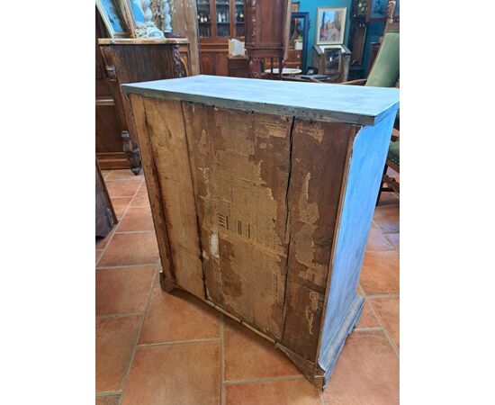 Piccolo comò cassettiera in noce laccato nei toni del celeste e del giallo ocra. Piacevolissima e delicata patina, misure inusuali: 83 x 39, altezza 93.