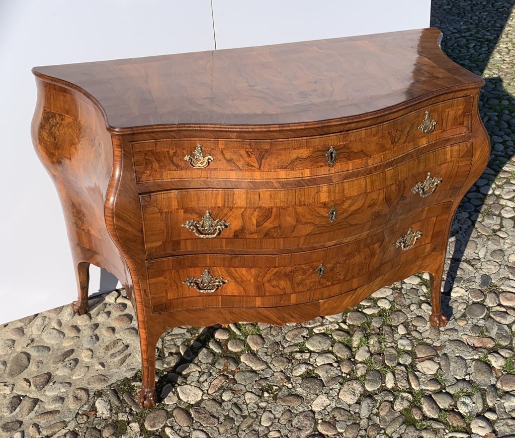 Serpentine chest of drawers veneered in walnut and walnut burl. Venetian, 18th century.