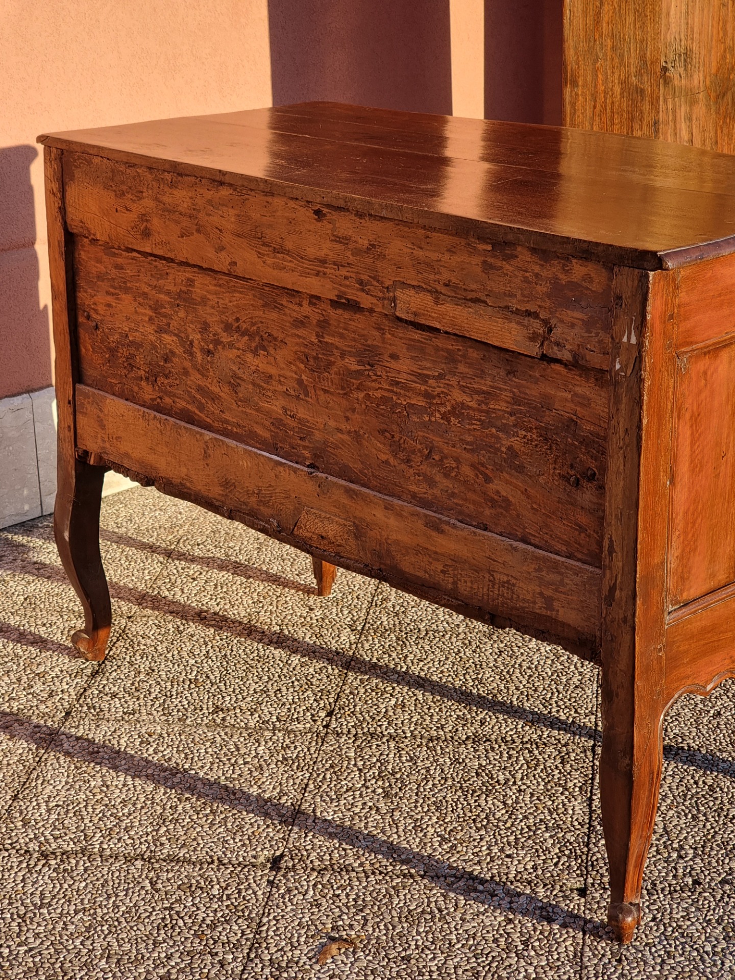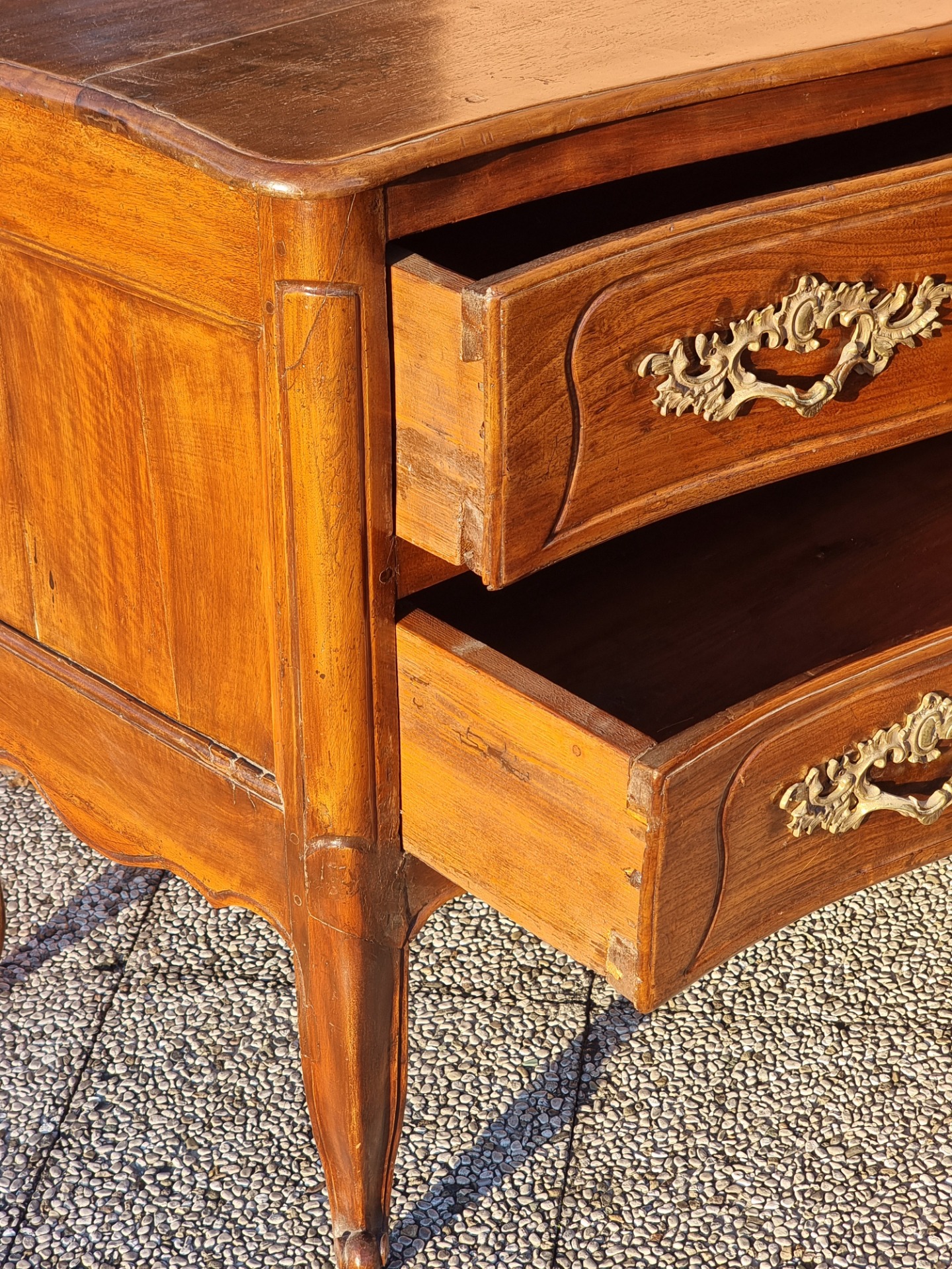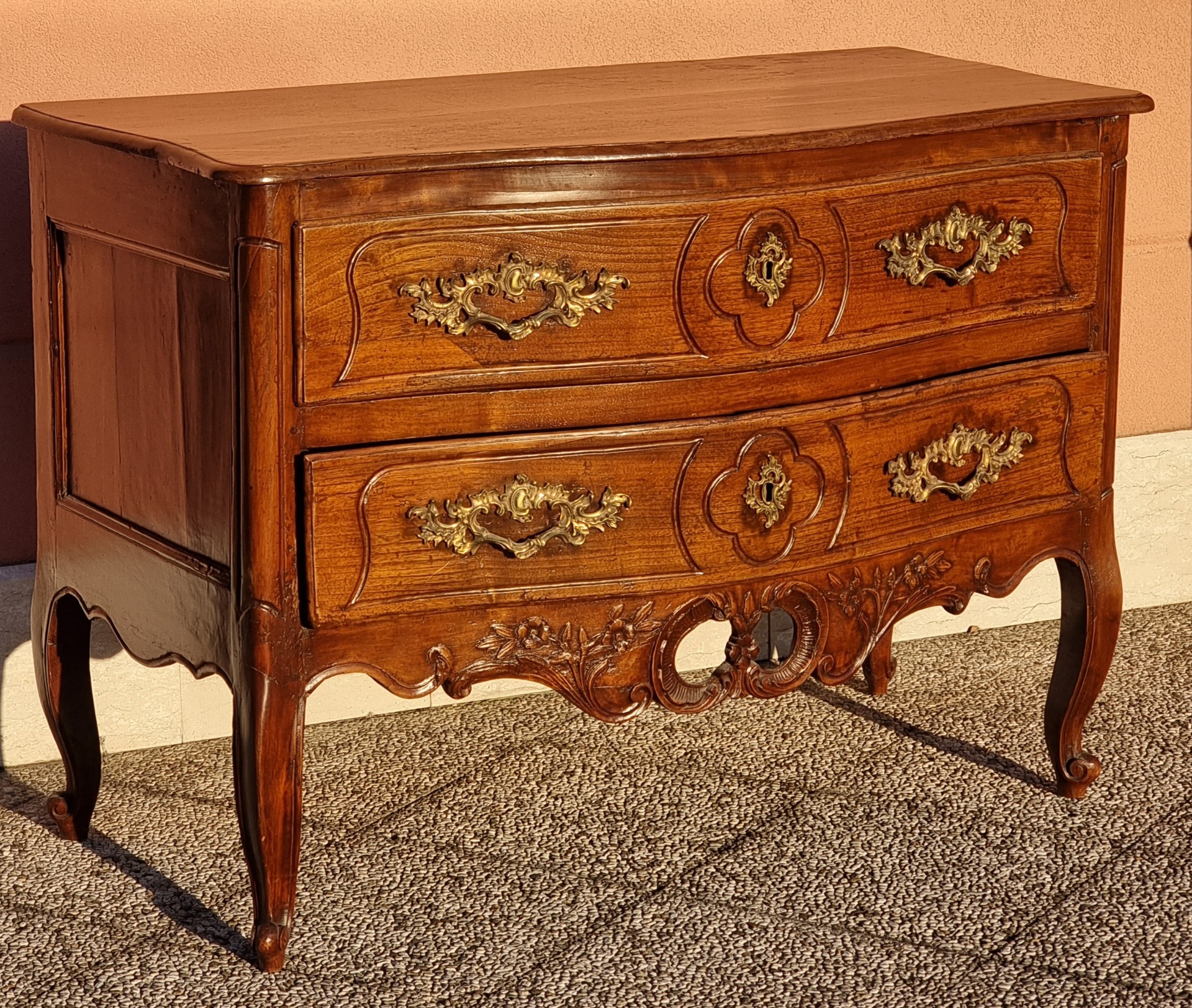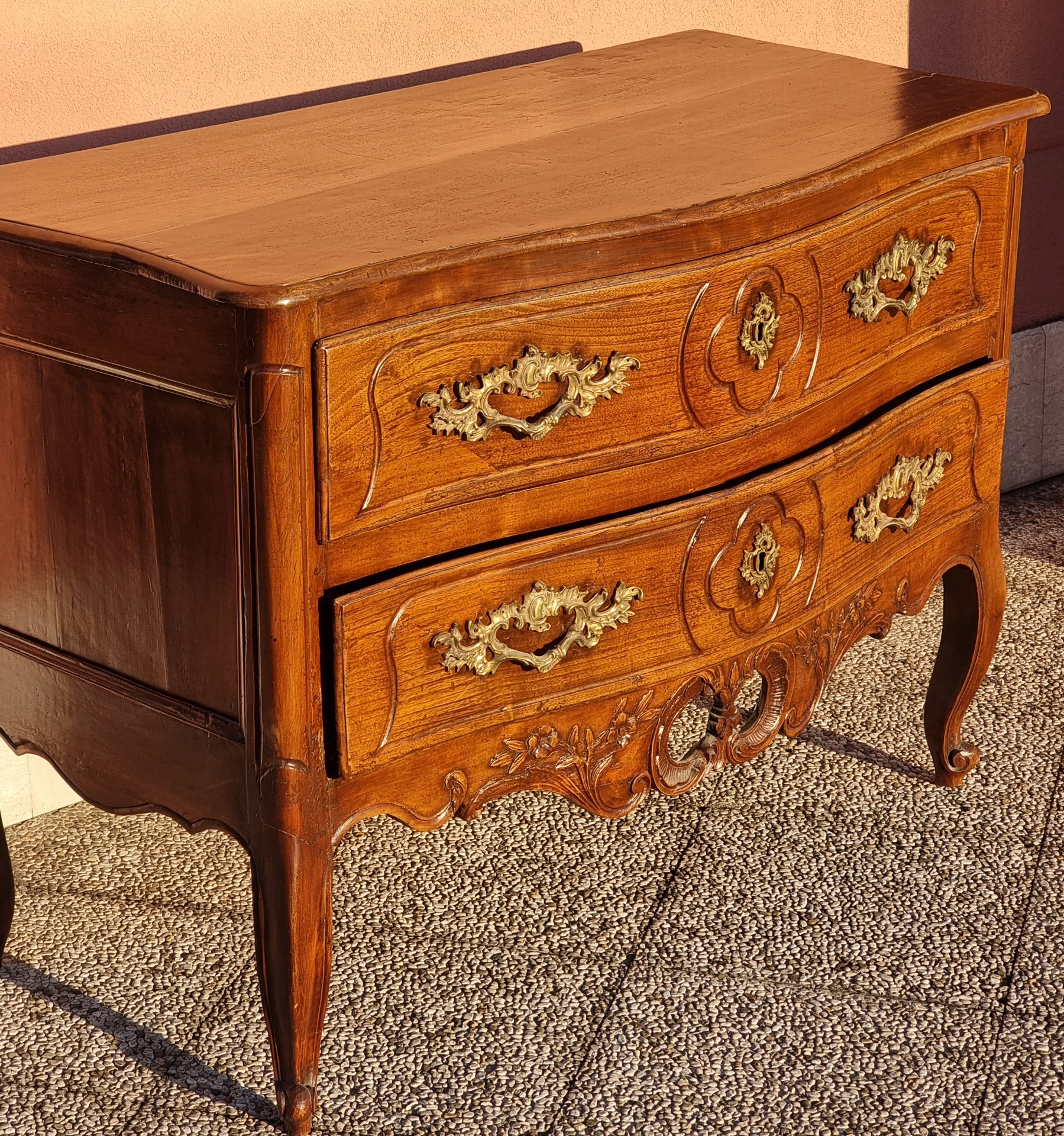 Refined Provençal walnut chest of drawers with a curved line and balanced proportions, datable to the 18th century. The front has two large curved drawers, framed by shaped moldings with reserves in a sinuous outline, typical of the southern French production of the time. The sides are slightly flared, giving the furniture an elegant lightness and a pleasant visual harmony. The lower crosspiece is richly carved with stylized vegetal and floral motifs, culminating in a central openwork element with a double volute. The finely chiseled handles and escutcheons in gilded bronze add a touch of light and refinement to the whole. The legs, expertly replaced during an old restoration, have been embedded and adapted to the original structure, preserving its overall aesthetics and stability. There is also a small restoration in the lower part of the front crosspiece. The warm and deep patina of the walnut, the result of time and use, enhances the natural grain of the wood and testifies to the long life of the furniture. This chest of drawers, solid and ready for furnishing, represents a perfect example of the sober and harmonious elegance of the 18th-century Provençal tradition, capable of combining functionality, decorative taste and craftsmanship. Dimensions: Width 121.5 cm × Depth 61 cm × Height 86 cm For further information, photos or technical details, please do not hesitate to contact us. Worldwide shipping available with professional packaging.
