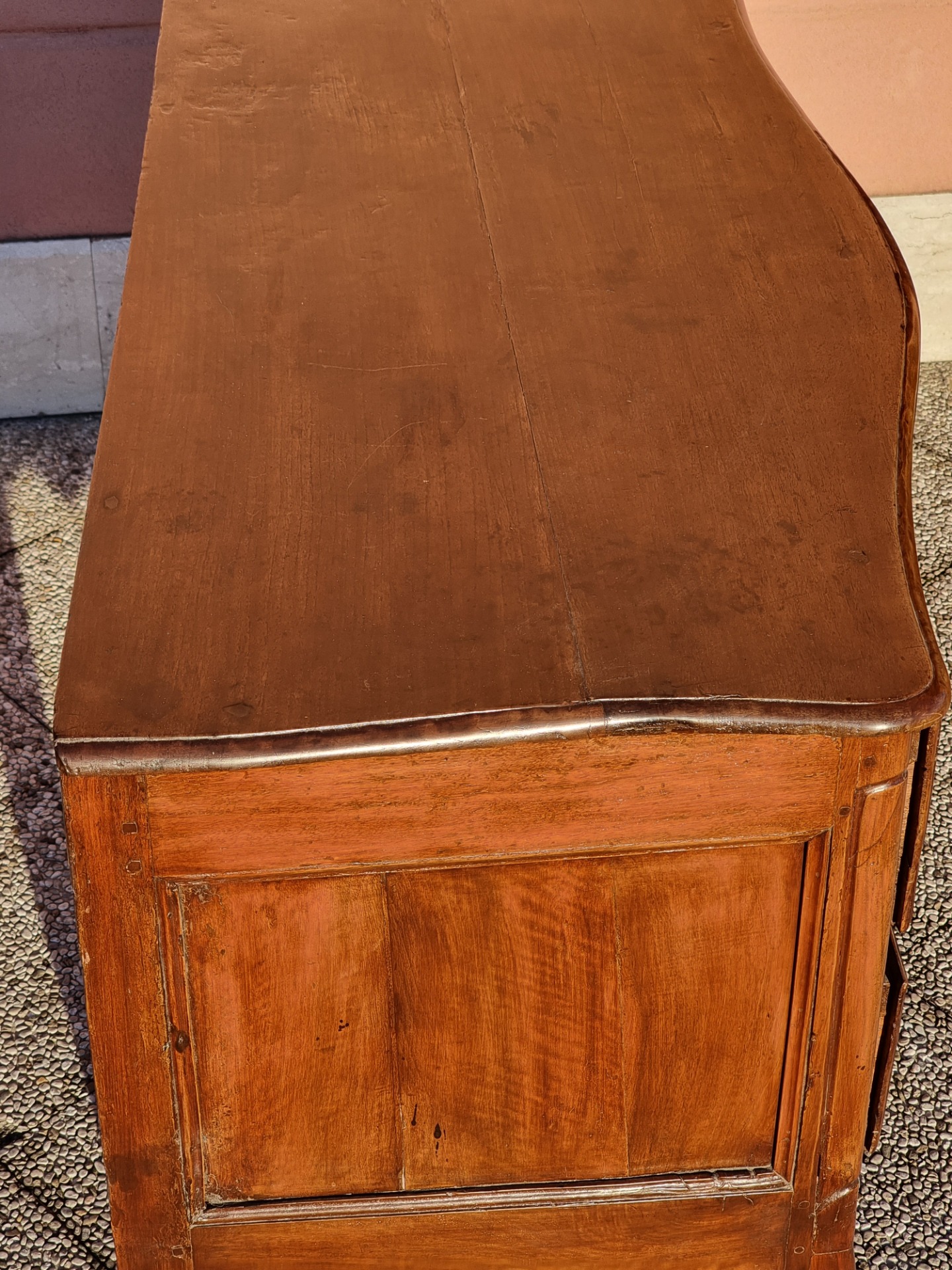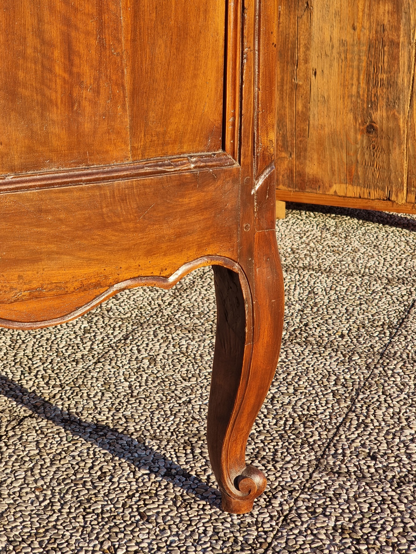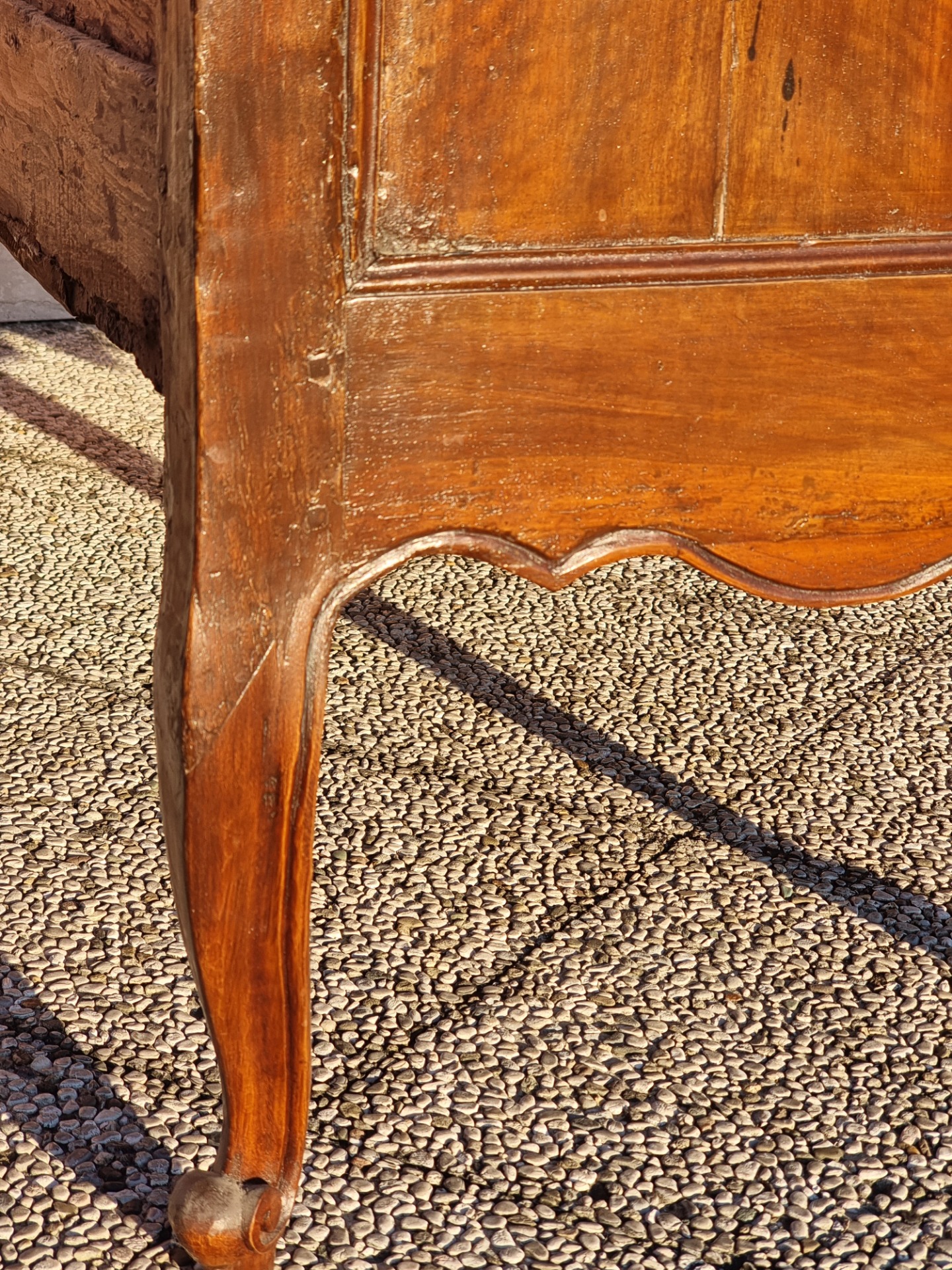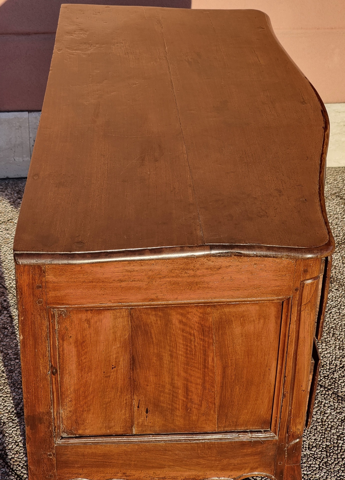 Refined Provençal walnut chest of drawers with a curved line and balanced proportions, datable to the 18th century. The front has two large curved drawers, framed by shaped moldings with reserves in a sinuous outline, typical of the southern French production of the time. The sides are slightly flared, giving the furniture an elegant lightness and a pleasant visual harmony. The lower crosspiece is richly carved with stylized vegetal and floral motifs, culminating in a central openwork element with a double volute. The finely chiseled handles and escutcheons in gilded bronze add a touch of light and refinement to the whole. The legs, expertly replaced during an old restoration, have been embedded and adapted to the original structure, preserving its overall aesthetics and stability. There is also a small restoration in the lower part of the front crosspiece. The warm and deep patina of the walnut, the result of time and use, enhances the natural grain of the wood and testifies to the long life of the furniture. This chest of drawers, solid and ready for furnishing, represents a perfect example of the sober and harmonious elegance of the 18th-century Provençal tradition, capable of combining functionality, decorative taste and craftsmanship. Dimensions: Width 121.5 cm × Depth 61 cm × Height 86 cm For further information, photos or technical details, please do not hesitate to contact us. Worldwide shipping available with professional packaging.