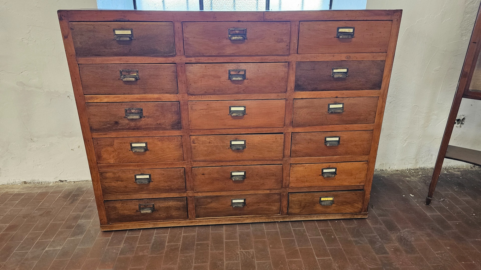 Beautiful shop chest of drawers. Made of beech wood with 15 drawers. Measures 1 m 50 wide, 40 deep, 130 high. Early 20th century, restored.