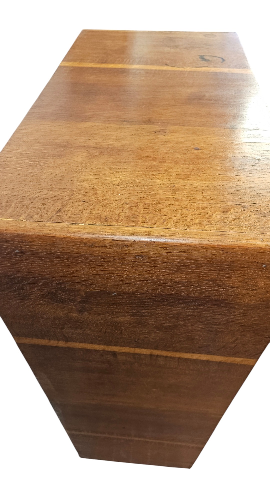 Beautiful chest of drawers. Made of oak with flip-down drawers. Two doors at the bottom. It measures eighty in width, forty in depth, and one hundred and thirty in height. 1950s