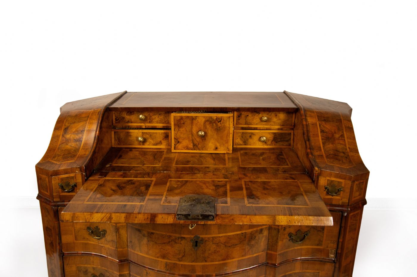 Walnut and burr walnut veneered drop-front chest of drawers, Verona, 18th century, serpentine front with three drawers separated by crosspieces and decorated with burr panels within thin frames. Wide lateral shoulders with two drawers underneath, shaped and drop-front concealing five small drawers inside. Bracket feet, cm 108x150x67