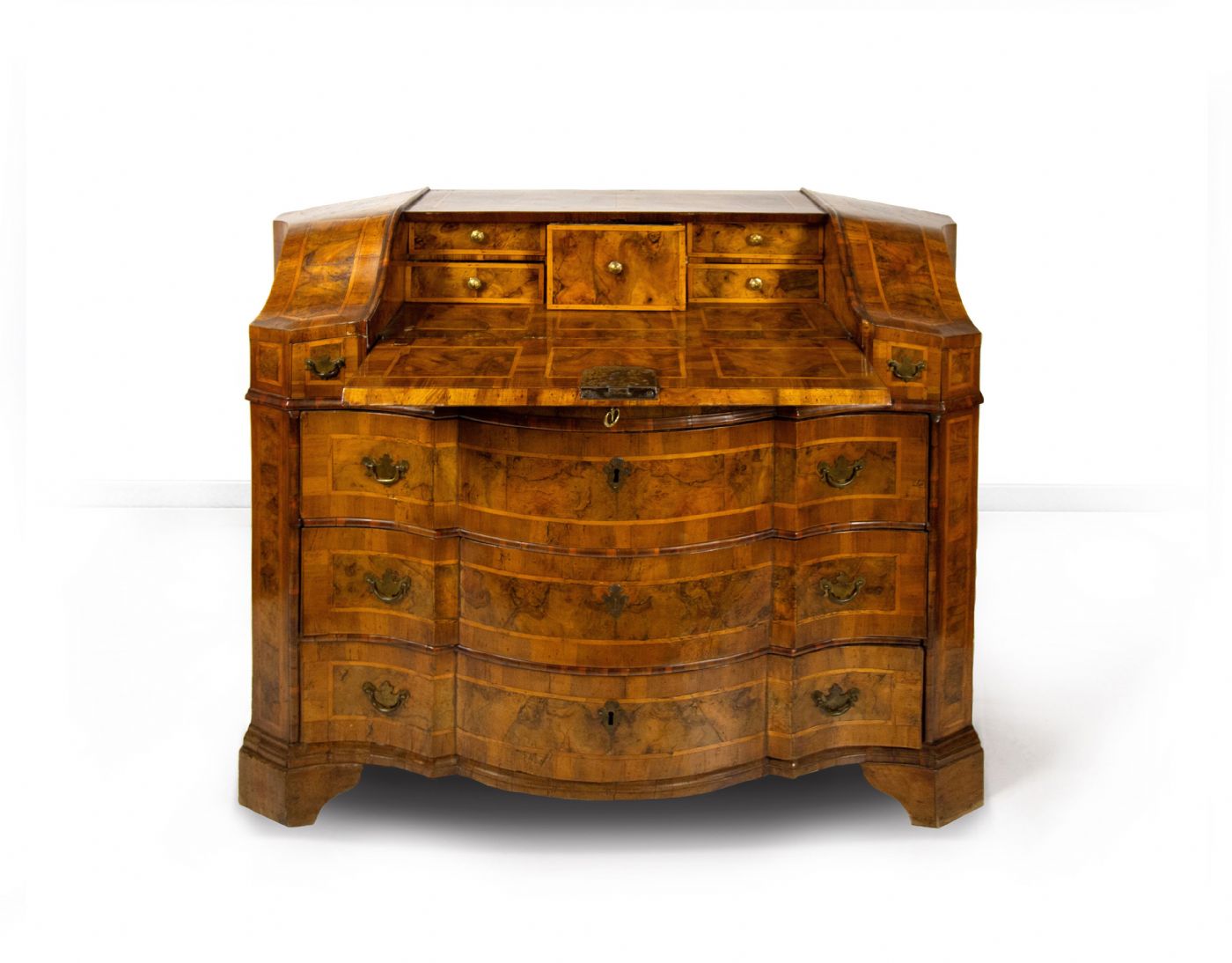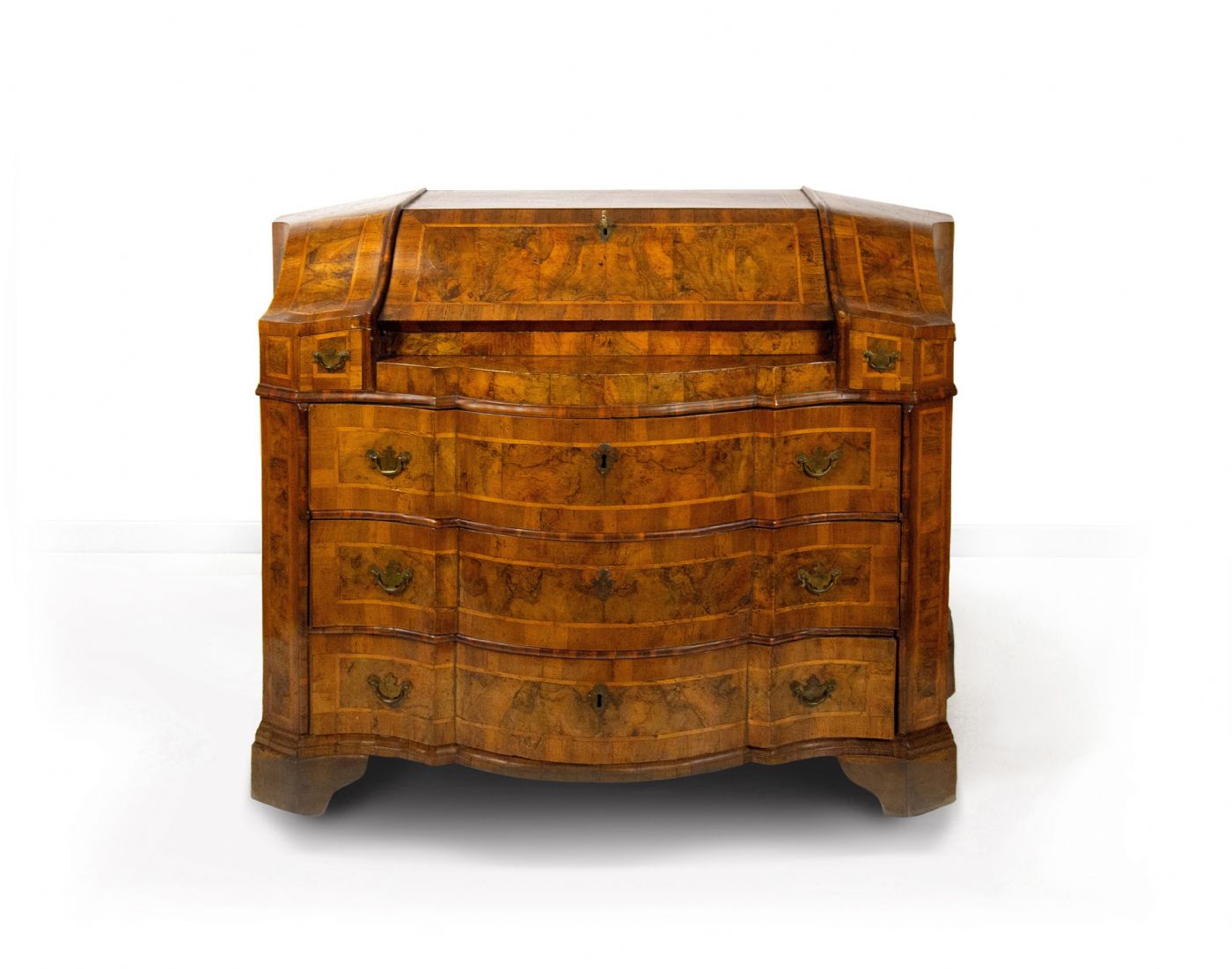 Walnut and burr walnut veneered drop-front chest of drawers, Verona, 18th century, serpentine front with three drawers separated by crosspieces and decorated with burr panels within thin frames. Wide lateral shoulders with two drawers underneath, shaped and drop-front concealing five small drawers inside. Bracket feet, cm 108x150x67