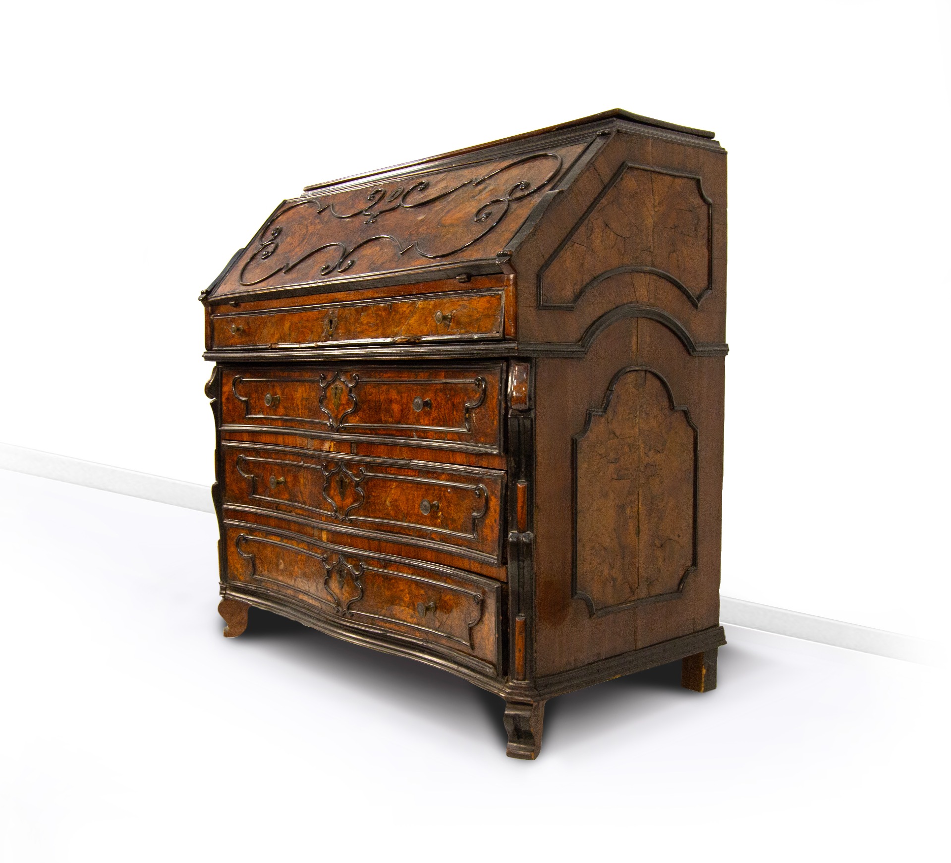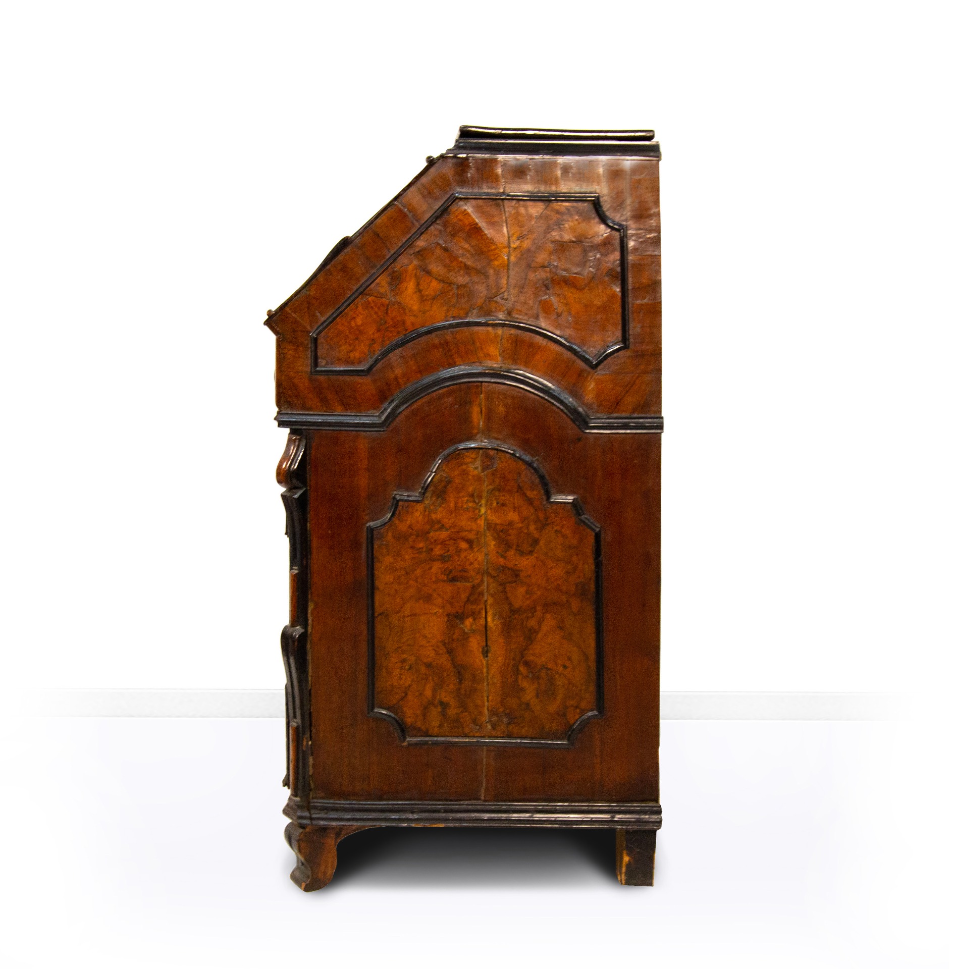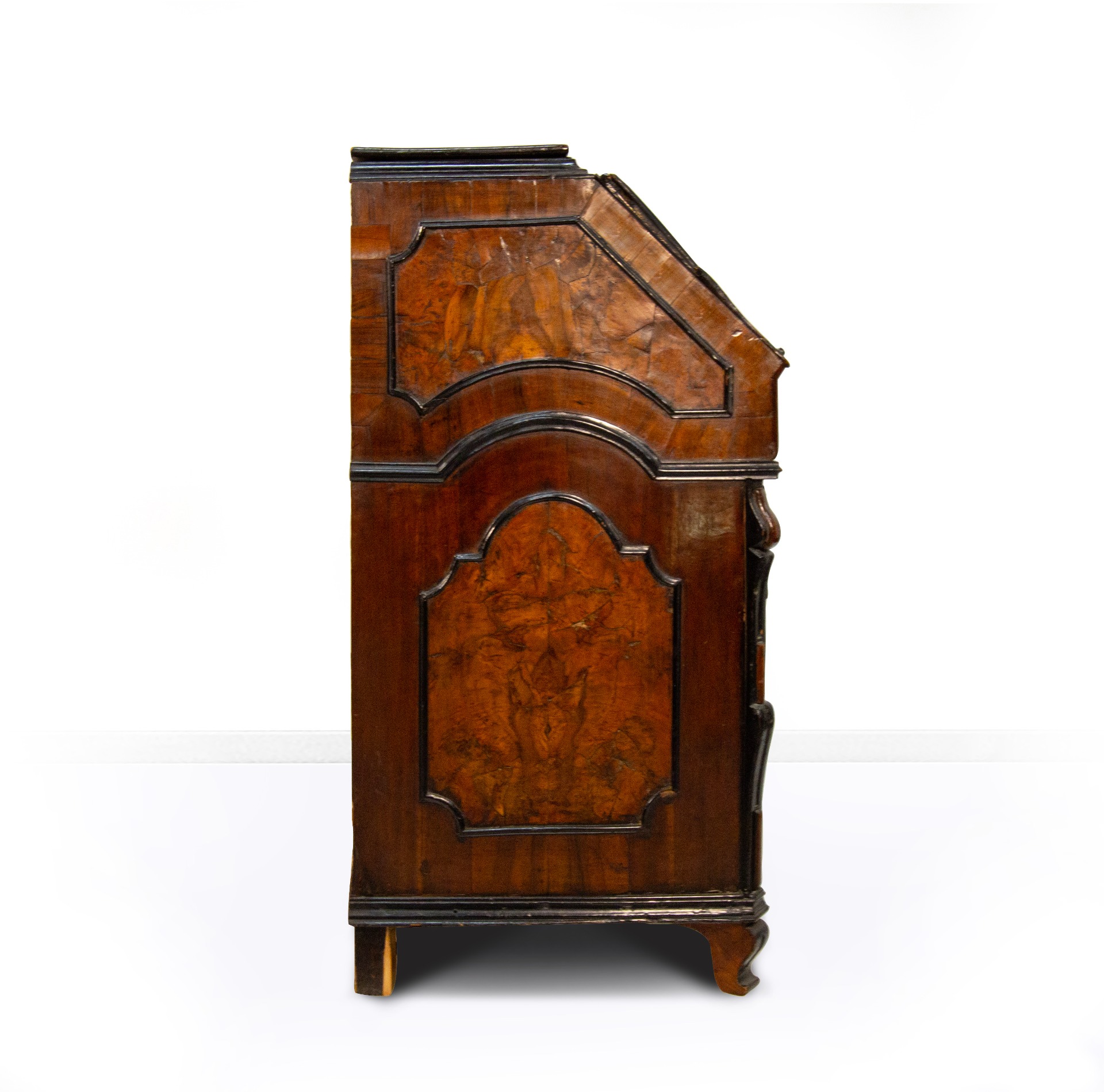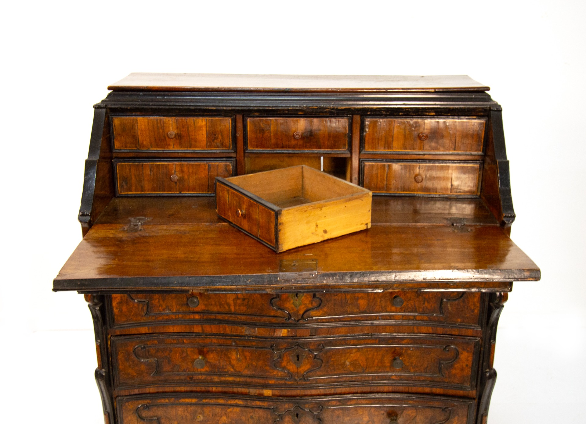 Walnut burl veneered slant-front chest of drawers, Lombardy, 18th century, slightly curved front with three drawers separated by crosspieces and decorated with panels within ebonized wood frames centering a cartouche motif. The drop-front, adorned with an ebonized wood frame depicting a motif of volutes and curls, has a drawer underneath and six small drawers inside. Double volute pilasters and shaped corbel feet, cm 111x108x58