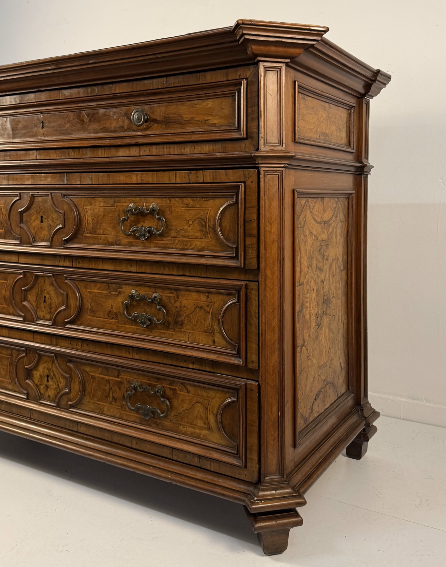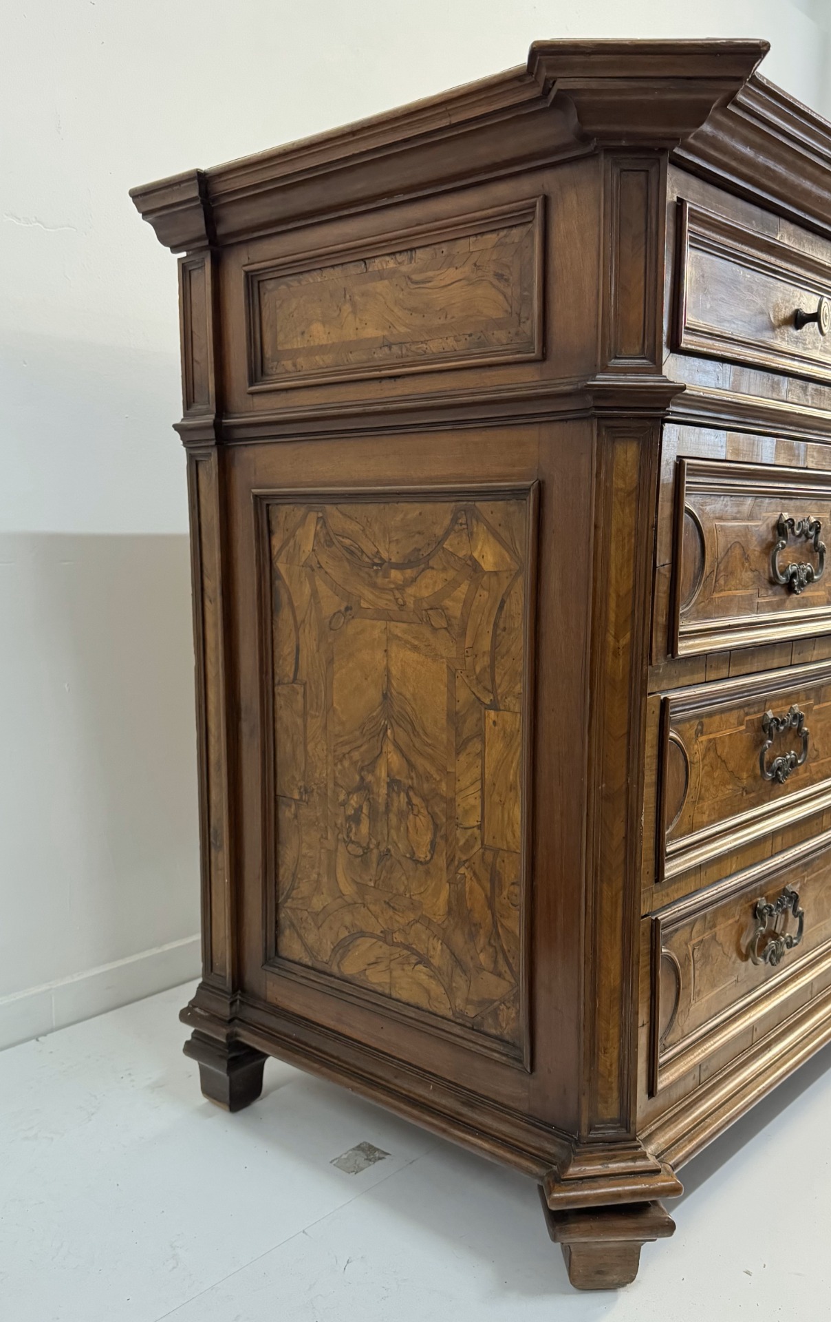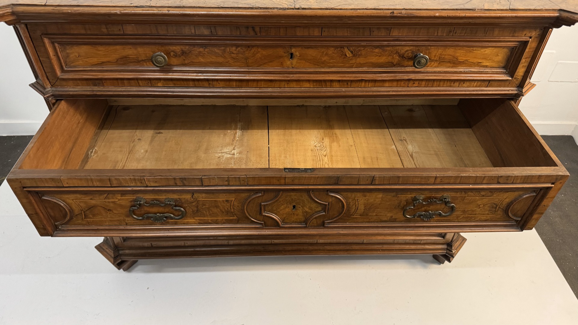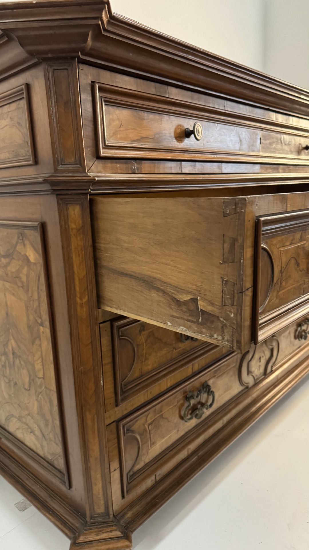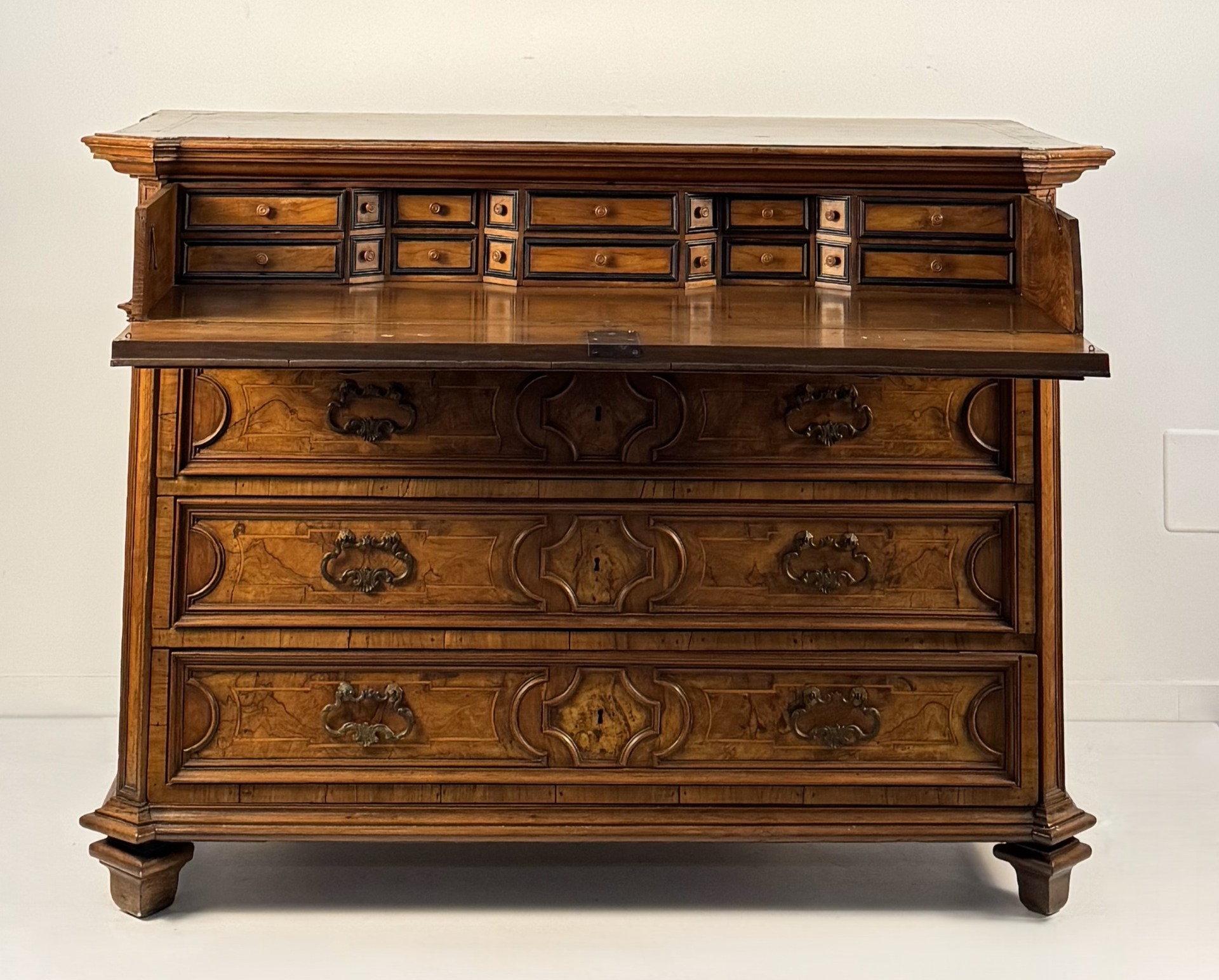 Walnut chest of drawers, partly veneered in walnut, late 17th century, front with four drawers separated by crosspieces and decorated with burr panels within curved profiles. The first drop-front drawer conceals seventeen small drawers inside. Top with rounded corners, pointed feet, 109x154x68 cm