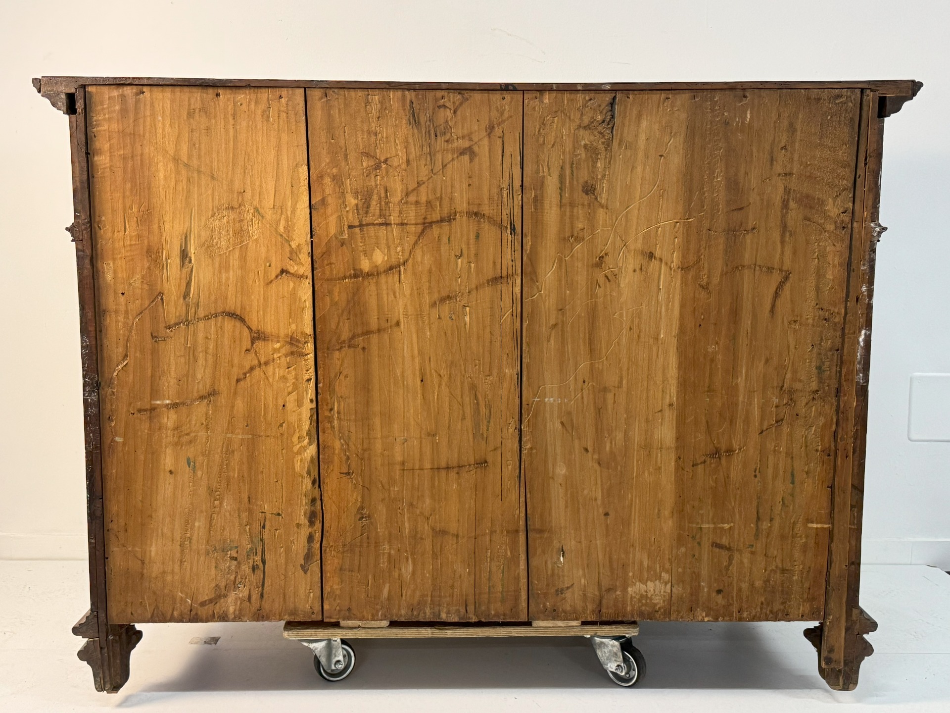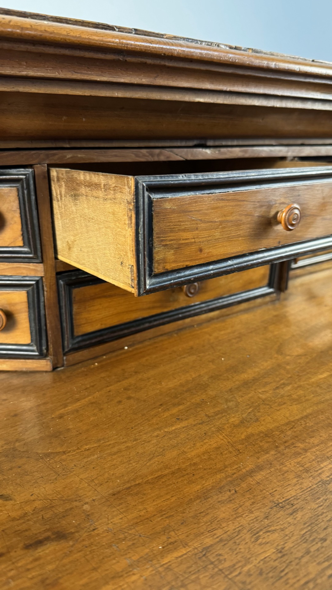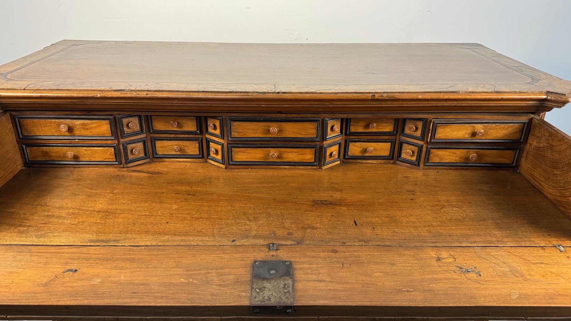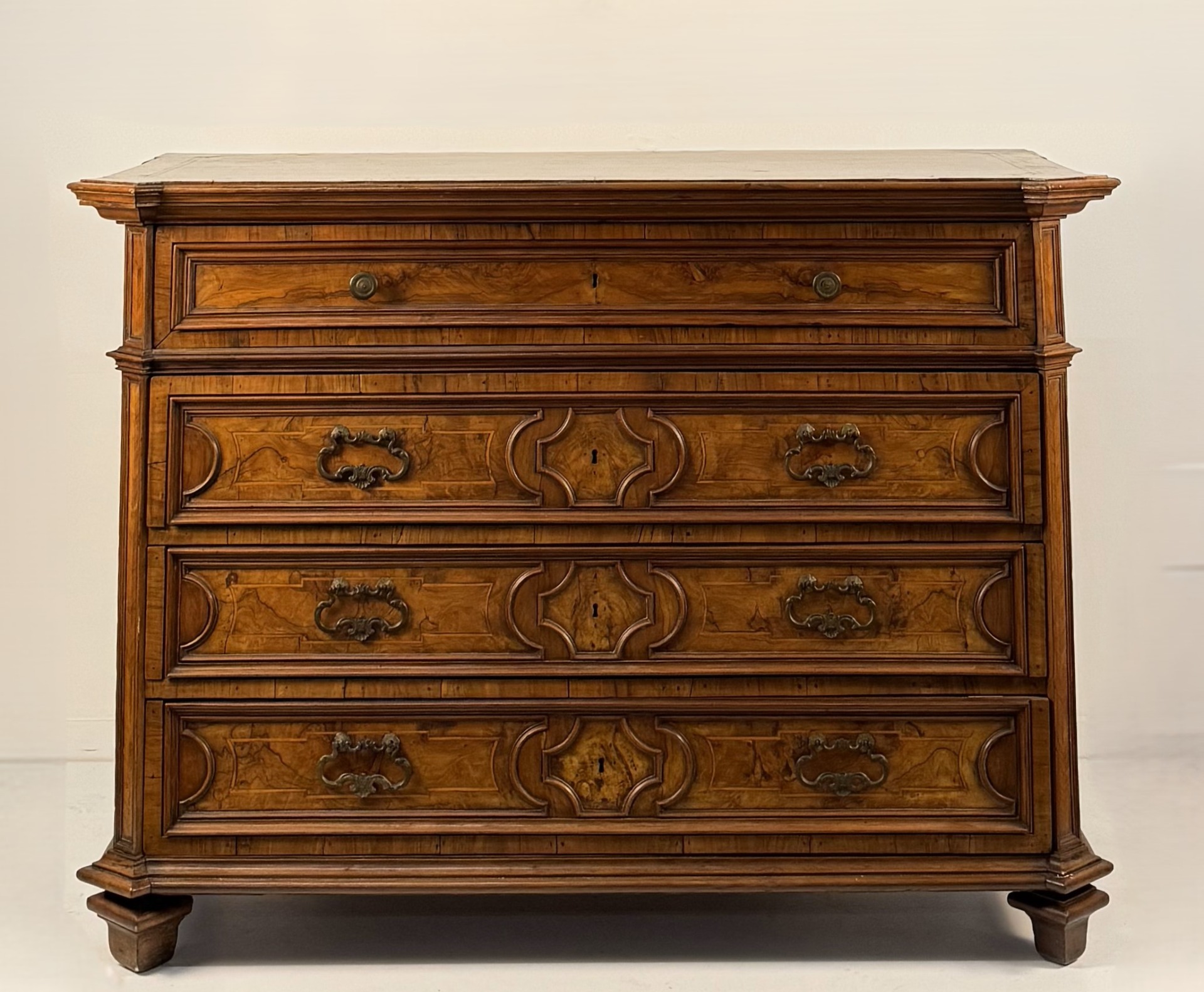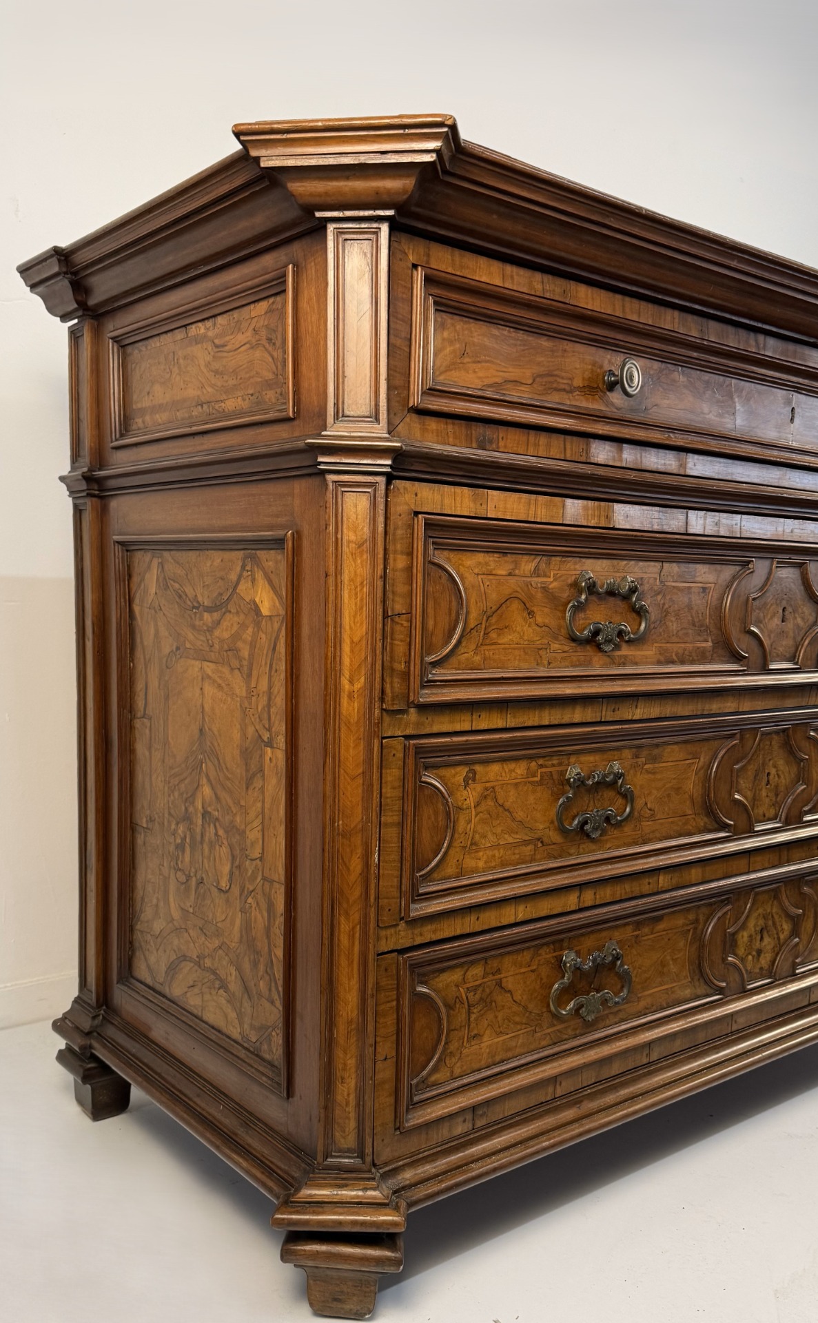 Walnut chest of drawers, partly veneered in walnut, late 17th century, front with four drawers separated by crosspieces and decorated with burr panels within curved profiles. The first drop-front drawer conceals seventeen small drawers inside. Top with rounded corners, pointed feet, 109x154x68 cm