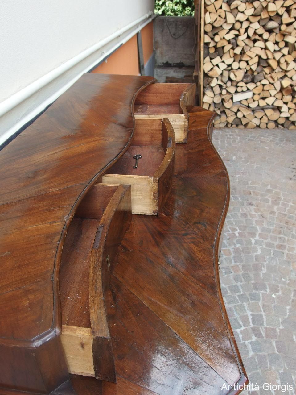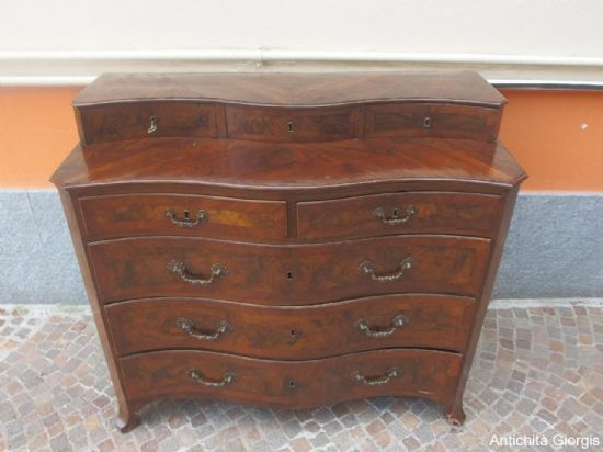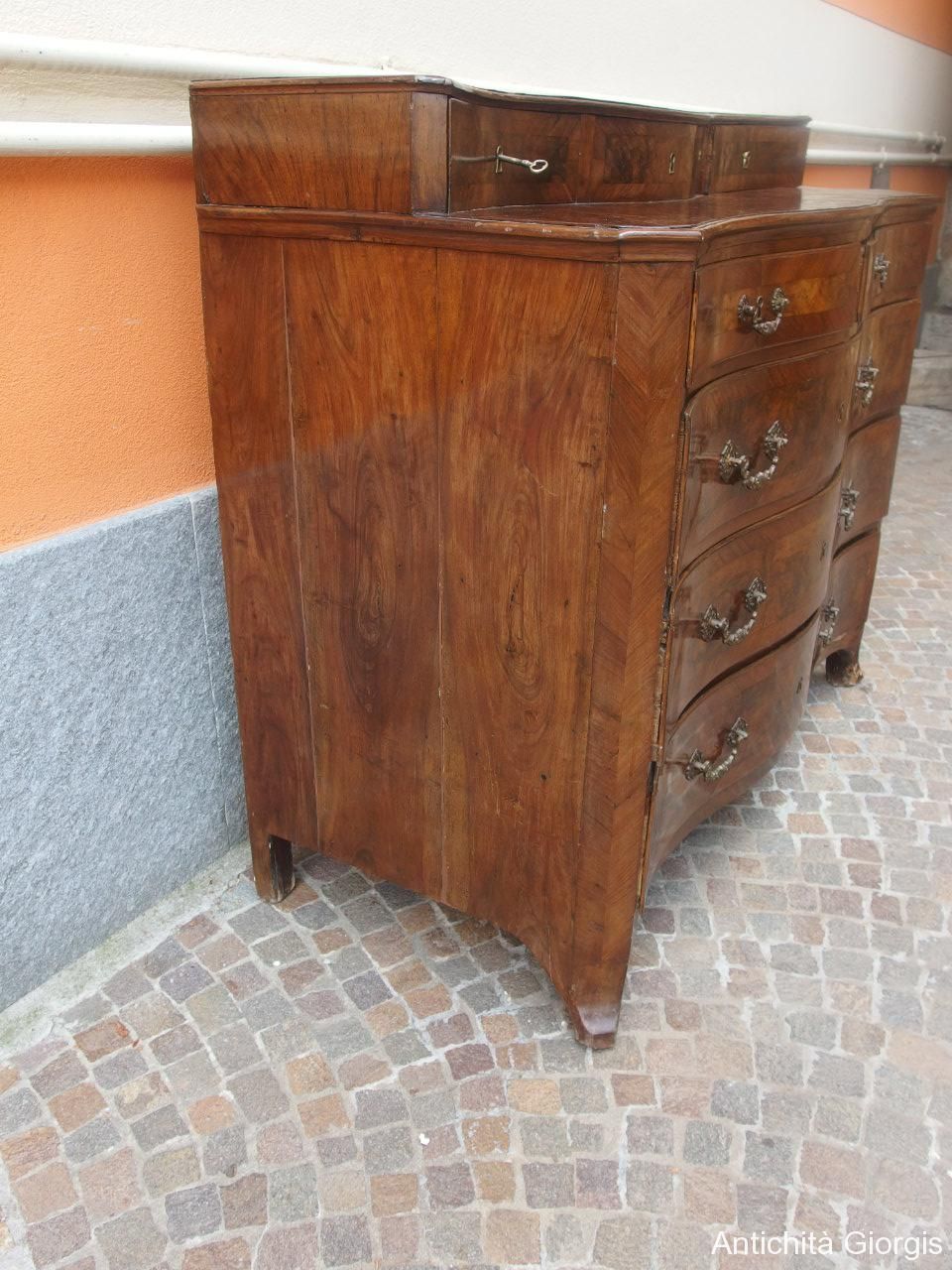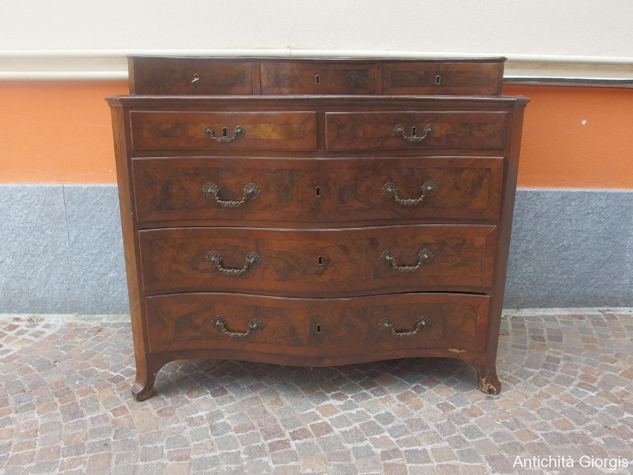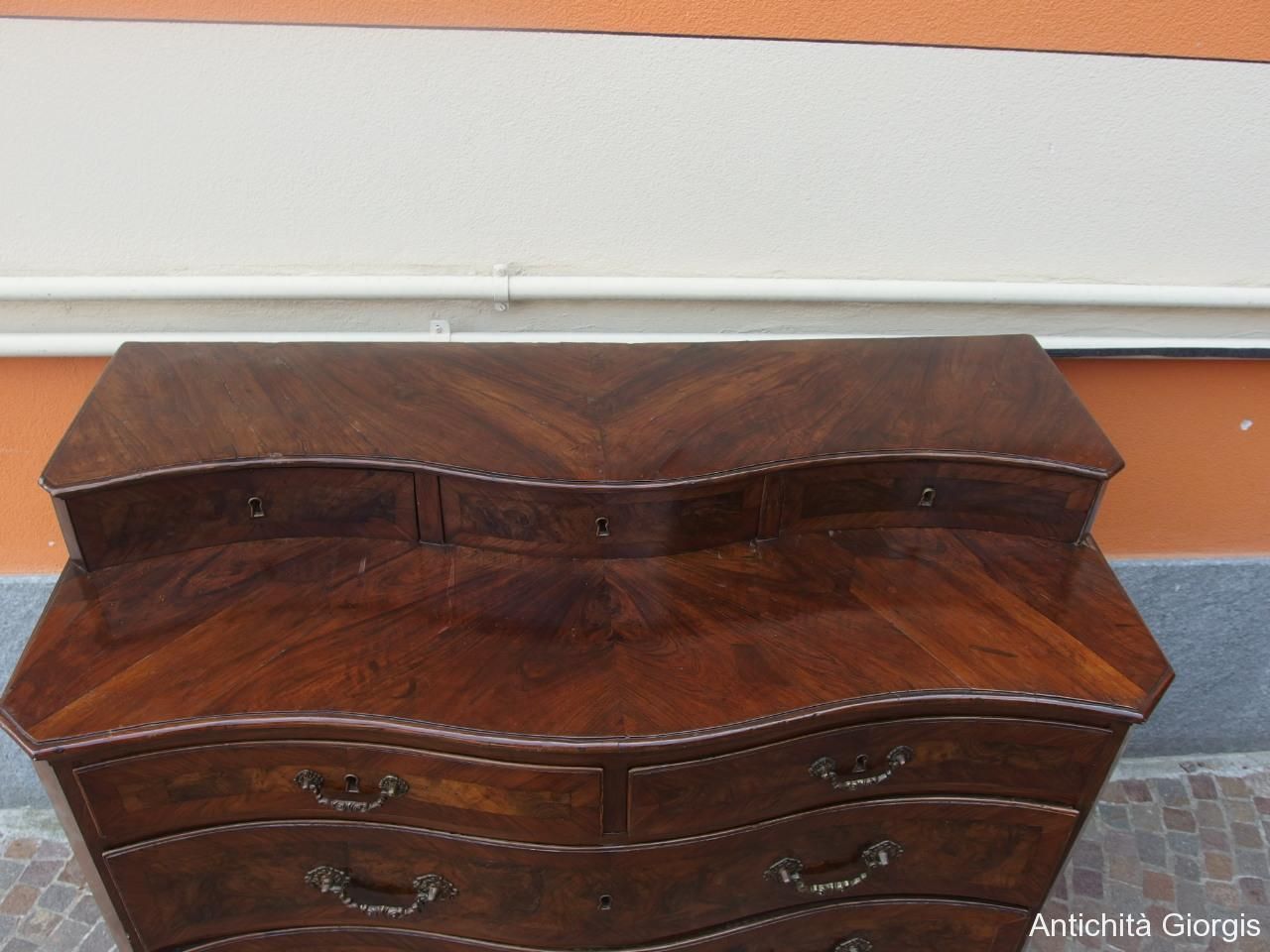 Beautiful walnut veneered chest of drawers from the late 18th century, of Venetian origin. The chest of drawers is completely original in all its parts and requires restoration, see photos. SEE PHOTOS. Dimensions: cm L126xP58xH98