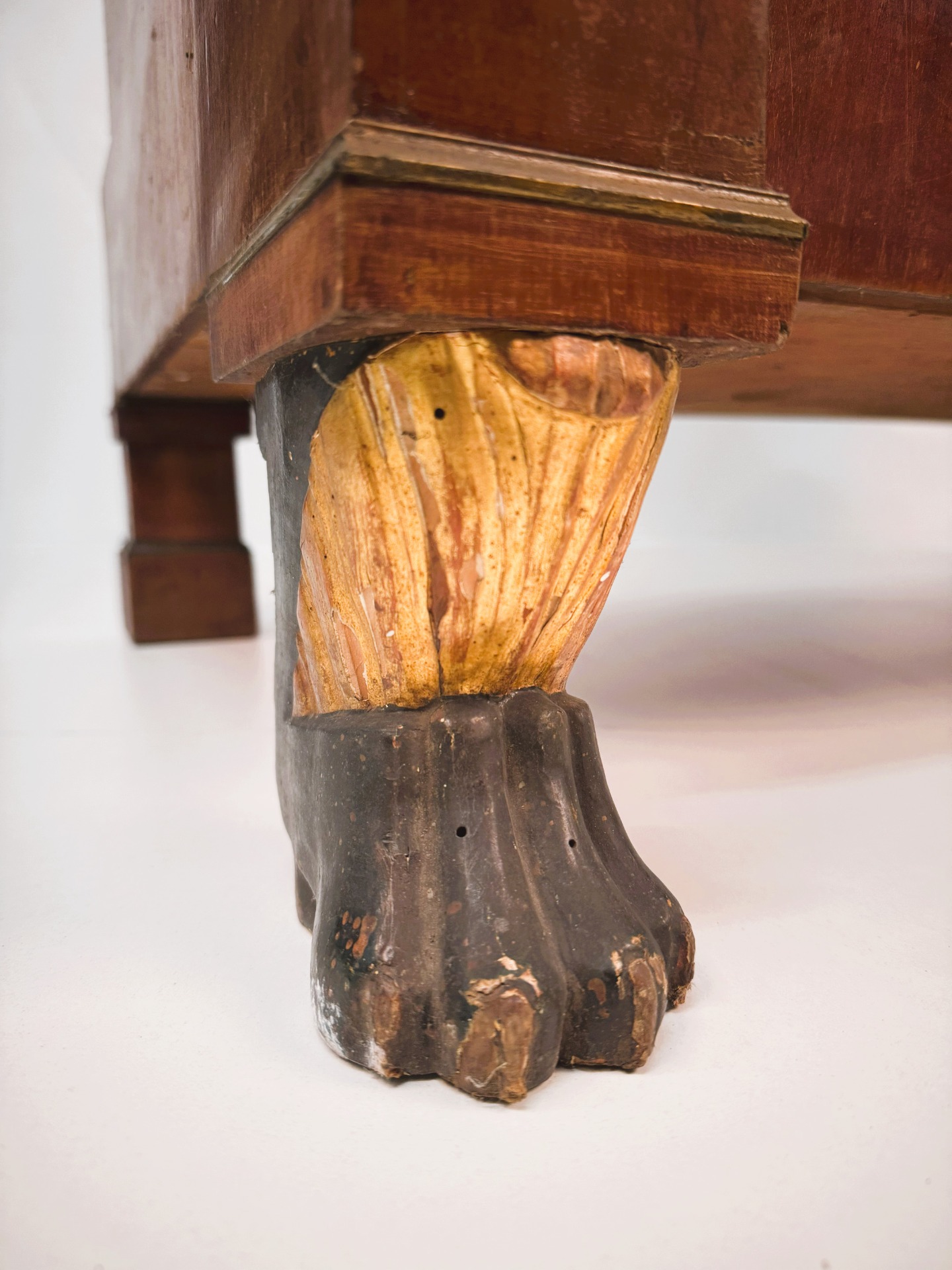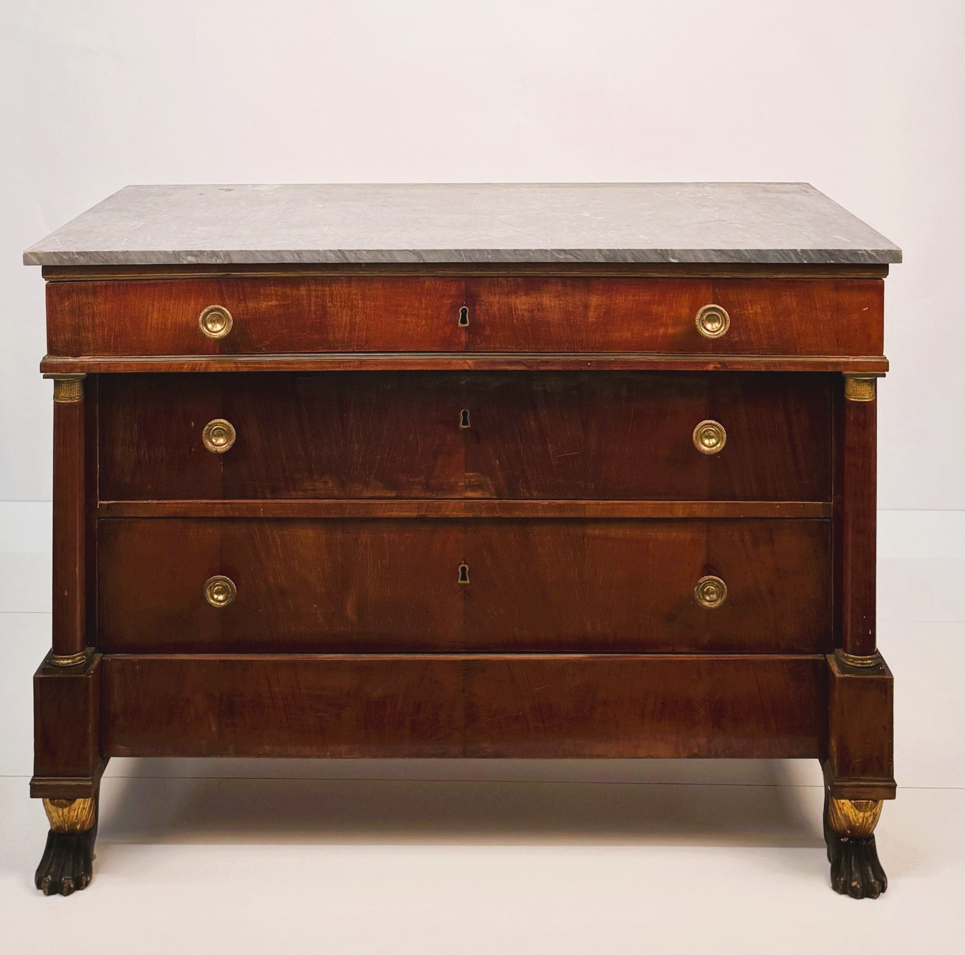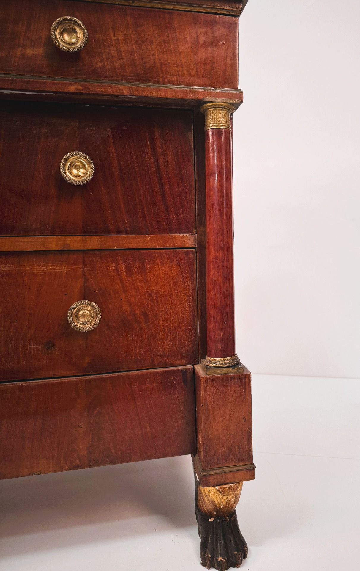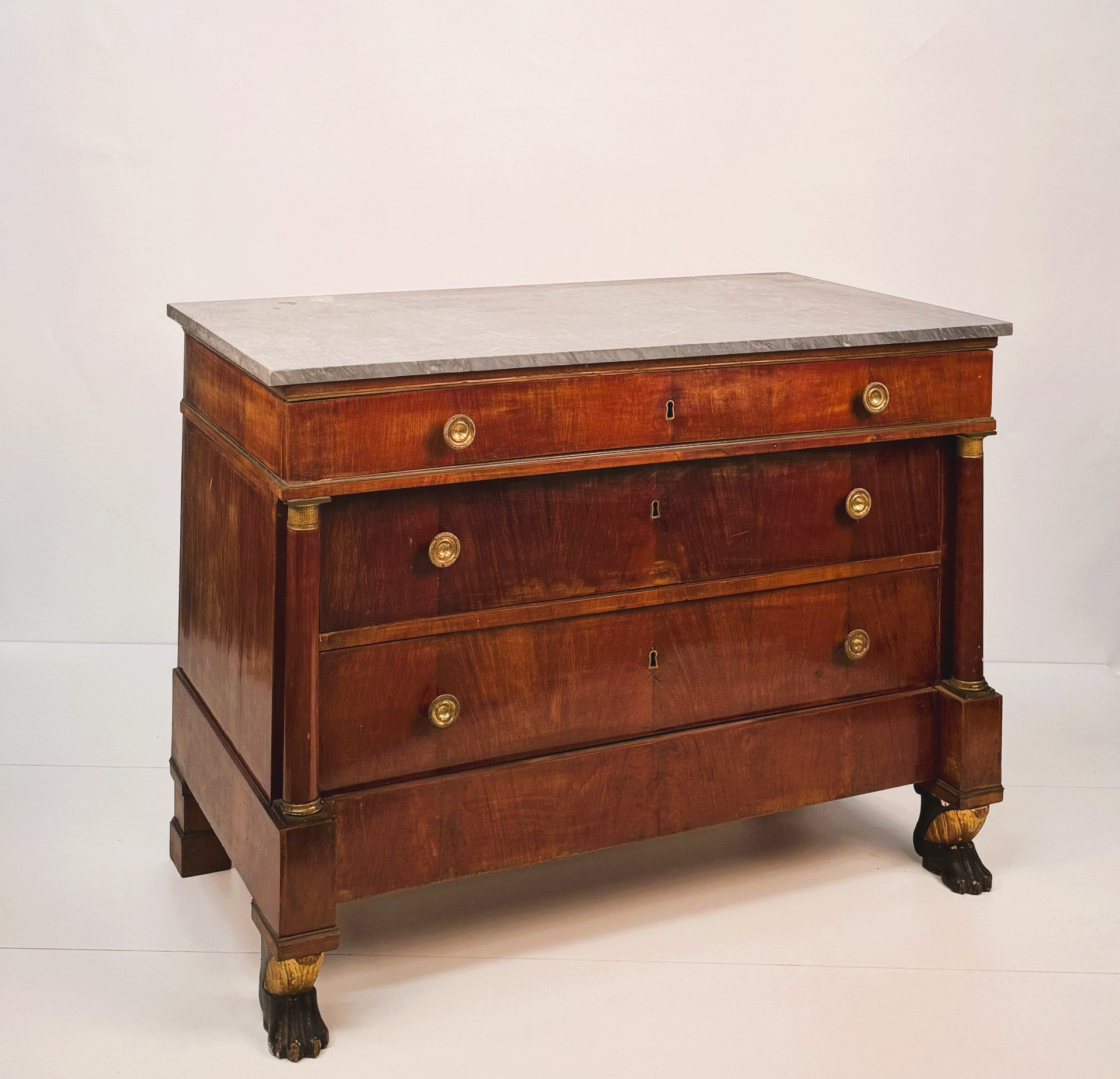 Walnut veneered chest of drawers, first quarter of the 19th century, front with two drawers separated by a crosspiece and surmounted by a slightly protruding smaller one, on the sides two turned columns on a high plinth with gilded bronze capitals and base; front feet with lion's paw in ebonyzed and gilded wood, gray marble topcm 91x125.5x60
