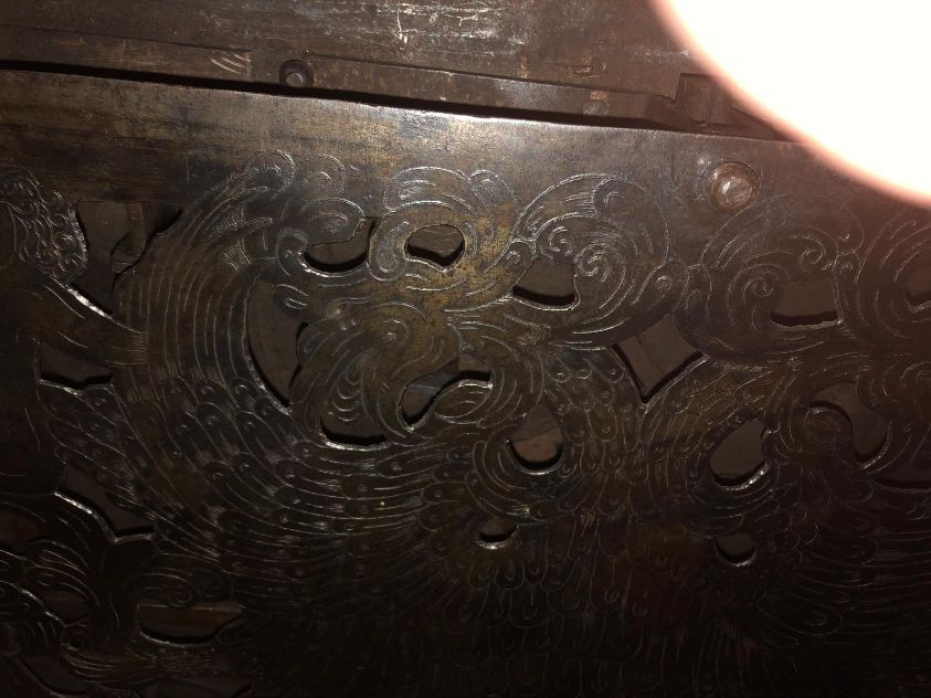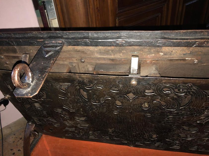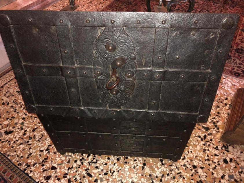Cassapanca in ferro battuto del XVII secolo, misure 78 x 44,5 cm, altezza 49 cm, di origine europea