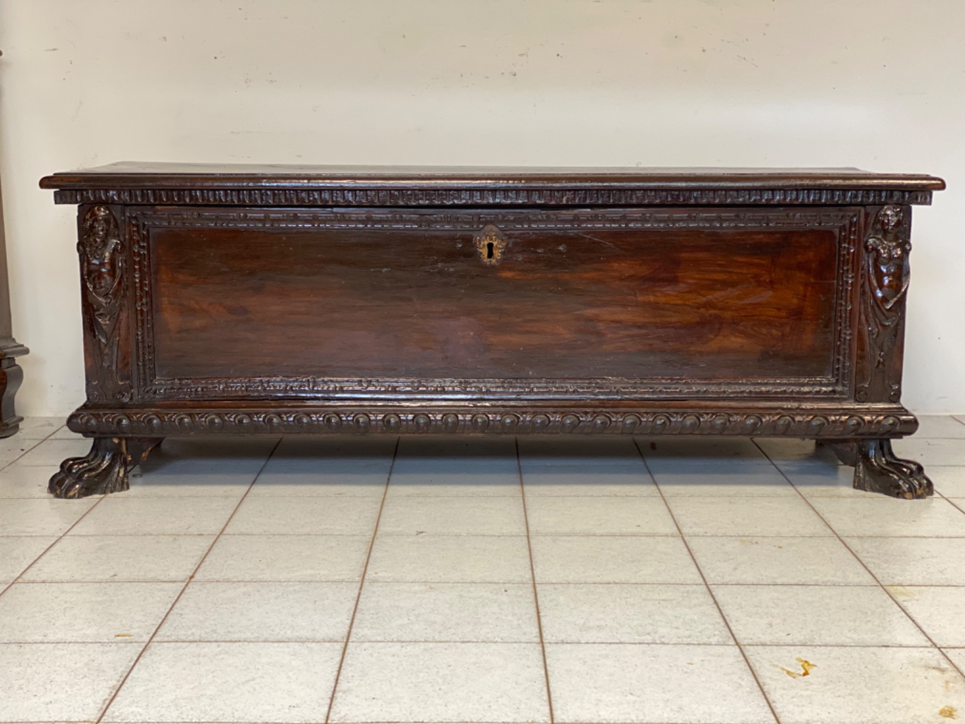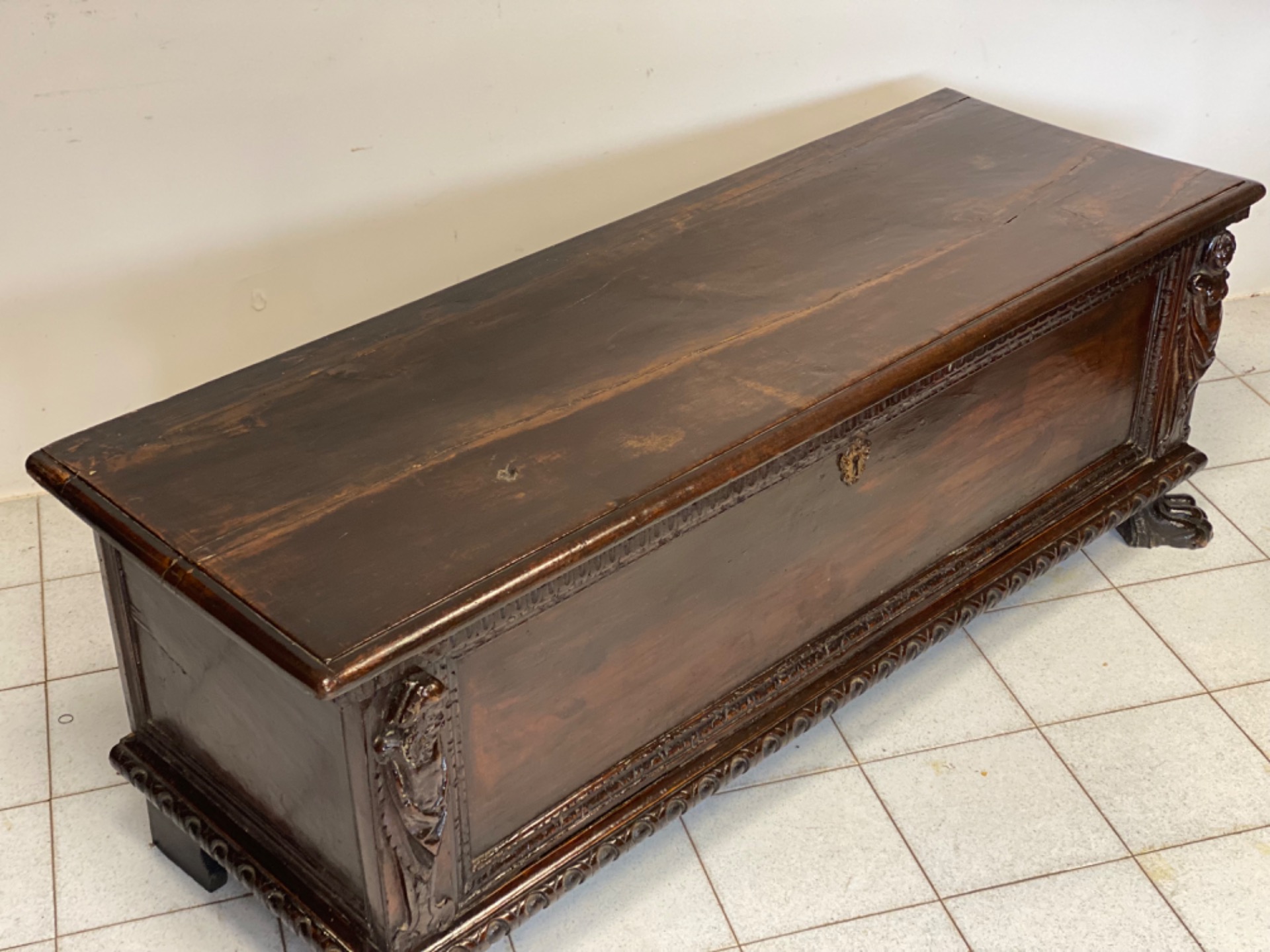 Cassapanca lombarda in noce con montanti a figure intagliate, bordure unghiate e baccellate, piedi ferini. Secolo XVIII (cm 158x58x58)