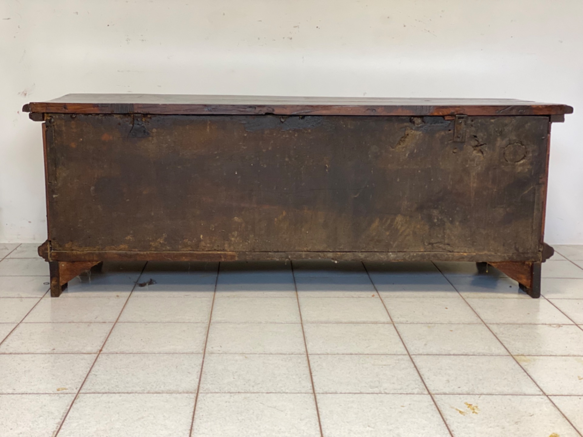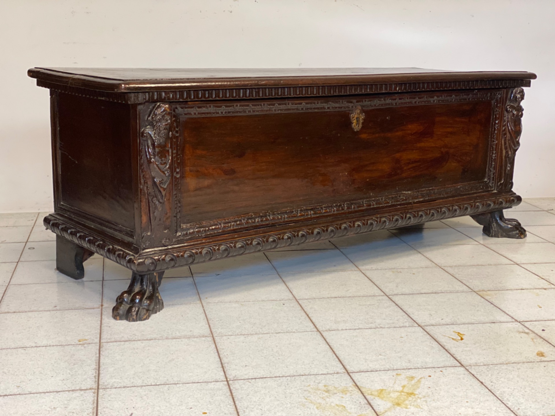Cassapanca lombarda in noce con montanti a figure intagliate, bordure unghiate e baccellate, piedi ferini. Secolo XVIII (cm 158x58x58)