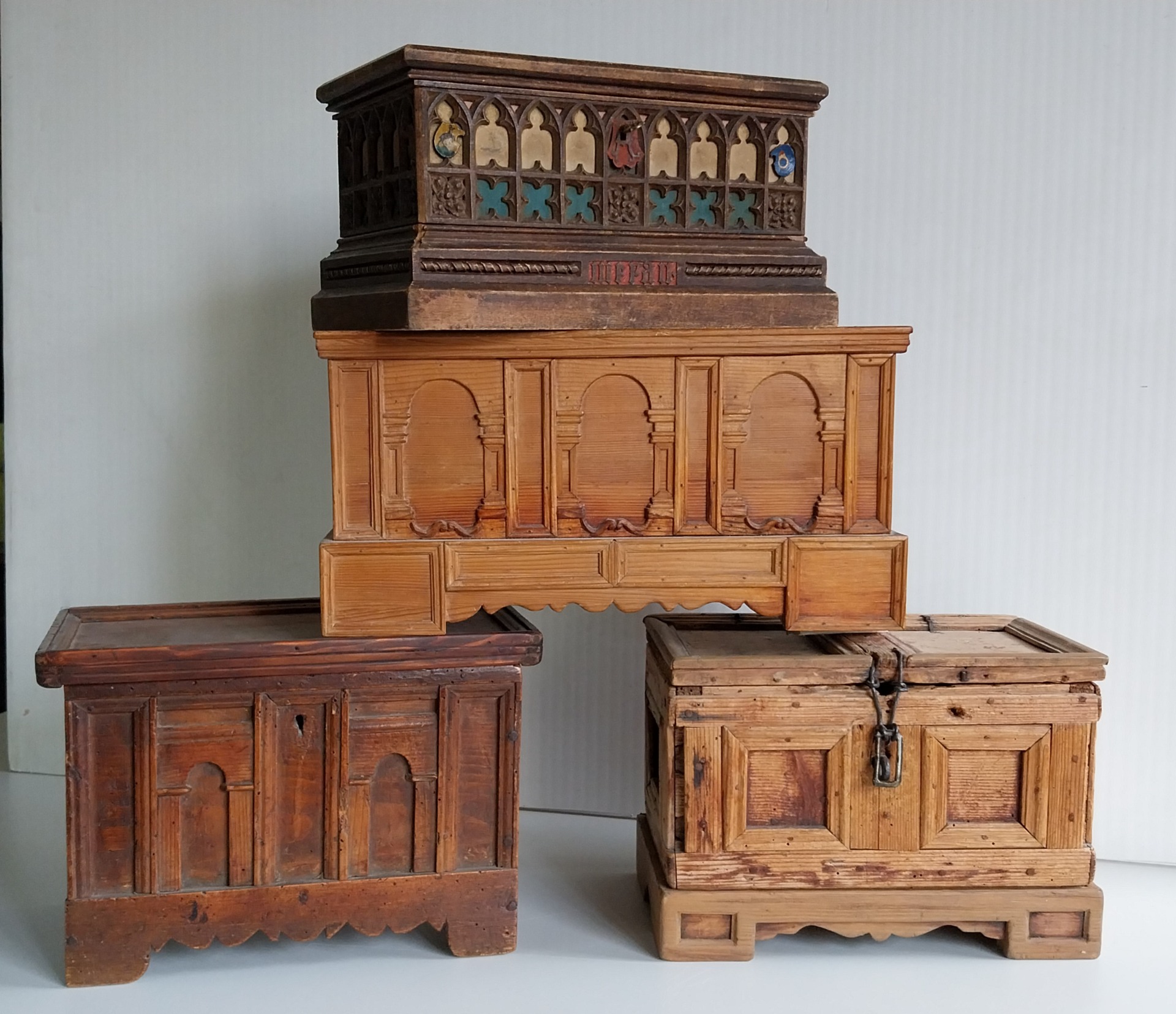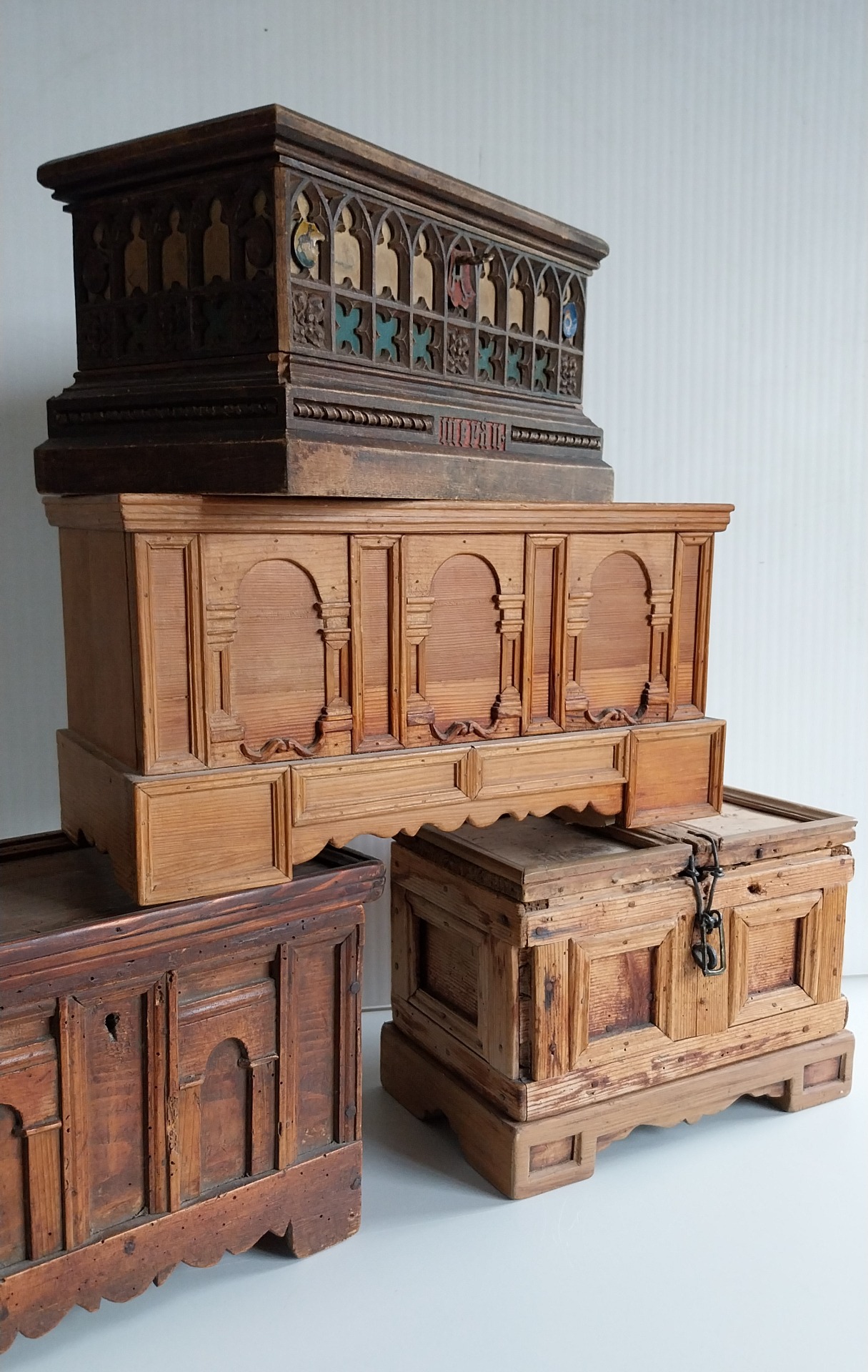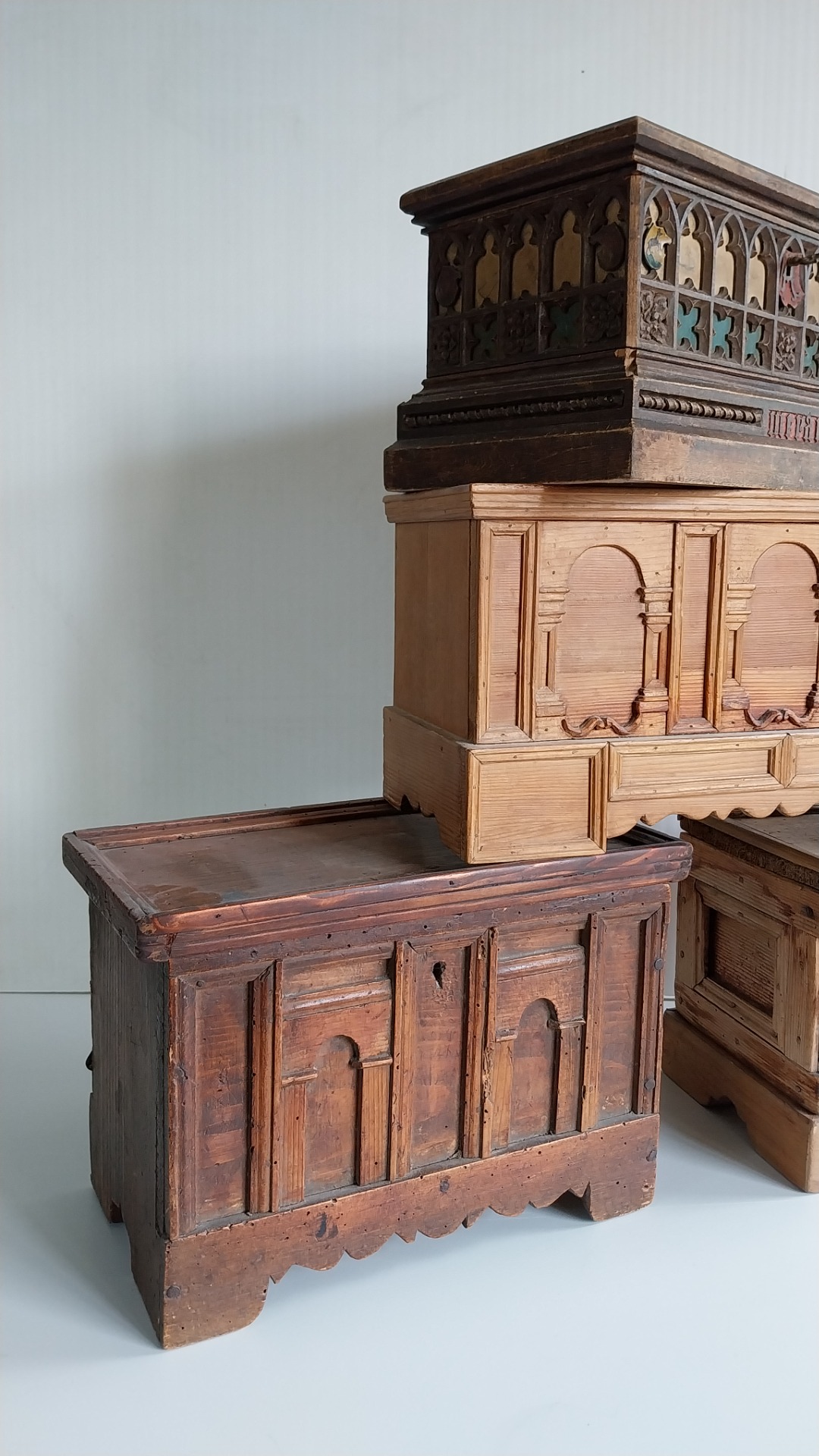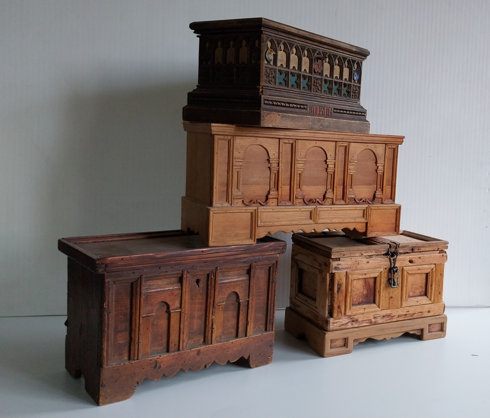 4 models of chests or jewelry boxes. Different eras, but all crafted in softwood. Originating from South Tyrol. Lovely alpine feel. Dimensions do not exceed 36 cm in length, with a maximum height of 21 cm. Beautiful original decorative pieces with lovely patinas.
