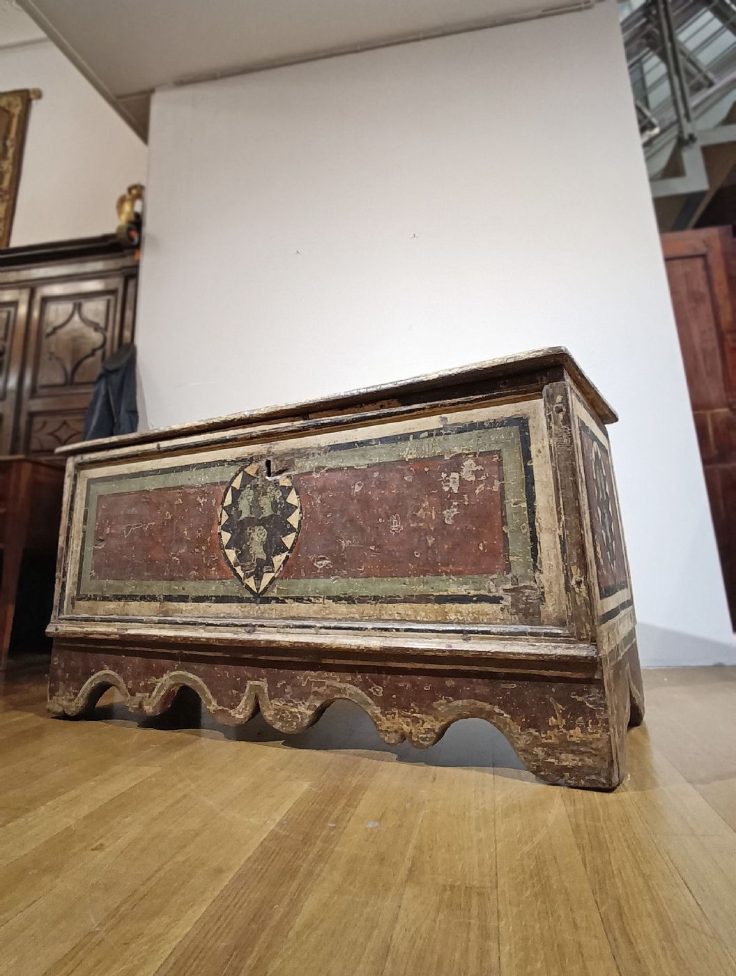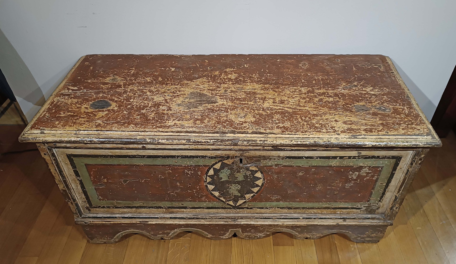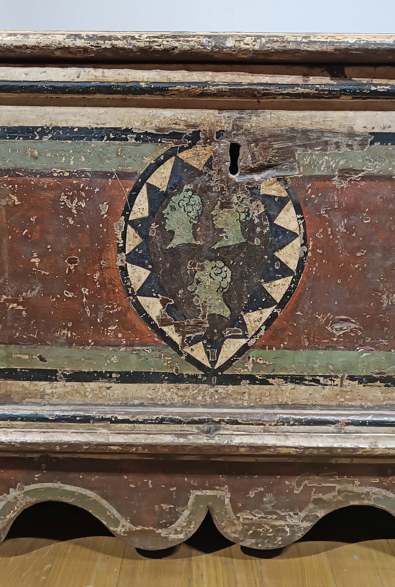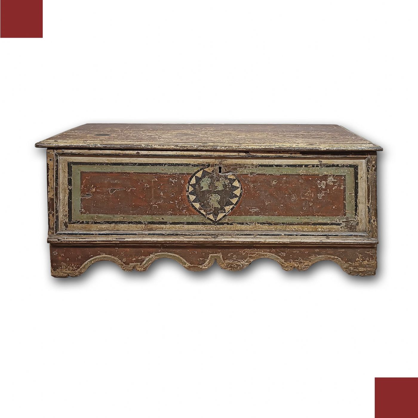 Elegant and unique chest in solid chestnut wood, painted in lean tempera in shades of red, green, yellow and black. The chest is rectangular in shape, with corbel feet and an overhanging top. Inside, which is very spacious, there is also a small additional shelf. The chest is decorated on the front and sides with geometric motifs and coats of arms attributable to a family from the Marche region, characterized by three figured heads in profile. It is a unique piece of furniture, capable of furnishing any room with a touch of antiquity and class. Marche manufacture (central Italy) from the Louis XIV period, from the second half of the 17th century.