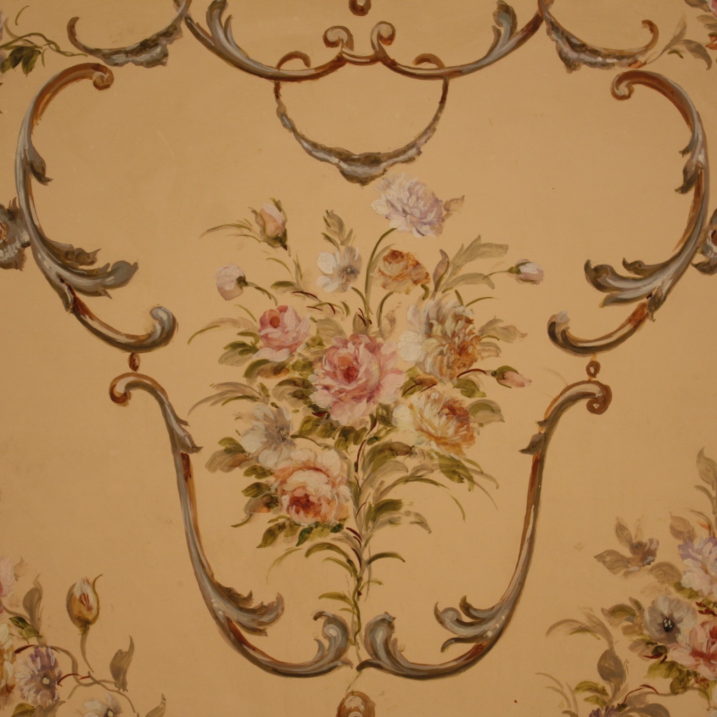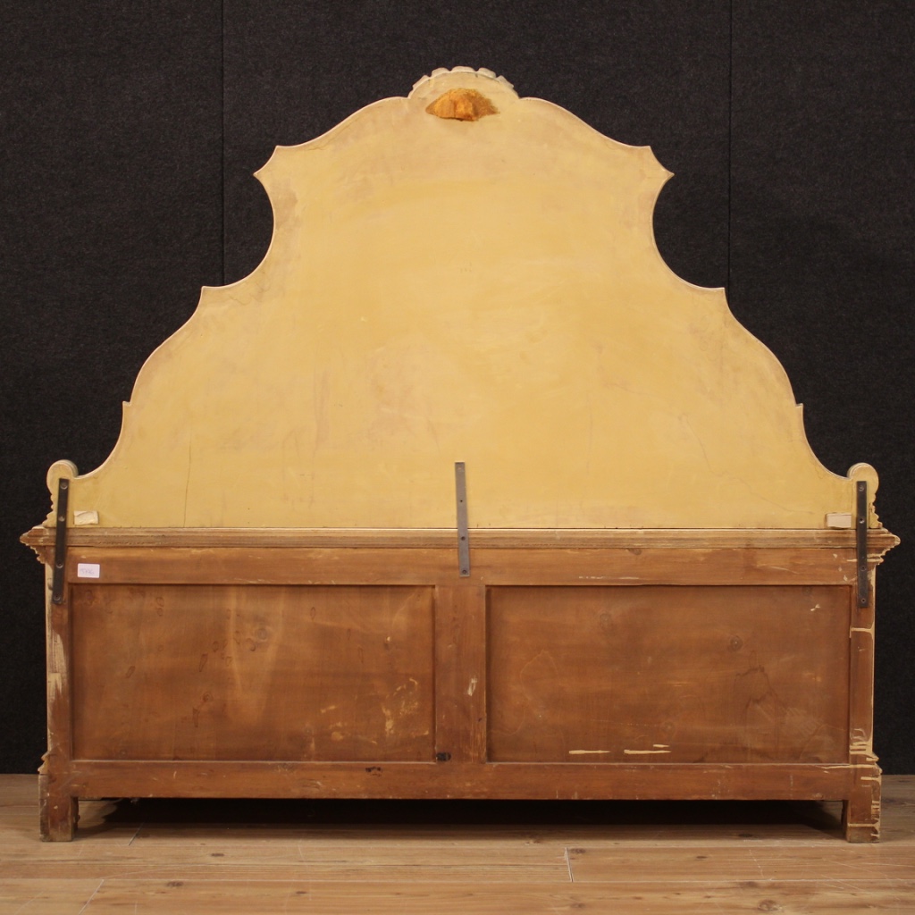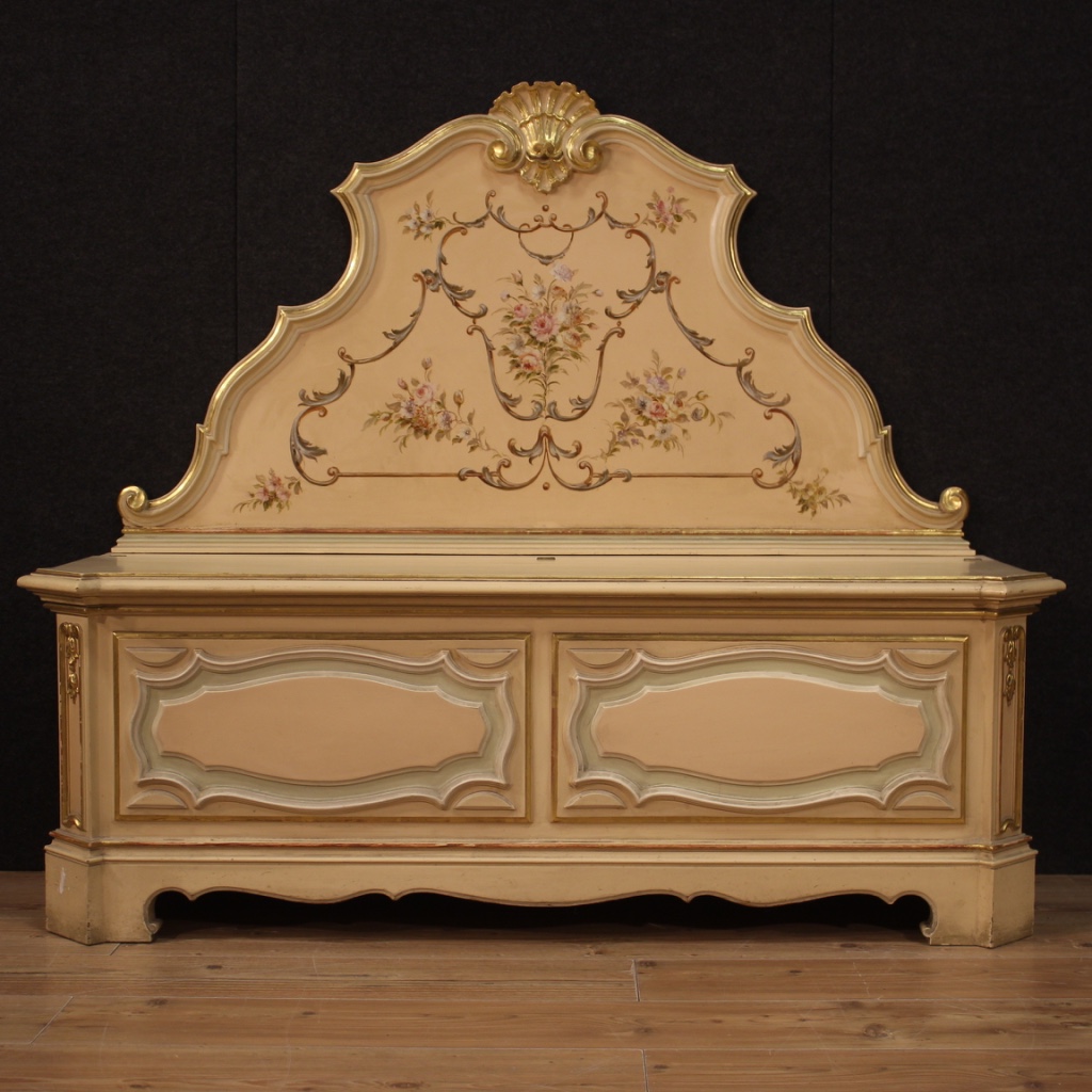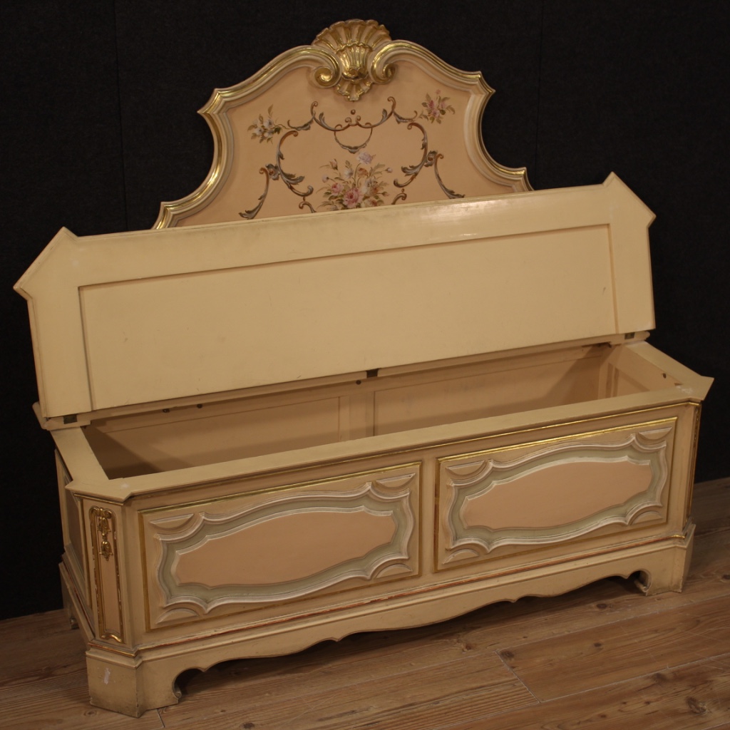 Venetian bench from the 20th century. Furniture in lacquered, gilded and painted wood of beautiful lines and pleasant decor. Chest with opening top of excellent capacity equipped in the upper part with a richly hand-painted backrest (see photo) with floral decorations. Chest of excellent proportions that can be easily placed in different parts of the house, ideal to be placed in an entrance or corridor. Furniture built in two separable blocks (bench and back) to be fixed with appropriate screws. It shows some small signs of the time, overall in a good state of conservation. Seat height 50 cm