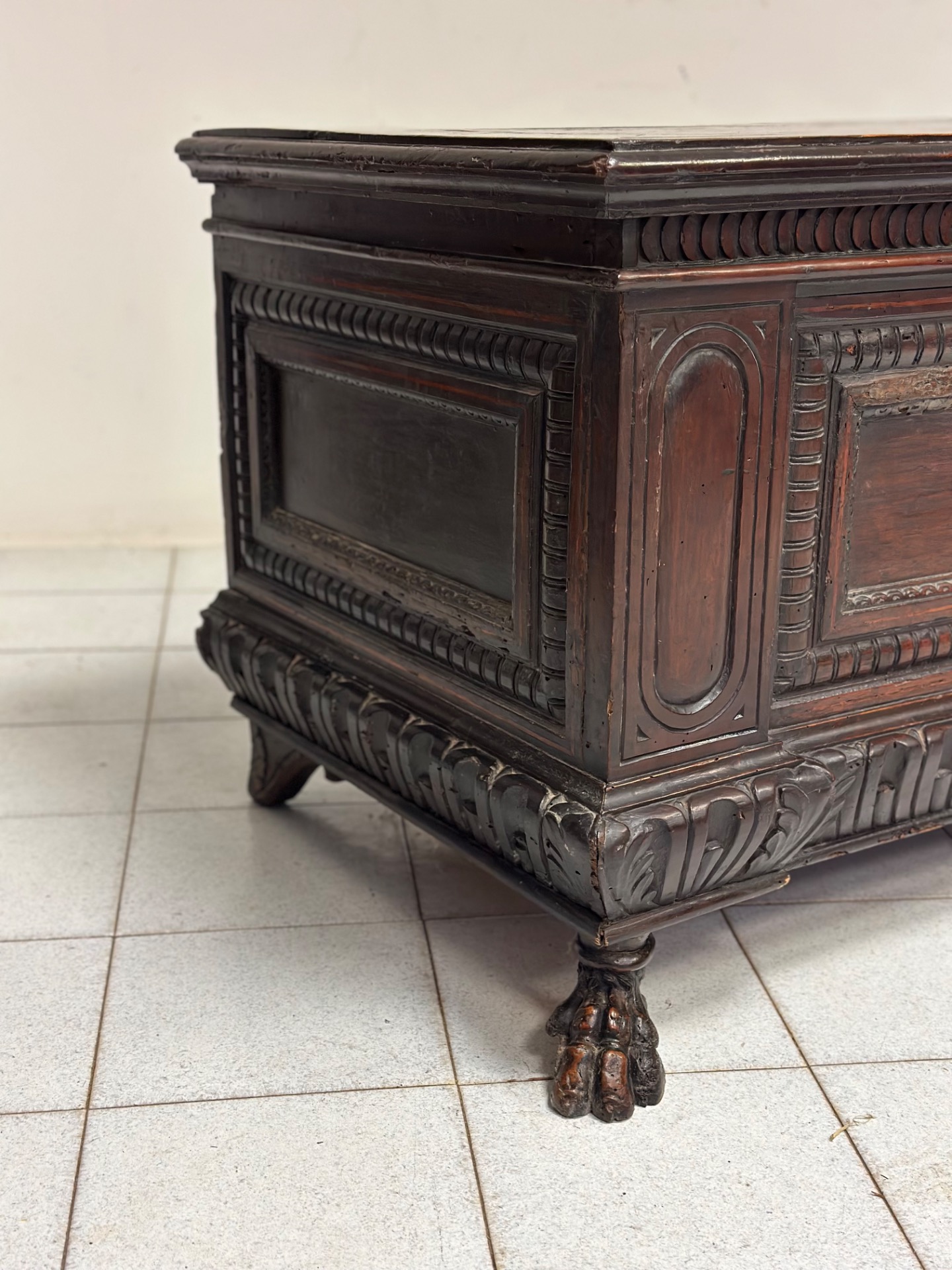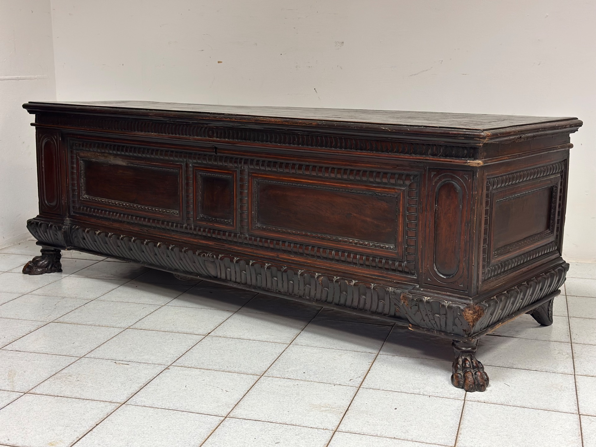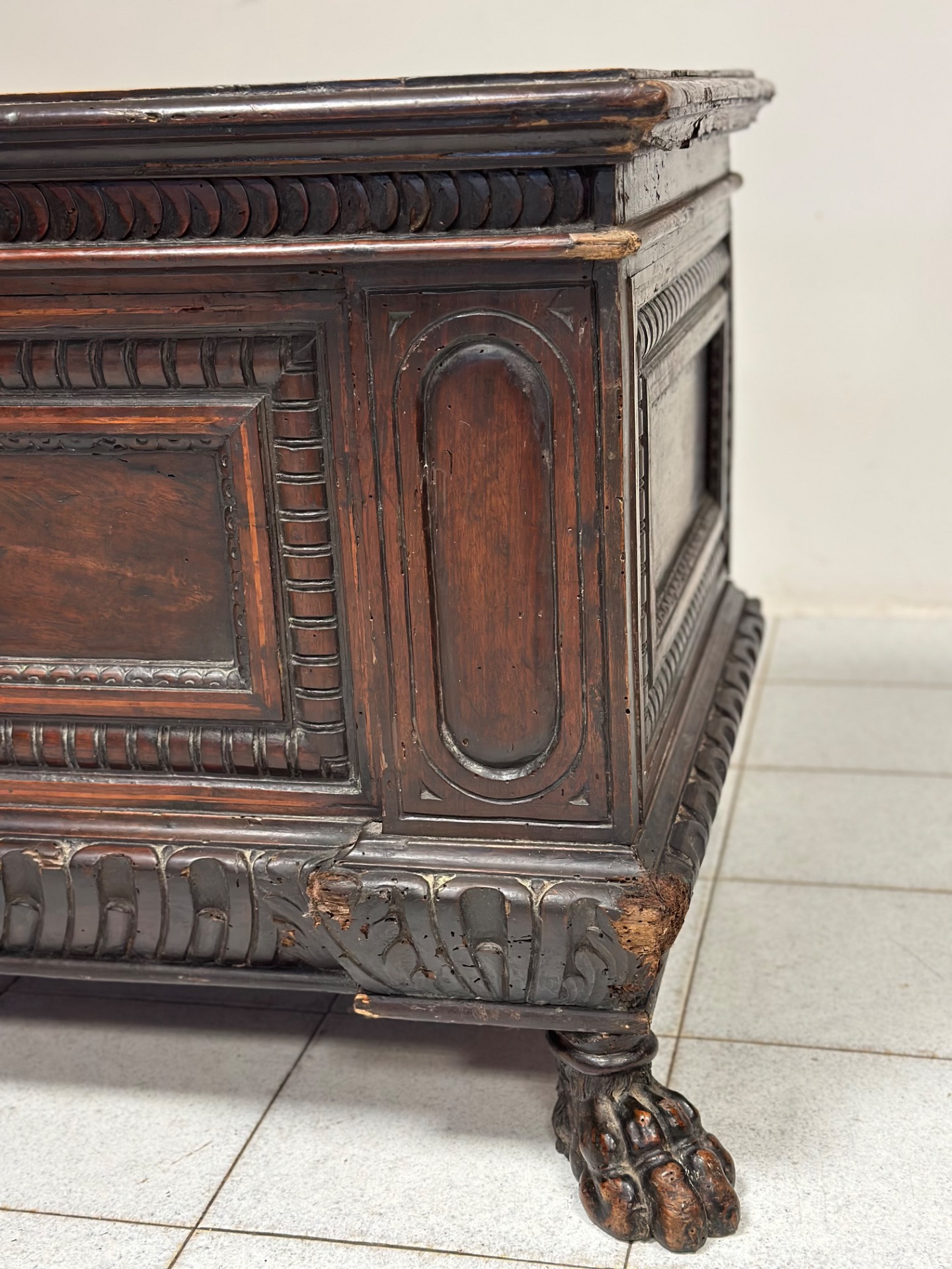 Important chest from Emilia-Tuscany from the early 17th century, entirely made of walnut, front with carved frames with a ribbon motif forming squares, scalloped base, claw feet with side shoulders. Period: full 17th century.