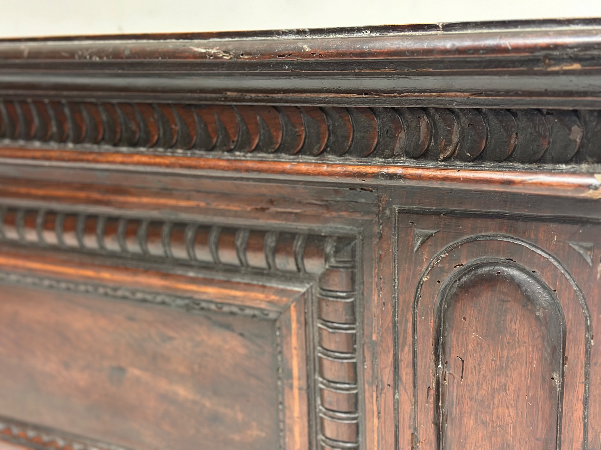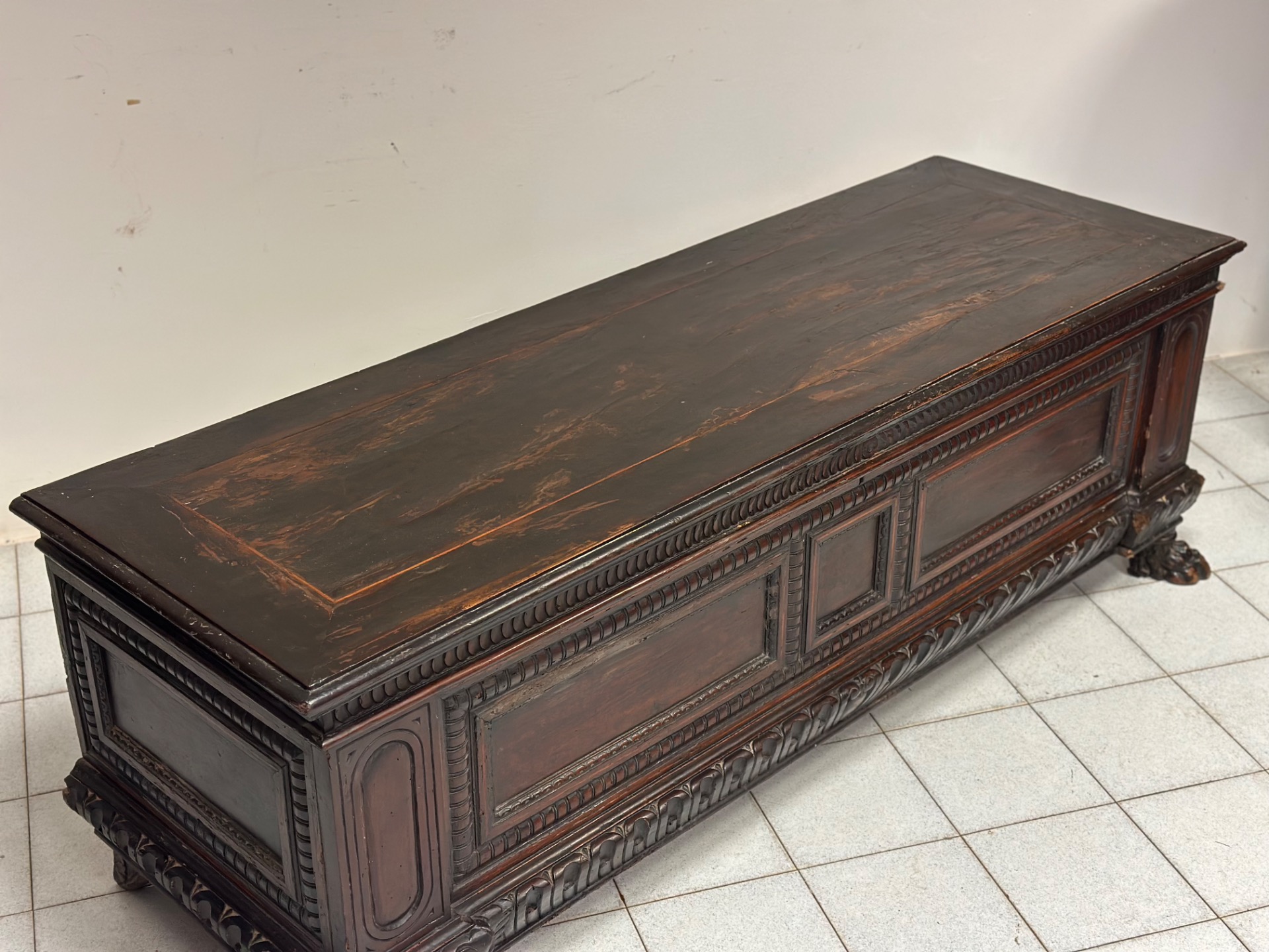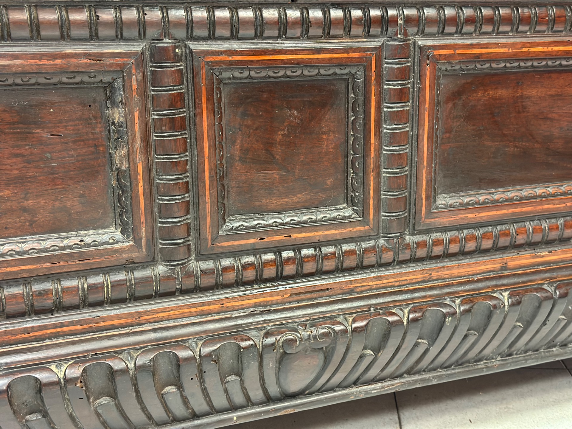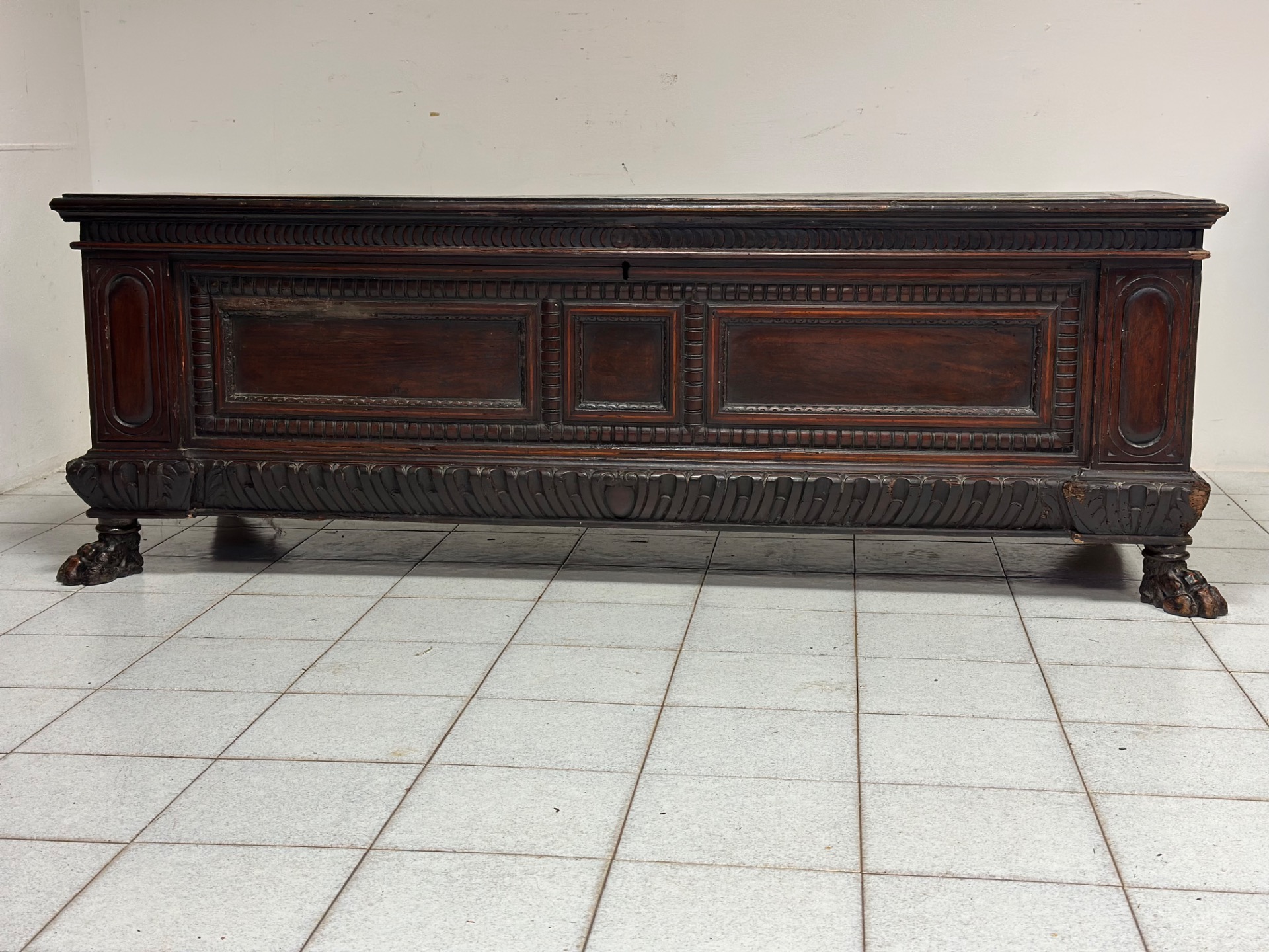 Important chest from Emilia-Tuscany from the early 17th century, entirely made of walnut, front with carved frames with a ribbon motif forming squares, scalloped base, claw feet with side shoulders. Period: full 17th century.