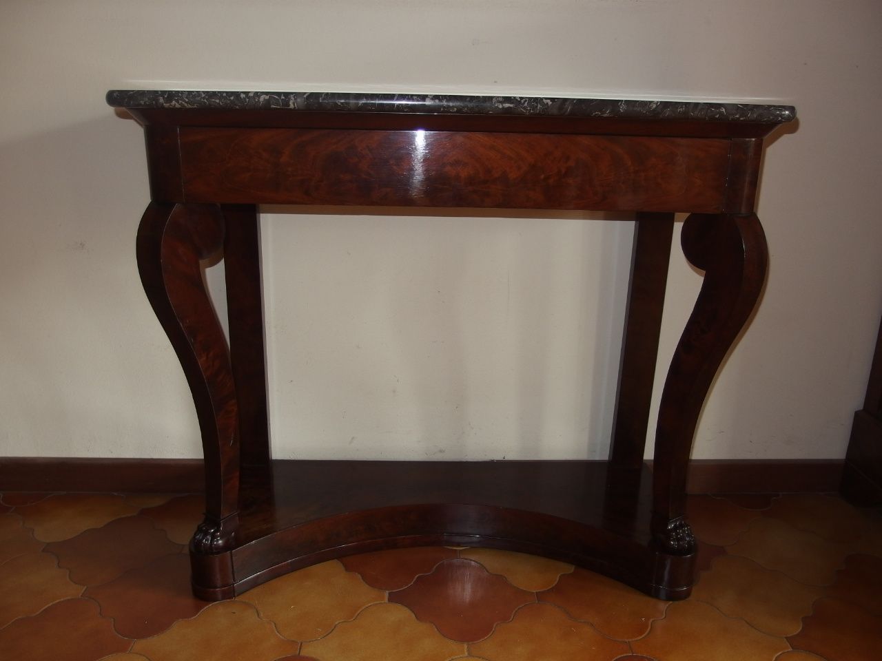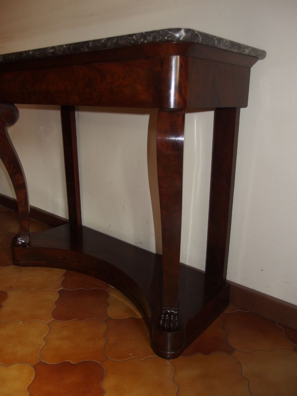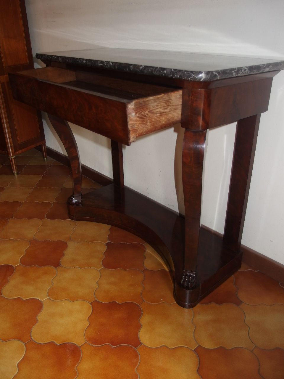 Beautiful flame mahogany console with drawer, Empire style from mid-19th century of French origin.The console is completely original and does not require restoration! The furniture has already been restored by us and the polishing has been done with shellac.