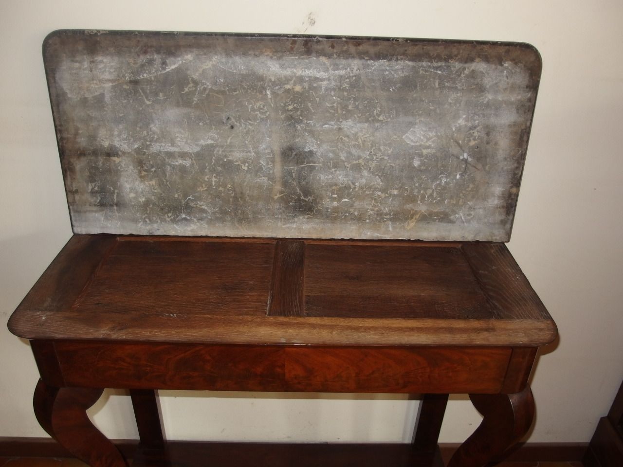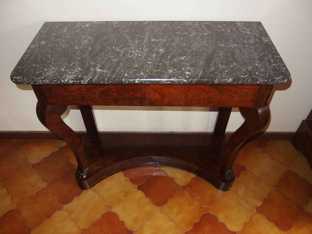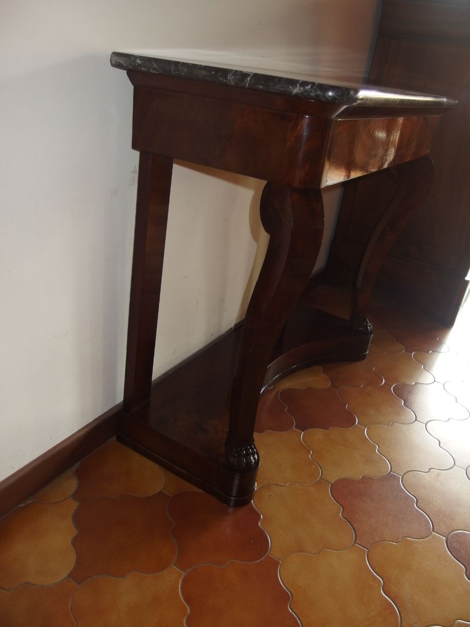 Beautiful flame mahogany console with drawer, Empire style from mid-19th century of French origin.The console is completely original and does not require restoration! The furniture has already been restored by us and the polishing has been done with shellac.