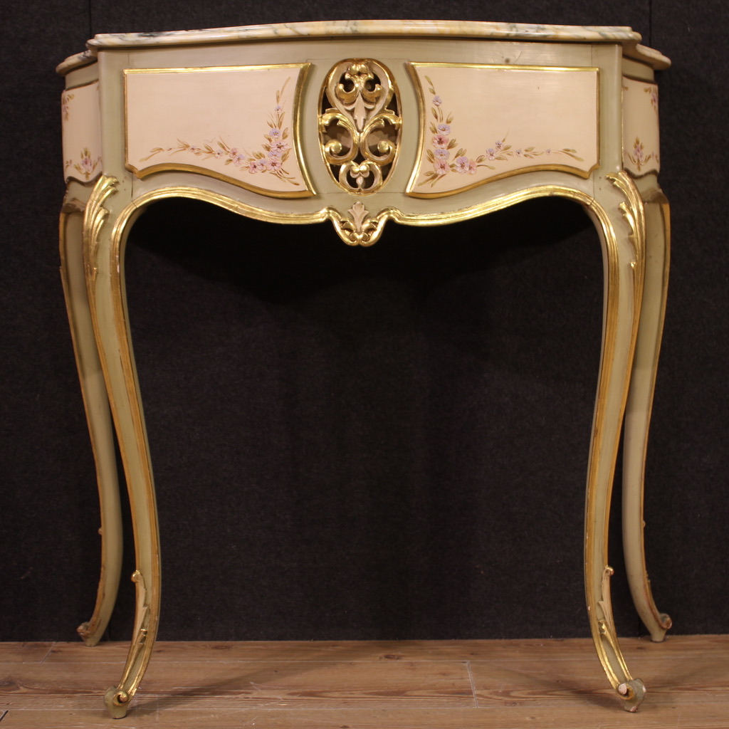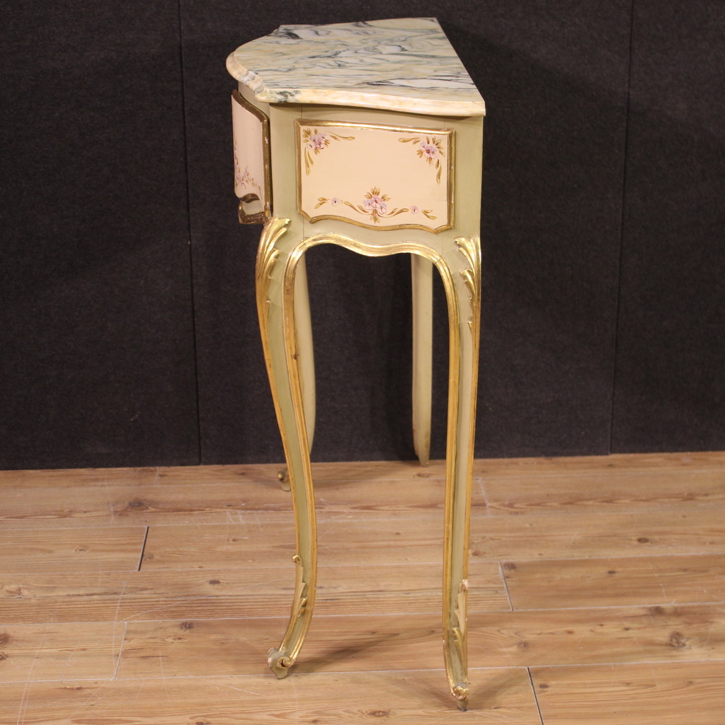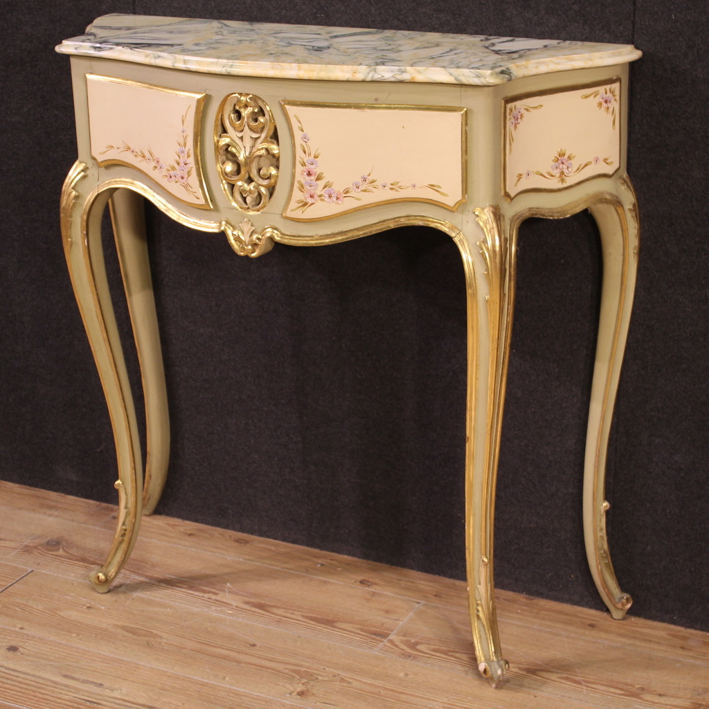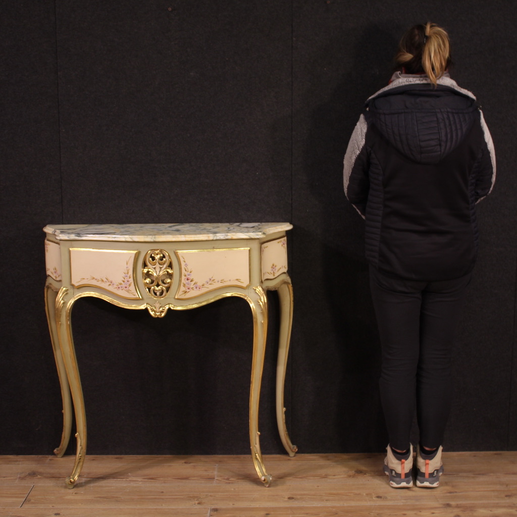 Italian console from the mid-20th century. Furniture with beautiful lines and pleasant furnishings in carved, lacquered, gilded and hand-painted wood with very pleasant floral decorations. High leg console adorned with curled feet (see photo) of good stability. Top in good-sized original marble, complete with two frontal retractable drawers (see photo) of reasonable capacity. Console of excellent proportions, it can be easily placed in different parts of the house, for antique dealers and interior designers. In good condition with some small signs of aging.