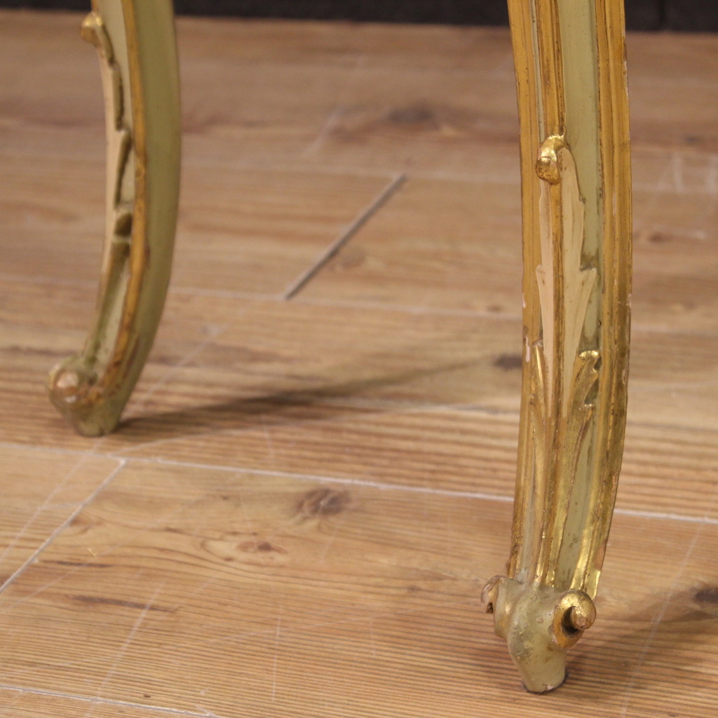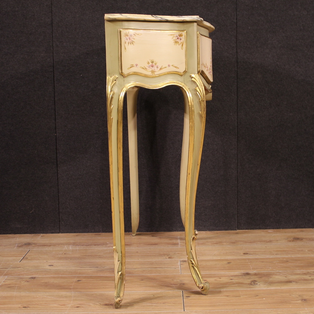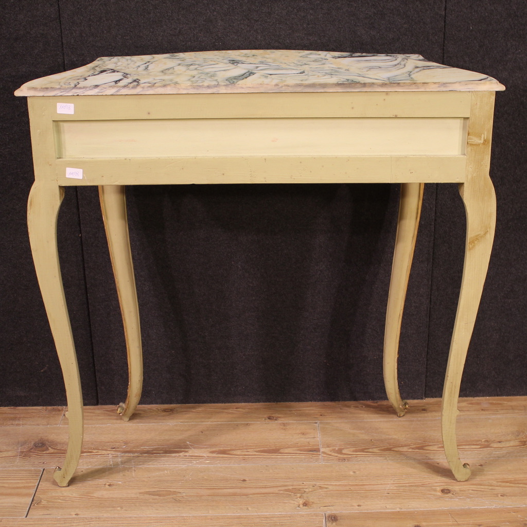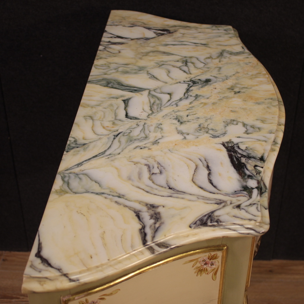 Italian console from the mid-20th century. Furniture with beautiful lines and pleasant furnishings in carved, lacquered, gilded and hand-painted wood with very pleasant floral decorations. High leg console adorned with curled feet (see photo) of good stability. Top in good-sized original marble, complete with two frontal retractable drawers (see photo) of reasonable capacity. Console of excellent proportions, it can be easily placed in different parts of the house, for antique dealers and interior designers. In good condition with some small signs of aging.