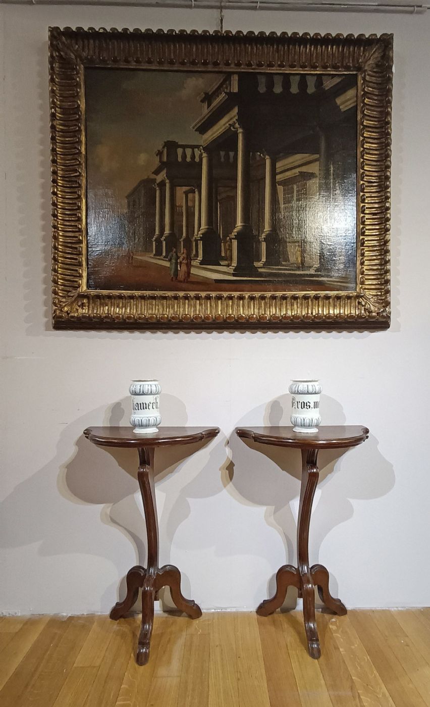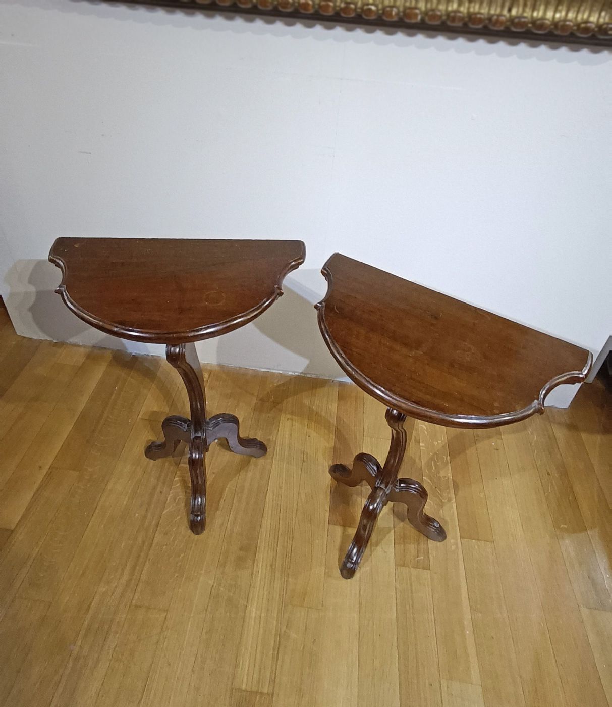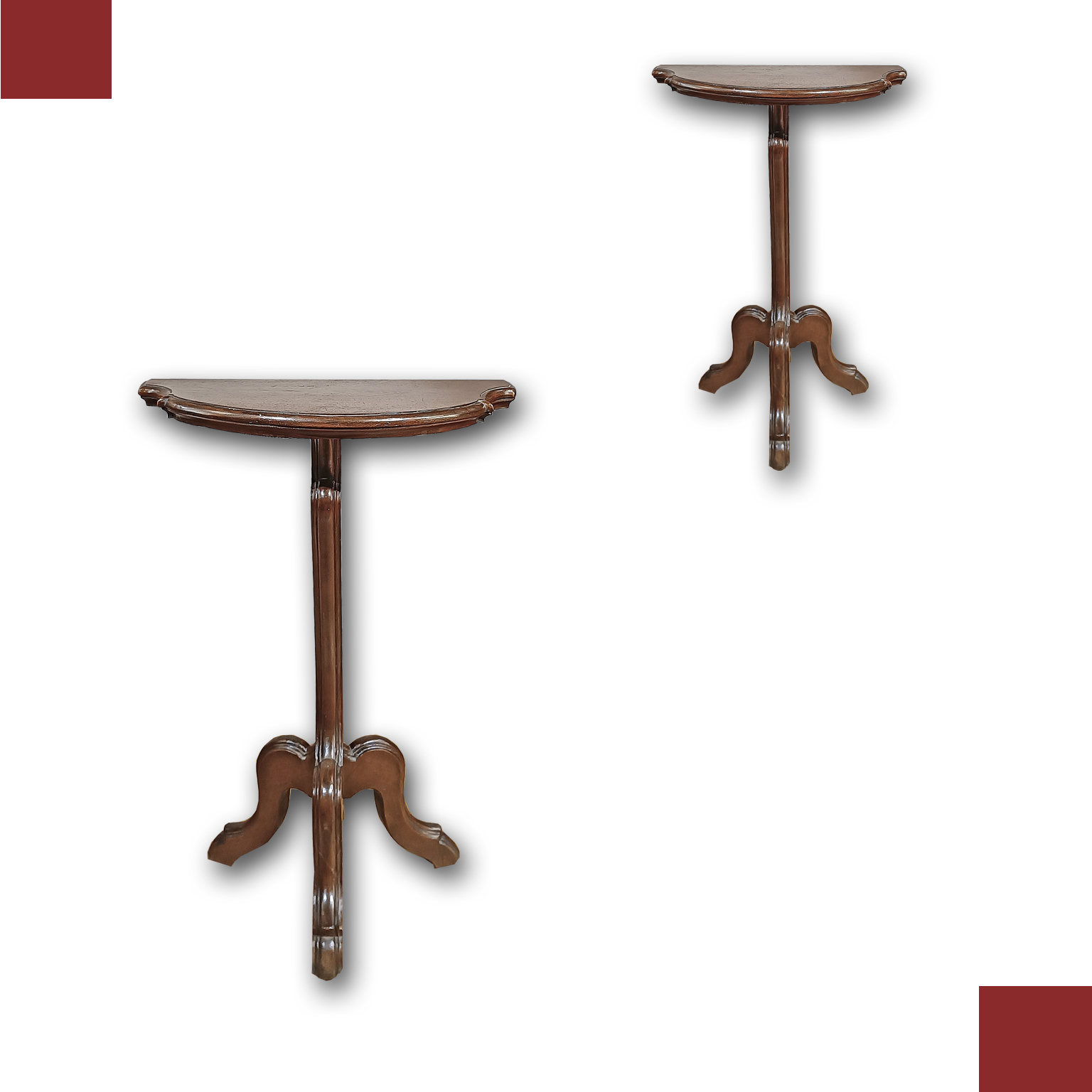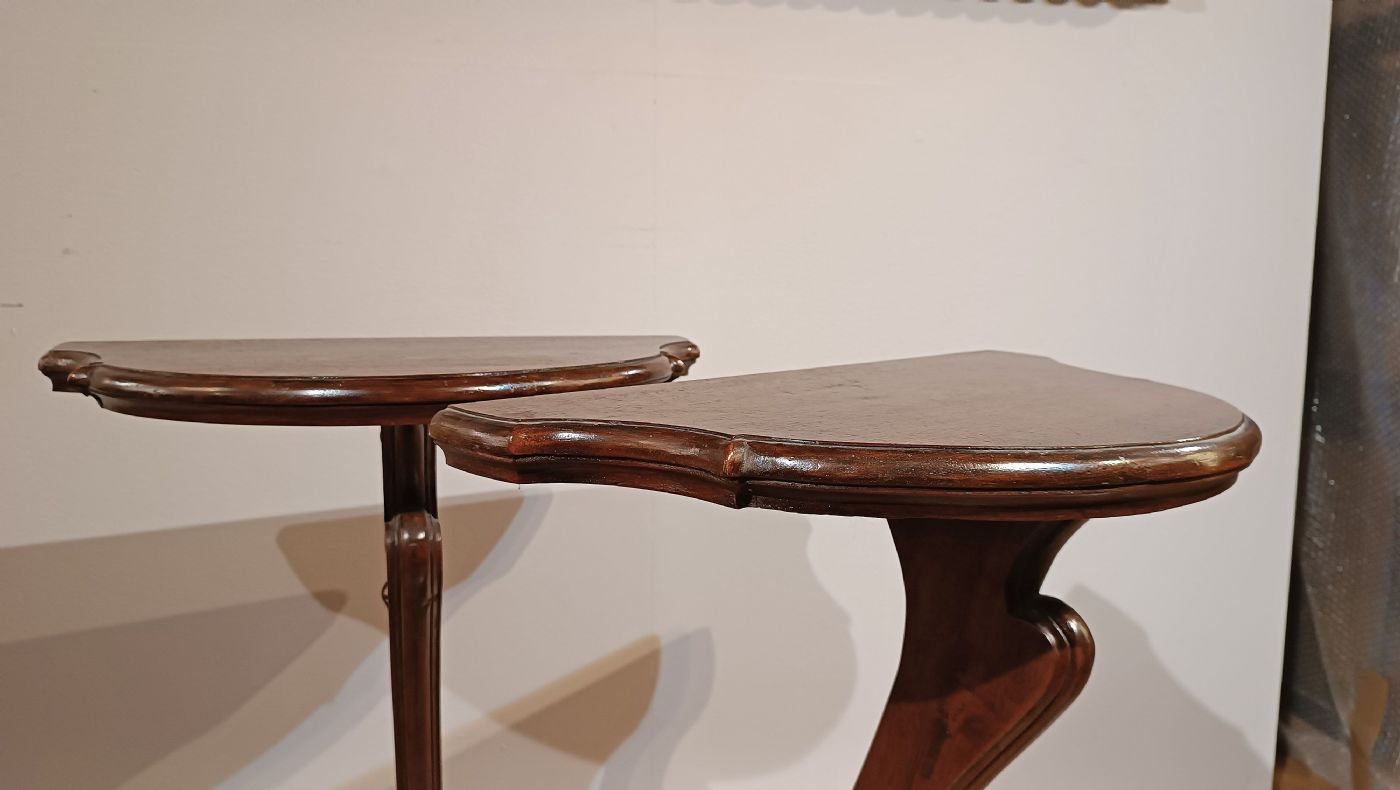 Elegant pair of small guéridon console tables in solid walnut, finely hand-carved. Each features a curved stem that opens into three scroll feet, which accentuate its grace, and a shaped top that adds elegance. A unique pair, well-made, capable of embellishing any environment with taste and refinement. Venetian manufacture (Northern Italy) in the Louis XV style, to be ascribed to the 19th century.