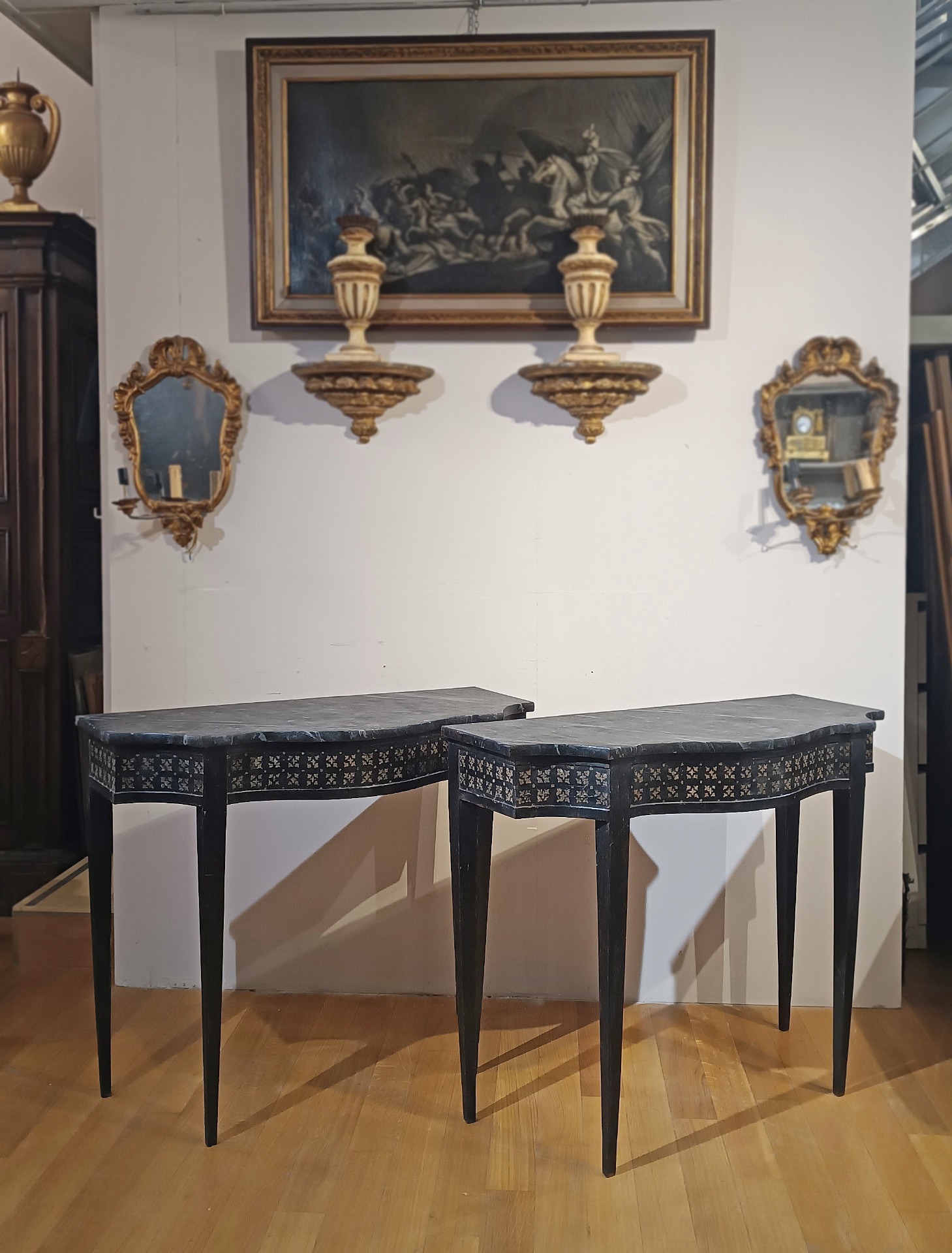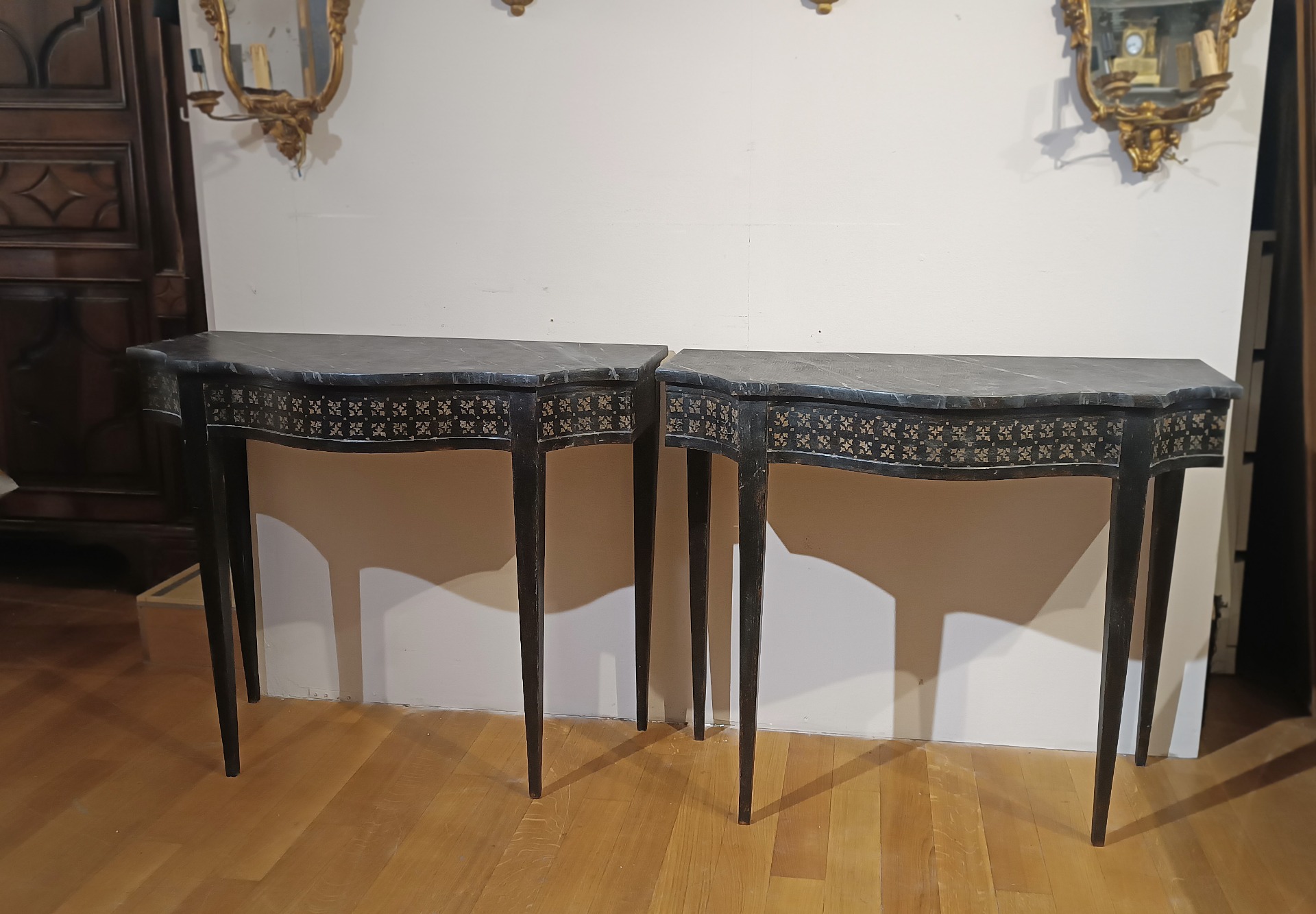 Elegant pair of consoles in carved and painted wood in two-tone black and white, with a chalky background. The consoles have a central arched shaped top, truncated pyramidal legs typical of the neoclassical style, and a top painted in faux marble, which gives further refinement to the consoles. Enhancing the design further are the painted decorations on the band of the undertop, recalling classic geometric patterns. It is a pair of consoles of great taste and elegance, suitable for both antique and modern furnishings, and capable of giving class and refinement to the environment. Italian manufacture in the neoclassical style, around the late 19th century.