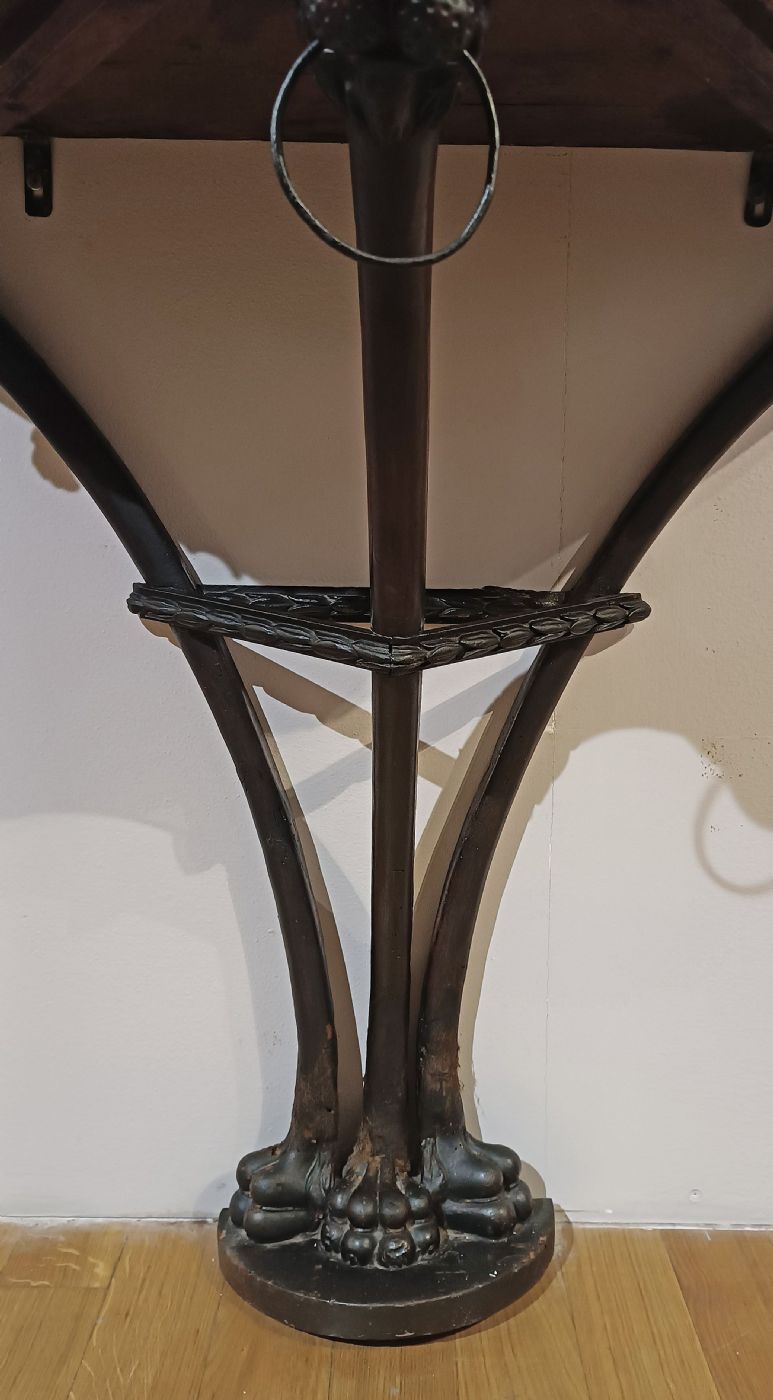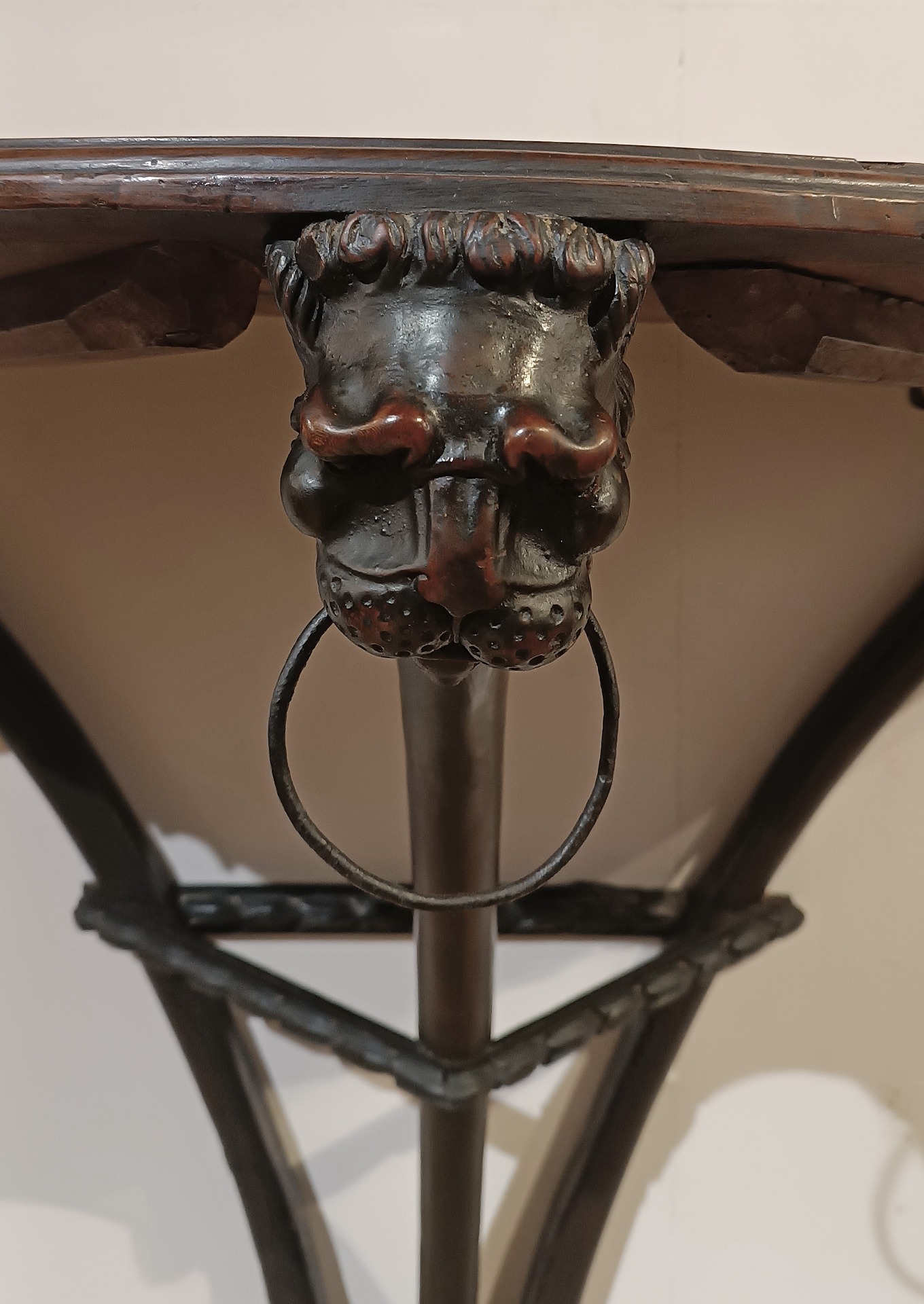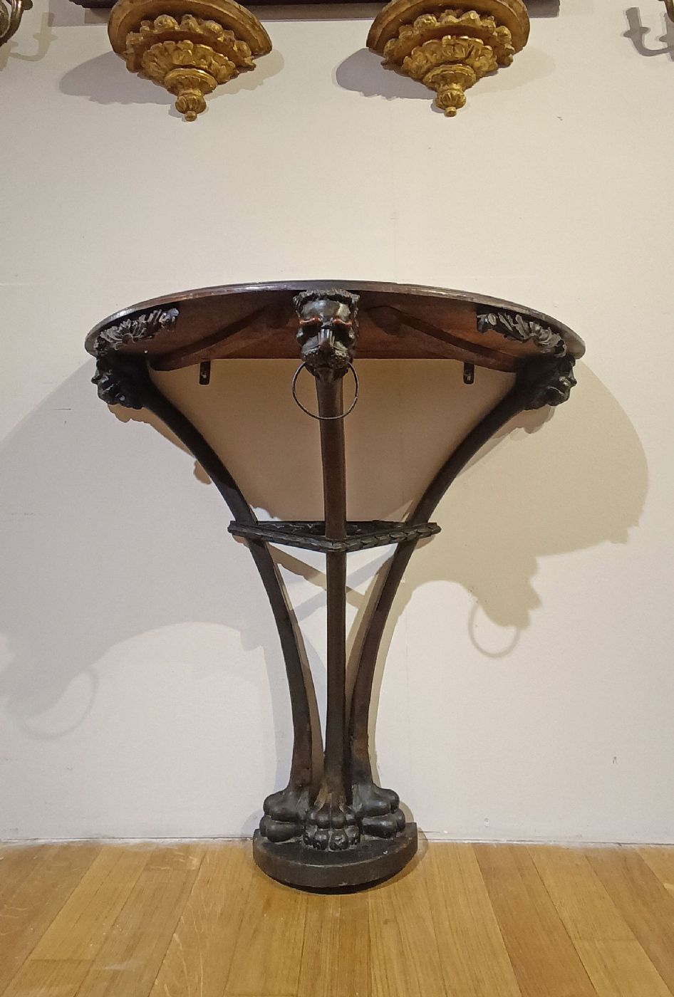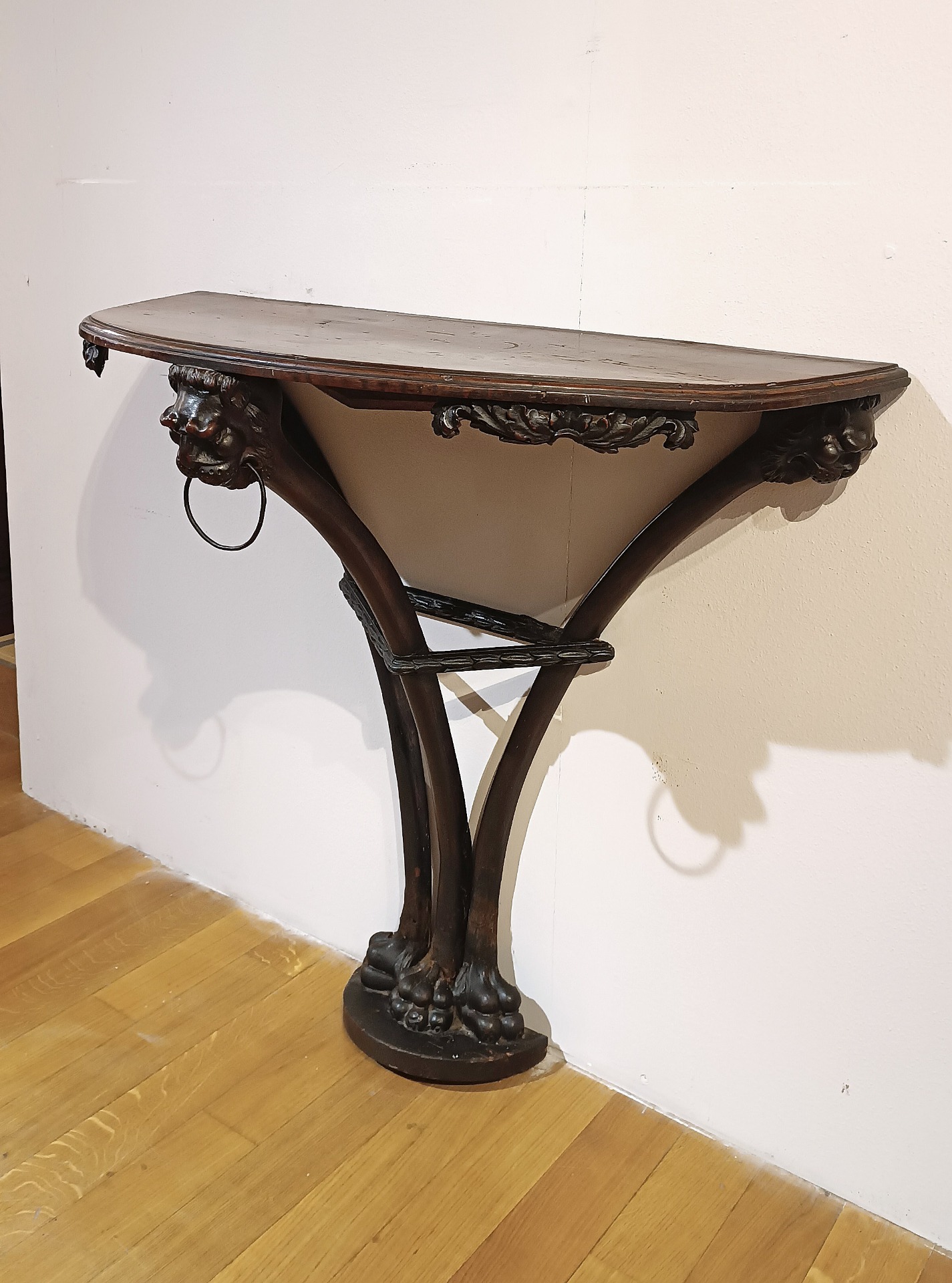 Elegant console table in finely carved solid walnut. The console has a half-moon top and three animalistic legs. It is decorated with geometric, phytomorphic carvings and lion protomes at the corners and center, which enhance its refinement. This is a wall console, equipped with supports for affixing, capable of embellishing any environment with a touch of class and antiquity. Tuscan manufacture from the Neoclassical period, around the second half of the 18th century.