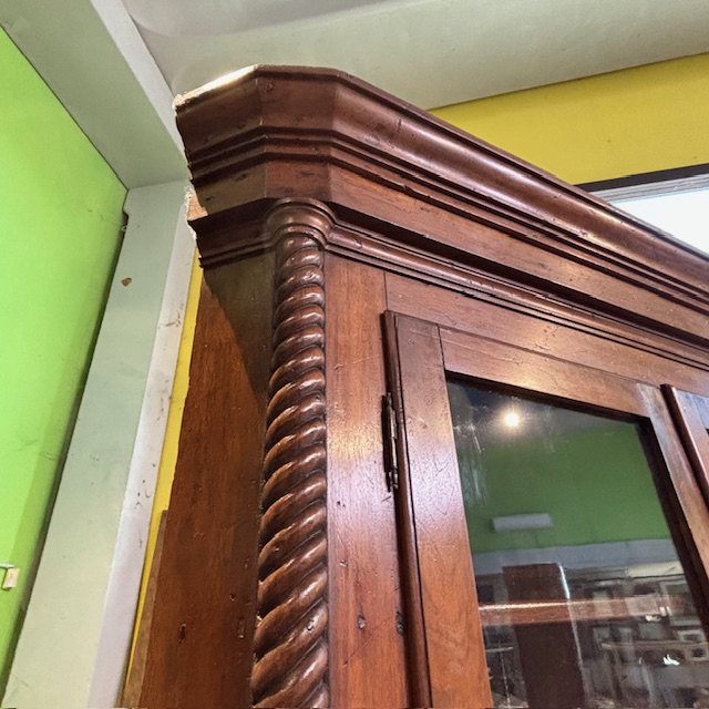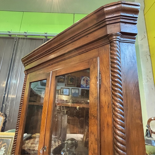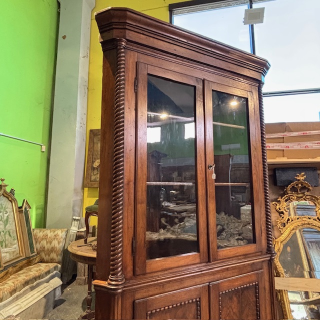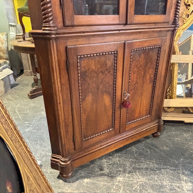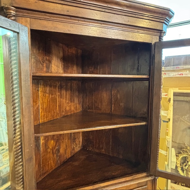 Antique Carlo X corner cabinet in solid walnut. Early 1800s, restored, with original glass. Dimensions: H 235 L 122 D 80