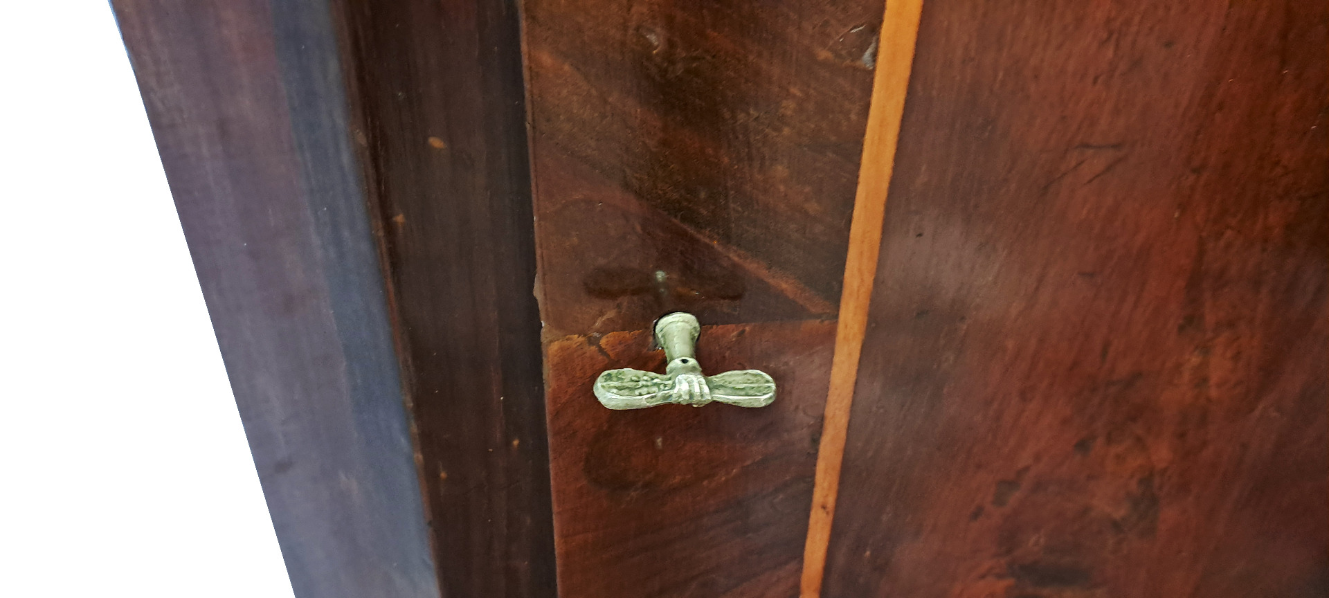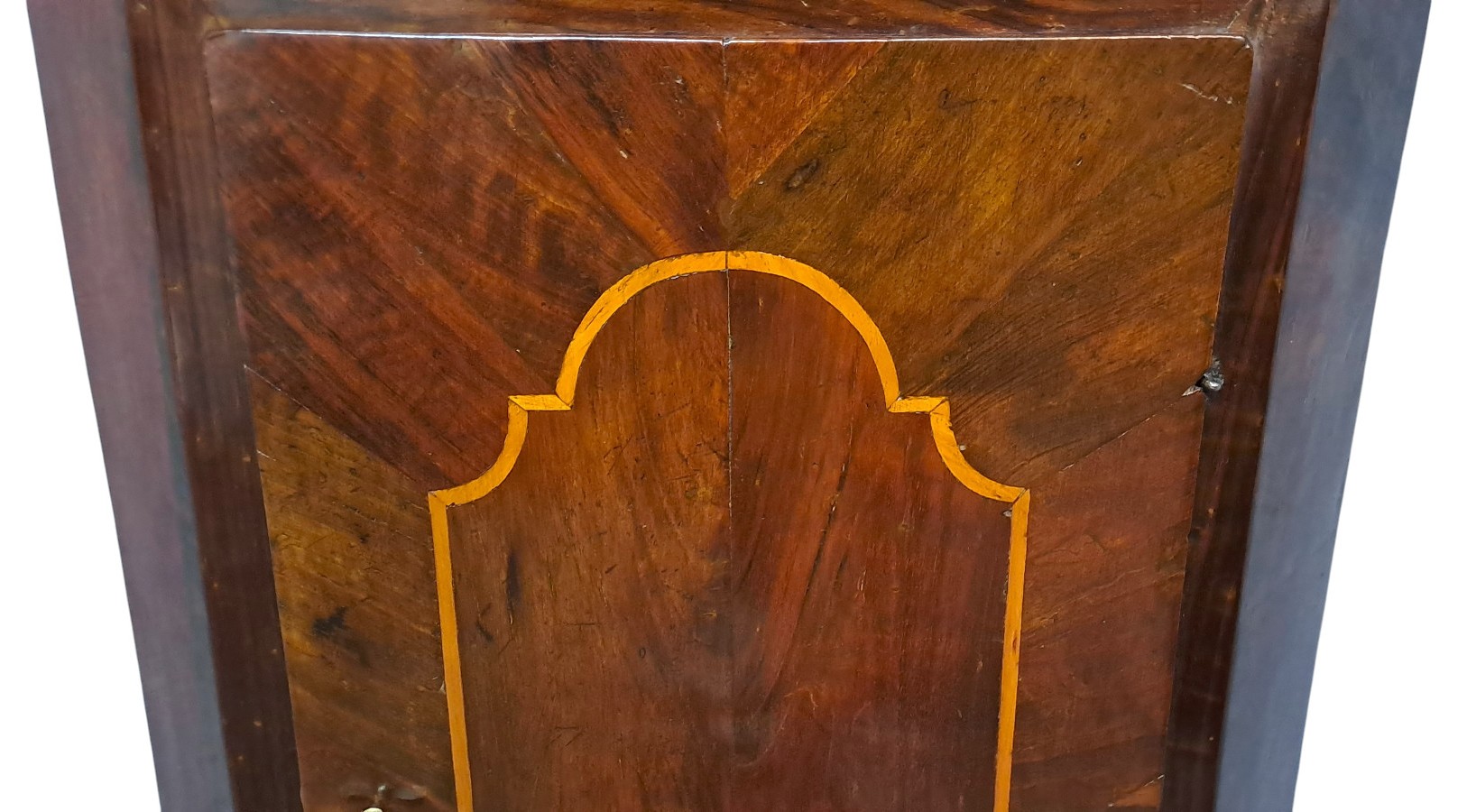 The front facade is embellished with an important inlaid panel in a "butterfly" or "radiating" pattern, obtained from the symmetrical arrangement of wooden veneers with mirrored grains, creating a decorative effect of great impact. At the center of the panel is an inlaid motif in a shaped cartouche, delimited by a contrasting boxwood profile.