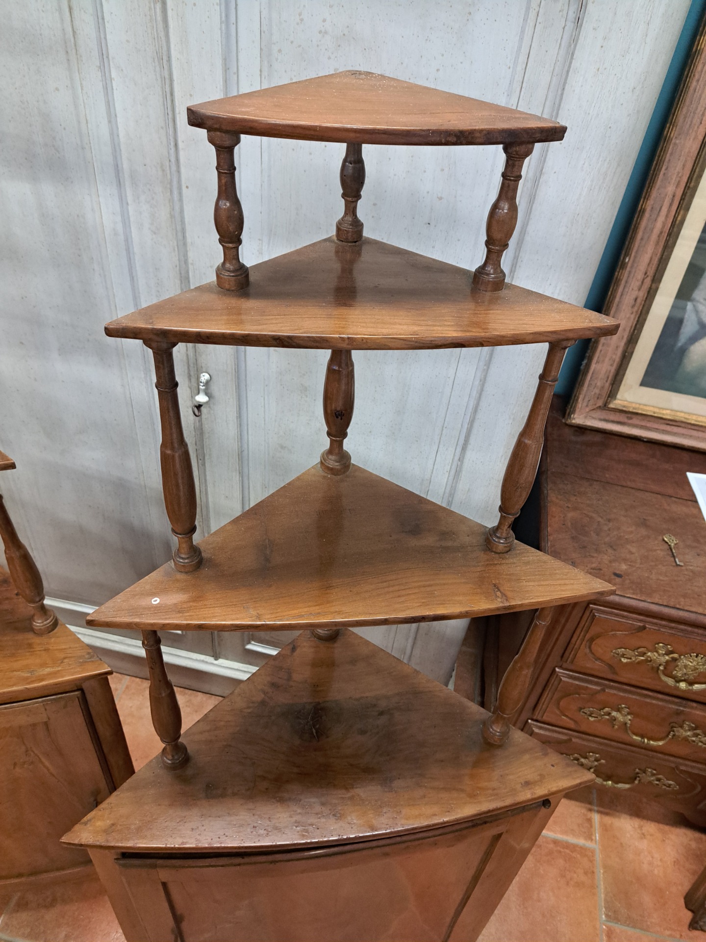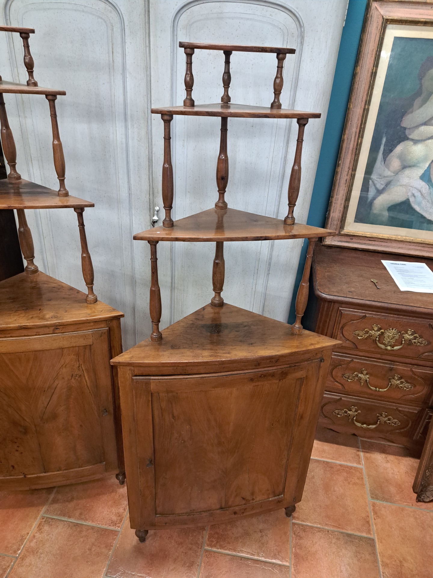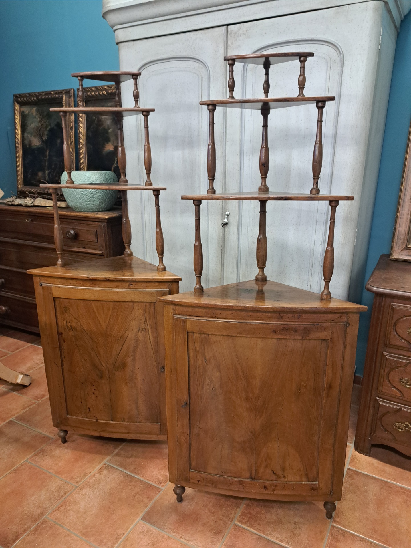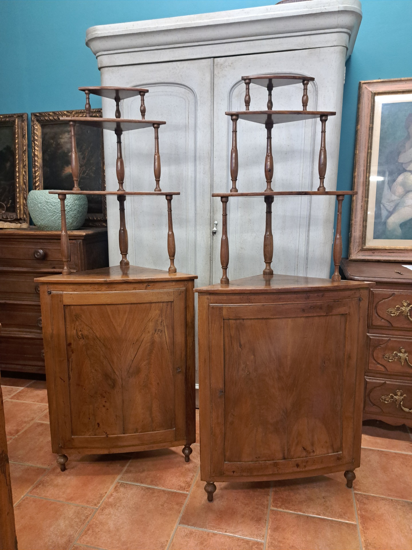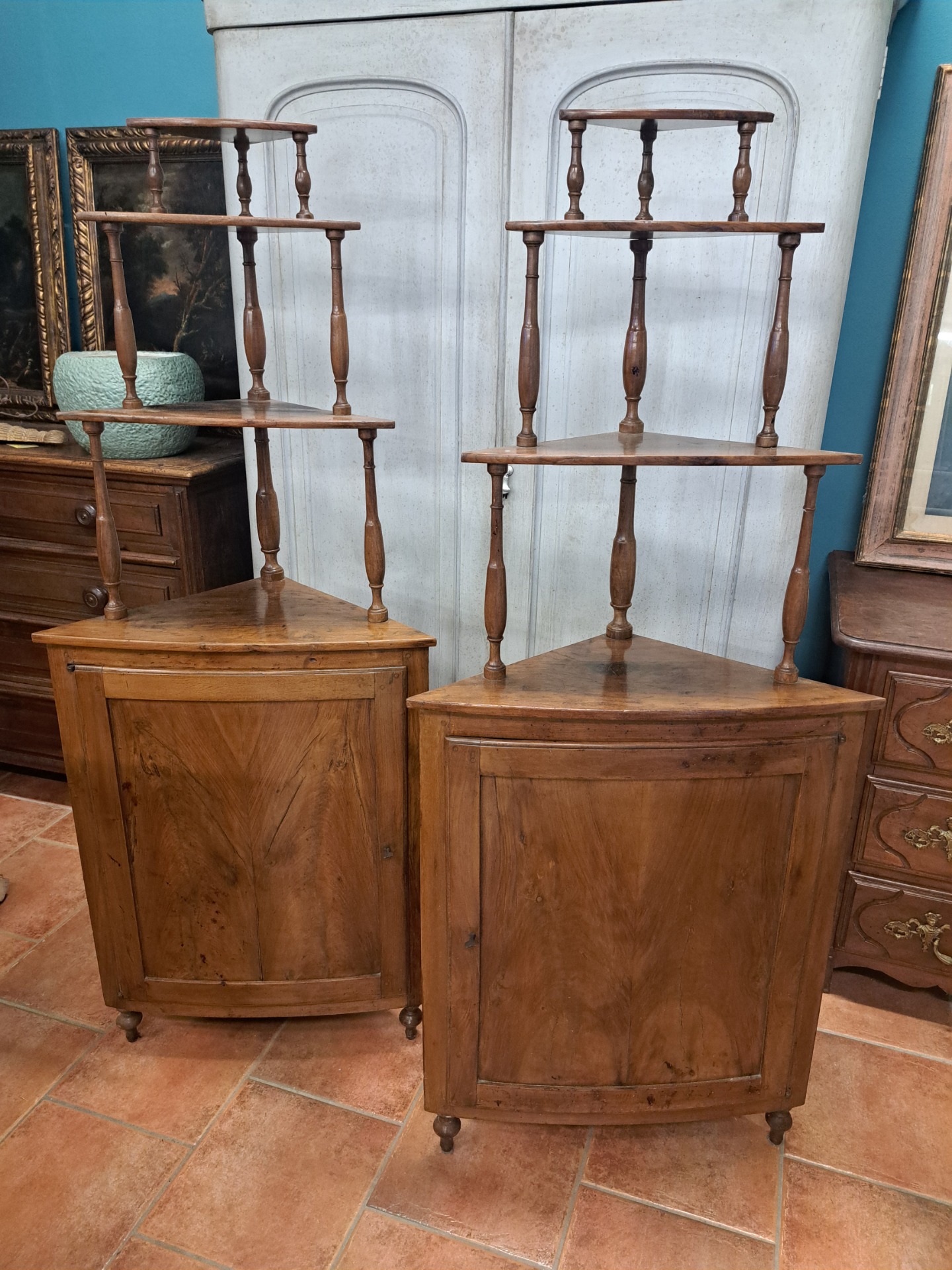 Delightful pair of flamed blond walnut corner cabinets, slightly serpentine front, raised with a three-shelf étagère, elegant turning, feet in typical Directoire style. Wrought iron butterfly hinge. Measurements: wall side 50 cm, total height 172 cm.