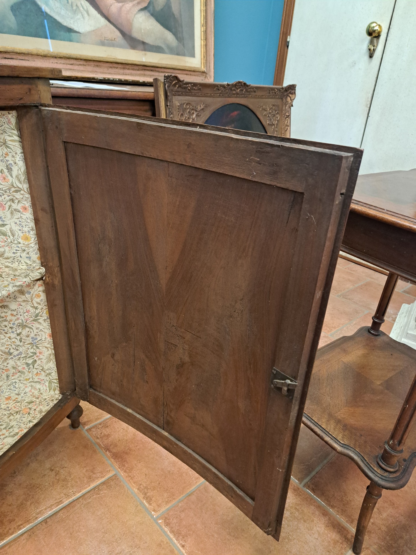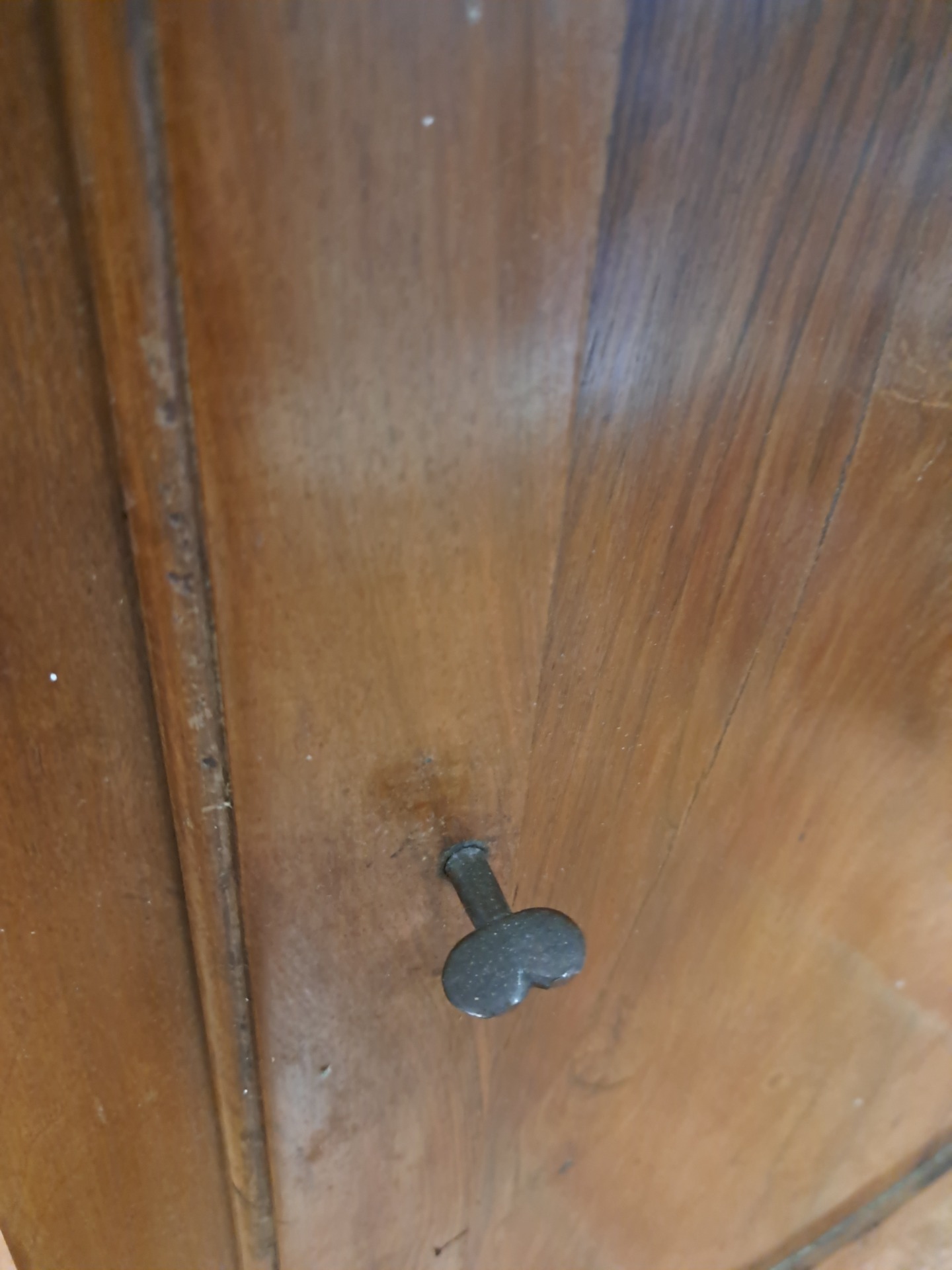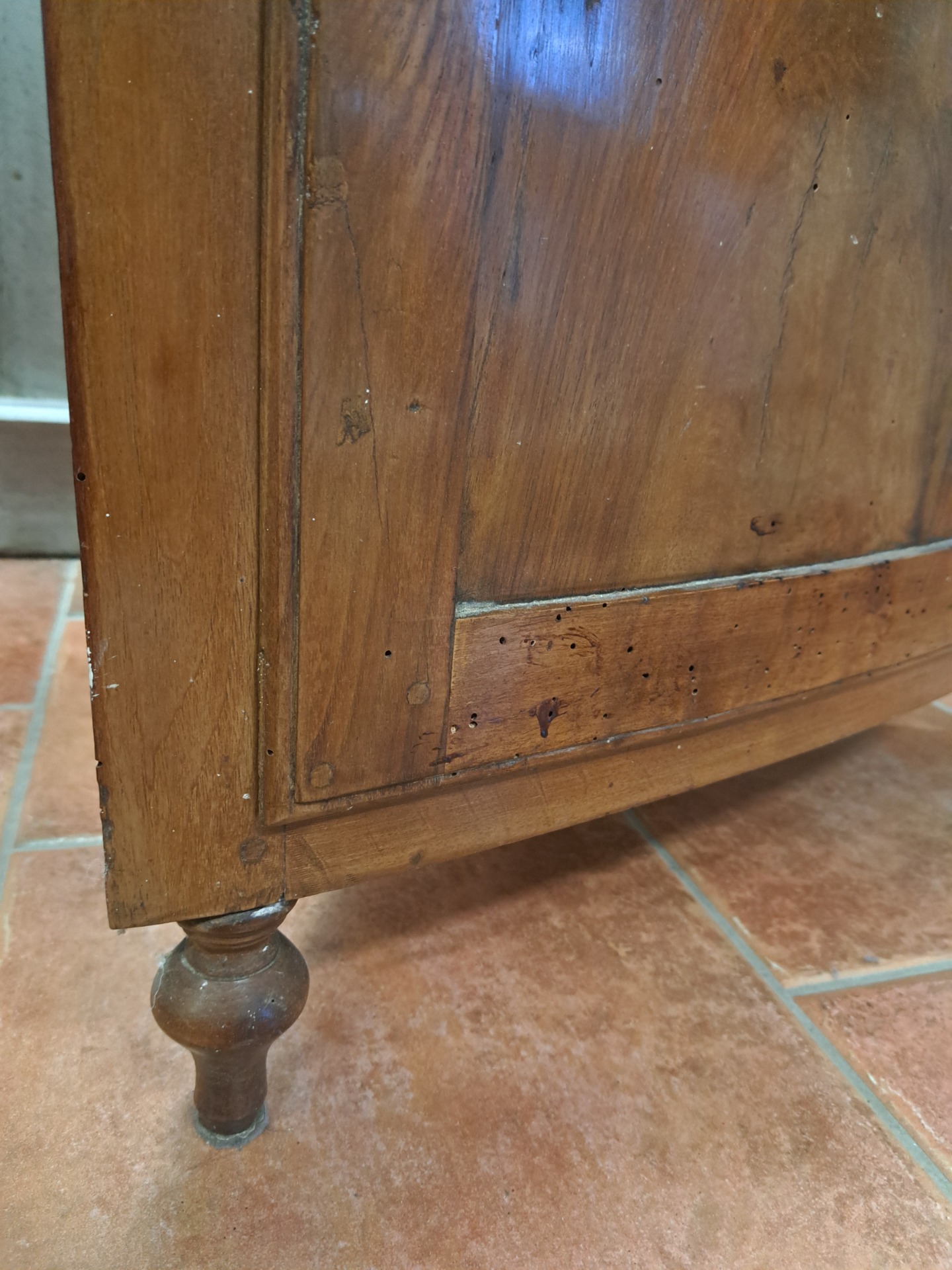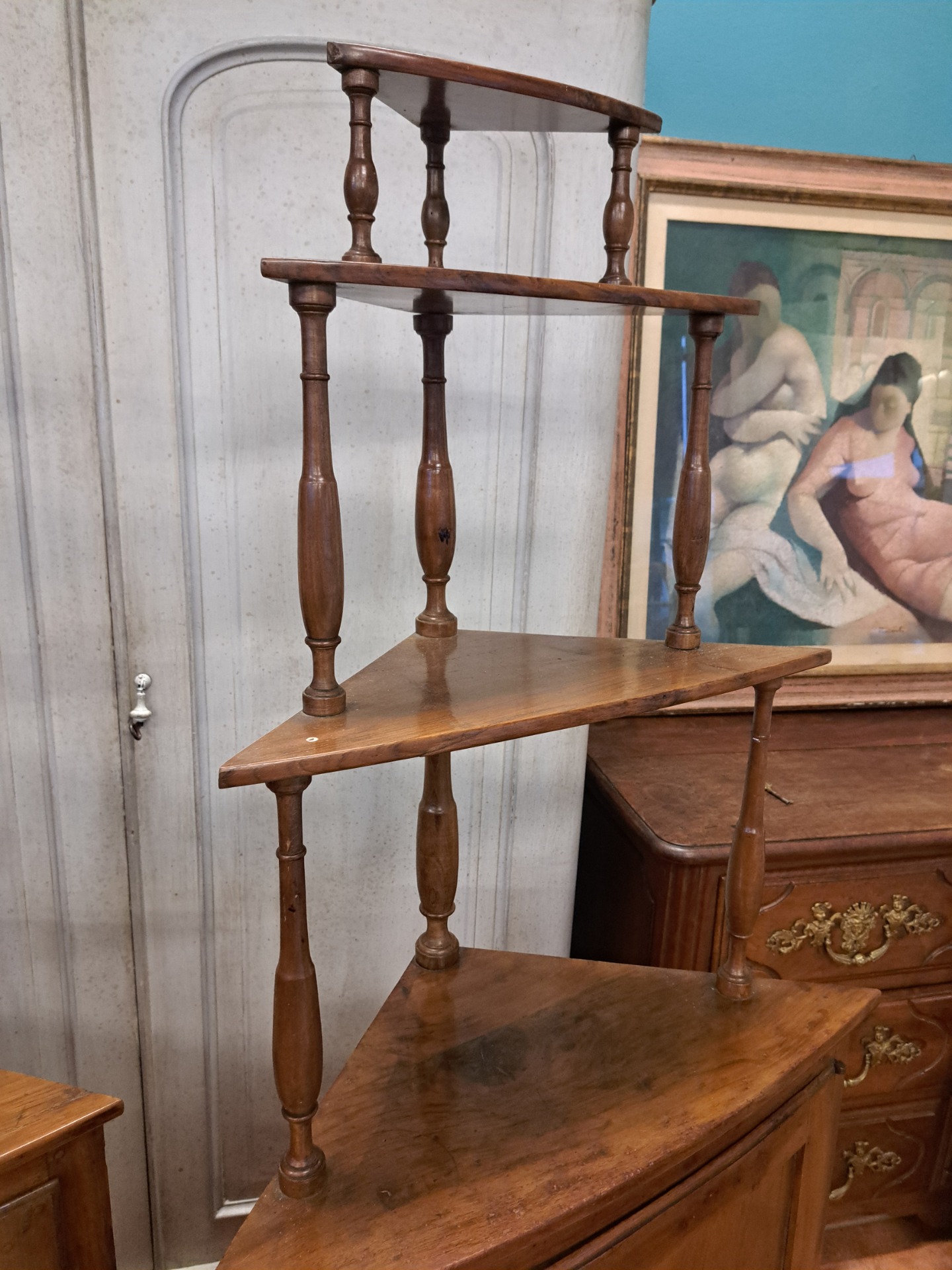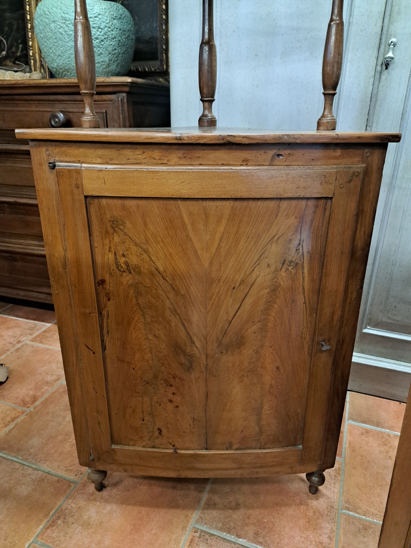 Delightful pair of flamed blond walnut corner cabinets, slightly serpentine front, raised with a three-shelf étagère, elegant turning, feet in typical Directoire style. Wrought iron butterfly hinge. Measurements: wall side 50 cm, total height 172 cm.