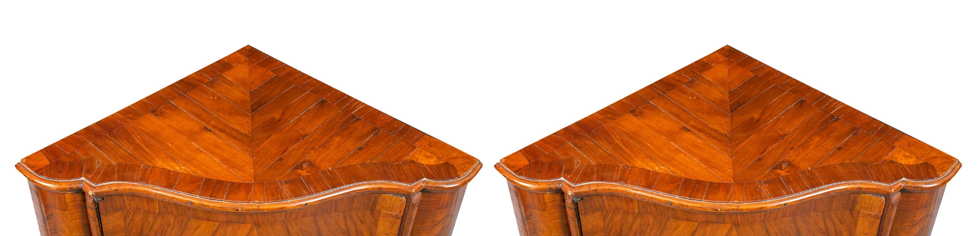 Pair of walnut veneer corner cabinets. Venice, 18th century.