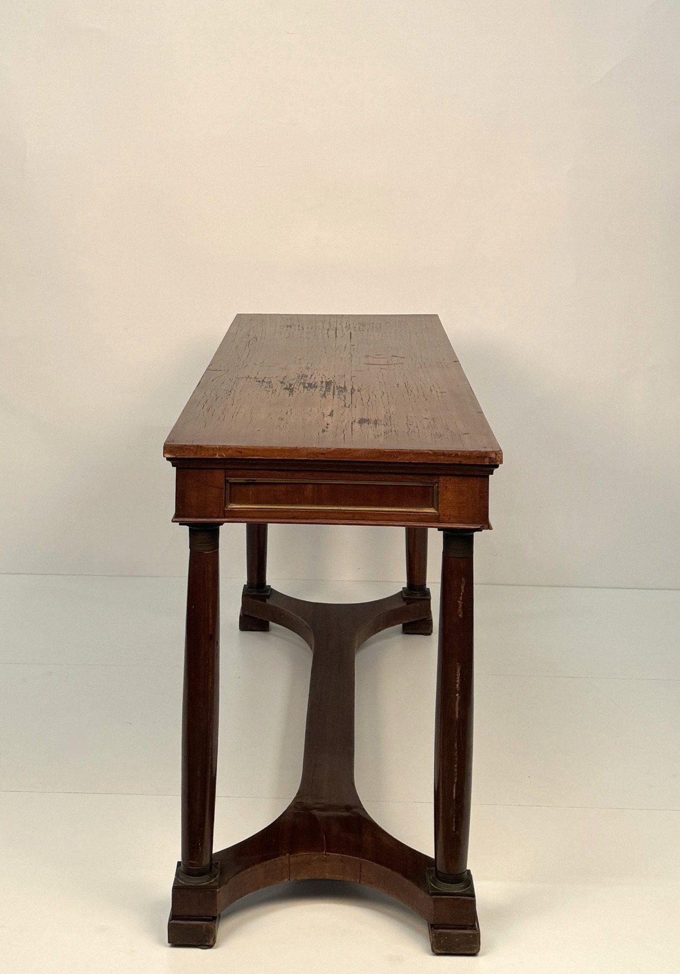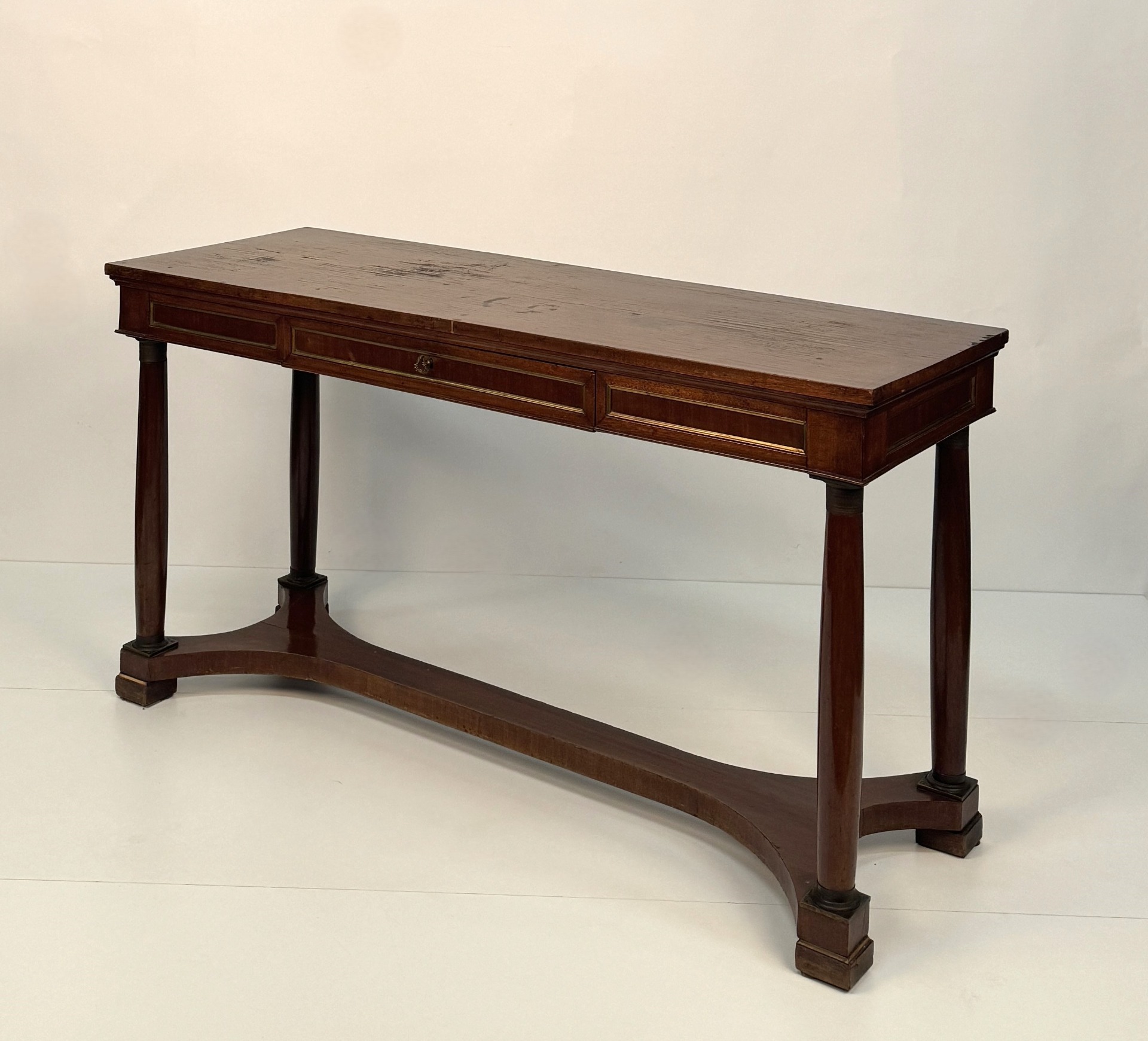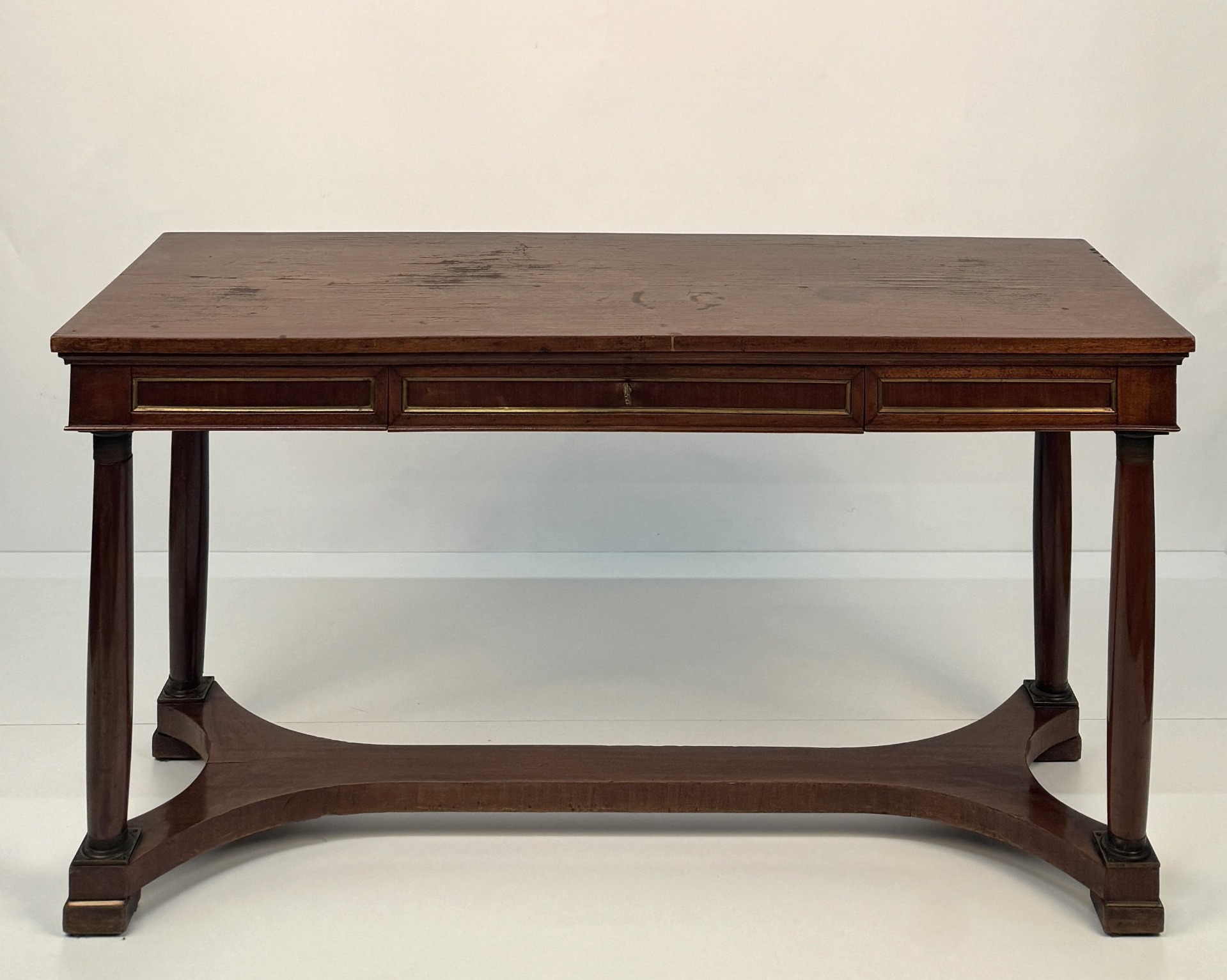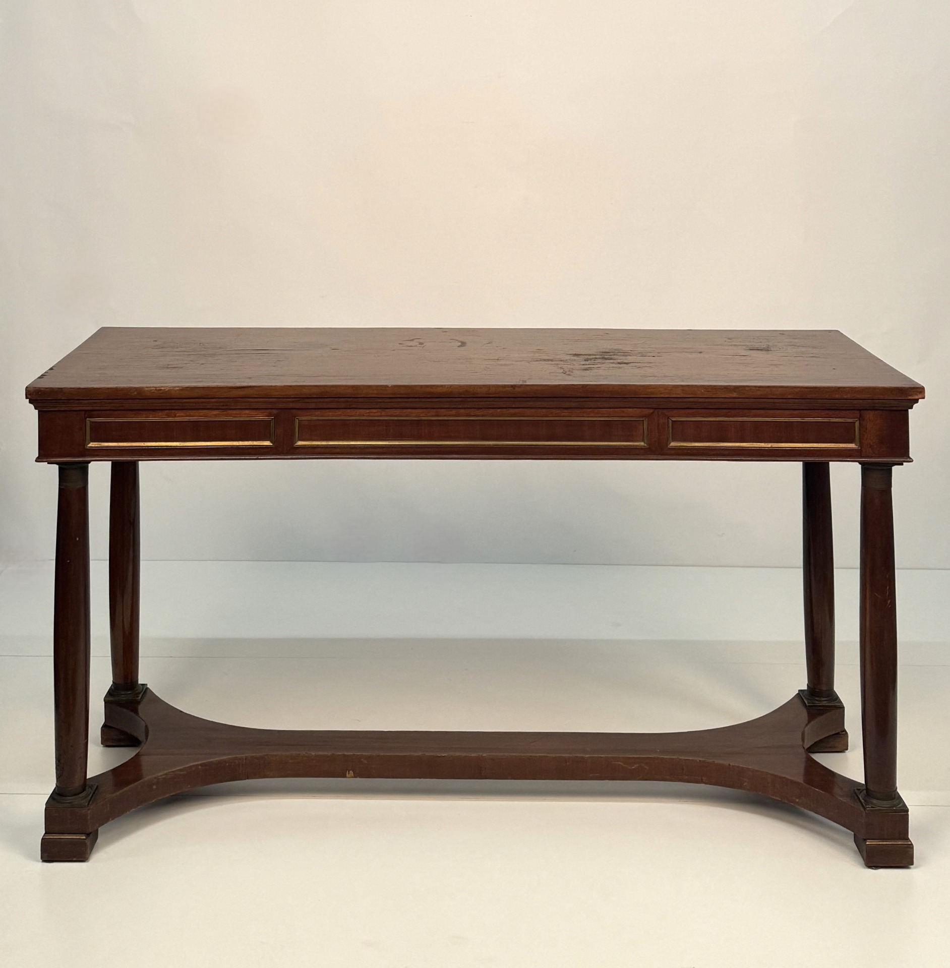 20th-century mahogany desk, with a drawer in the straight apron decorated with gilded profiles, as are the panels decorating the sides and the opposite side. Column legs with metal capitals and bases, connected by a shaped crossbar. Dimensions: 75x141x51 cm.