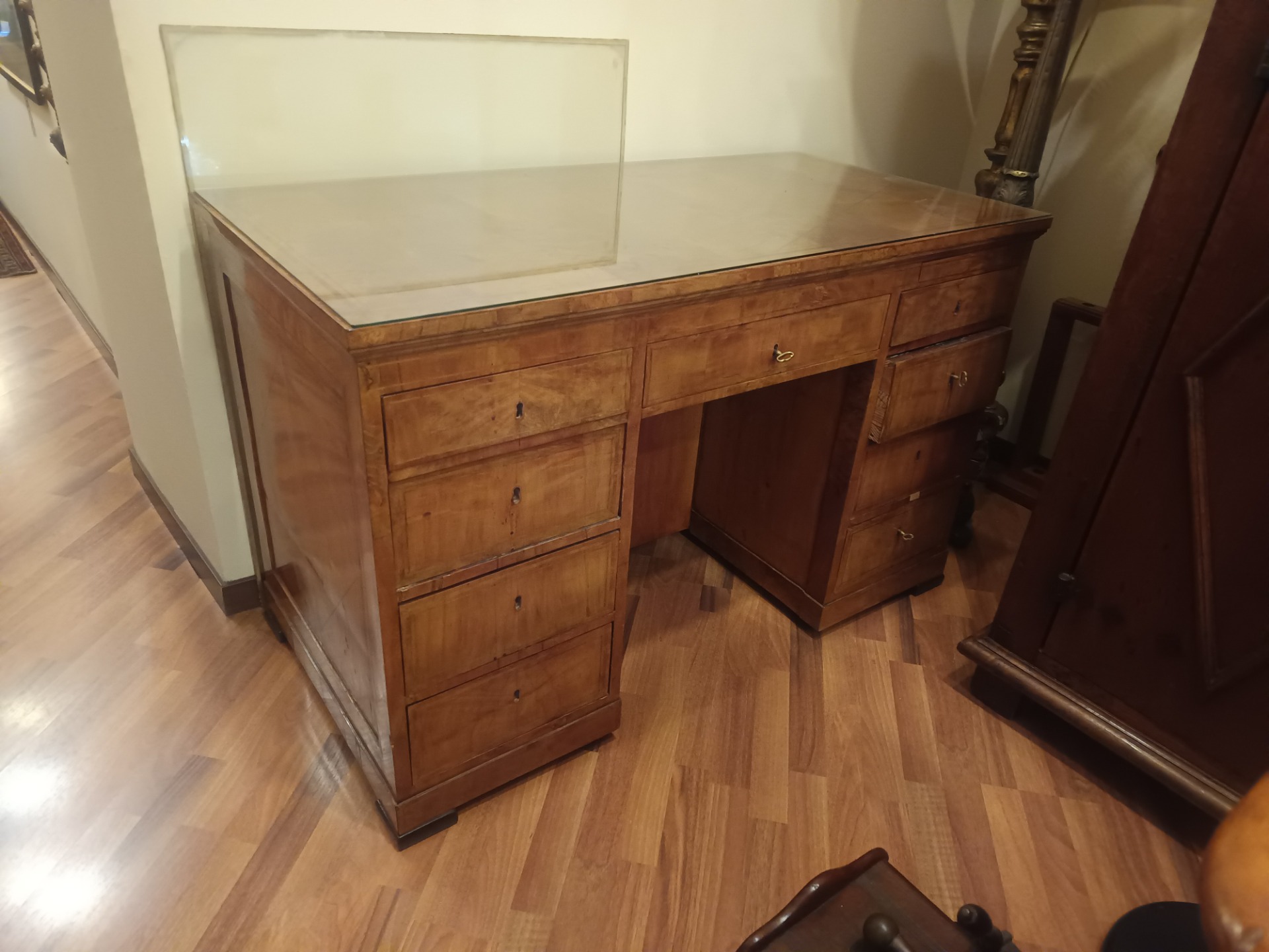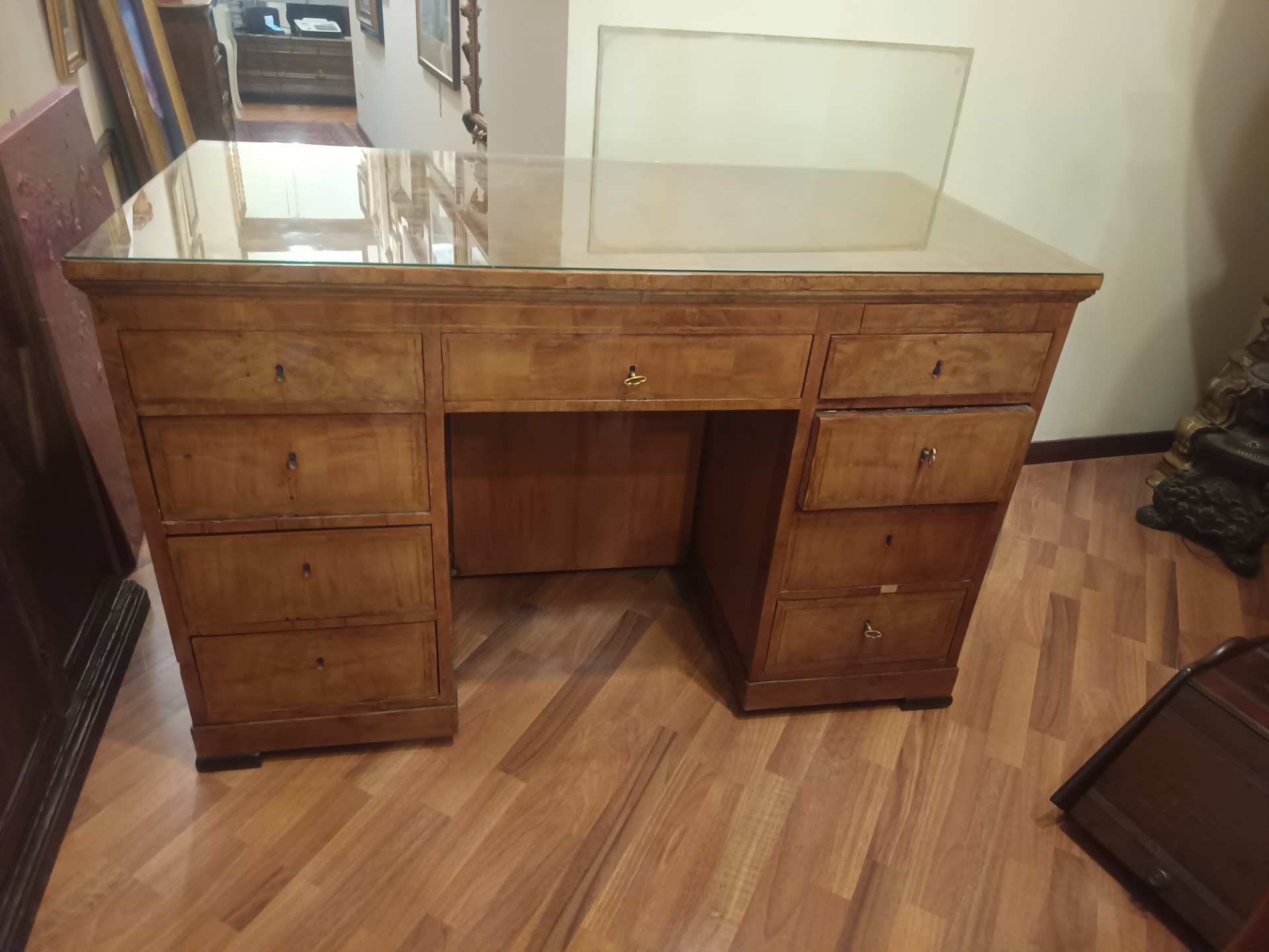 Biedermeier desk in inlaid birch with nine drawers plus one secret drawer. Dimensions: cm 130 x 65 x 83 height.
