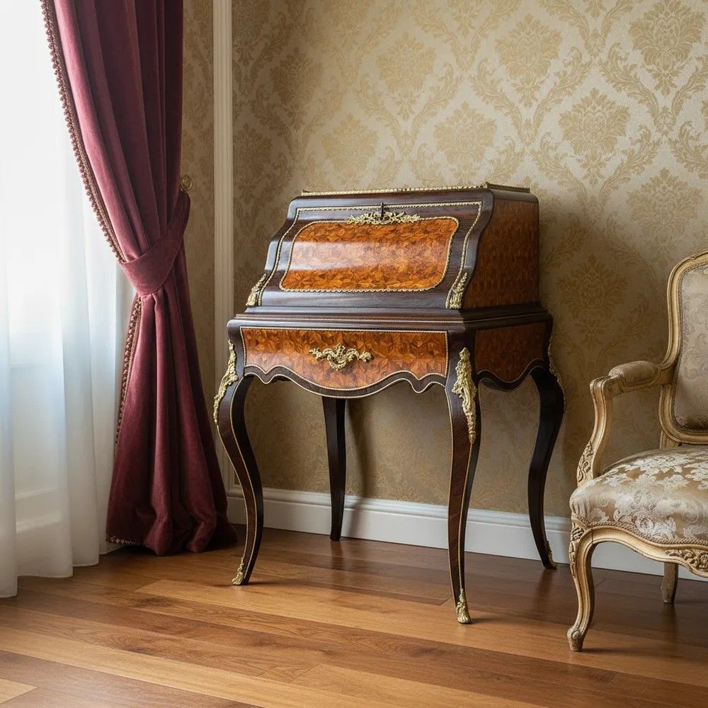 Questa rara scrivania “bonheur du jour” esprime tutto il fascino della manifattura francese dell’epoca Napoleone III, circa 1860. I maestri ebenisti parigini plasmarono un mobile leggero e slanciato, concepito per la corrispondenza privata di una dama raffinata.Il corpo è realizzato in legno di palissandro con pannelli intarsiati in legno di rosa; il motivo a cubo prospettico, tipico del gusto Secondo Impero, crea un sorprendente gioco ottico di profondità e luce. La calda venatura dei legni tropicali si fonde con l’aura scintillante dei bronzi dorati a fuoco finemente cesellati: baccellature, rosette, cartigli e cadute di fiori ornano bordi, montanti e grembiale con straordinaria ricchezza.Il piano ribaltabile si apre rivelando:un interno laccato scuro con due cassetti intarsiati;uno scomparto segreto per lettere;un tappetino di scrittura in pelle verde bottiglia con filetti dorati.La fascia sottostante accoglie un ampio cassetto mosso, anch’esso intarsiato e foderato. Le gambe cabriole, profilate da una sottile baguette di bronzo, terminano in sabot fogliati che slanciano ulteriormente la silhouette.Perfettamente restaurato e lucidato a gommalacca, il mobile è pronto a valorizzare uno studio, un boudoir o un ingresso. Oggetto da collezione che racchiude la maestria tecnica e l’eleganza teatrale del Secondo Impero, capace di dialogare con arredi d’epoca come con interni contemporanei di alto profilo.Stile: Napoleone IIIMateriale: LegnoAltezza (cm): 107Larghezza (cm): 67Profondità (cm): 52Materiale: Bronzo