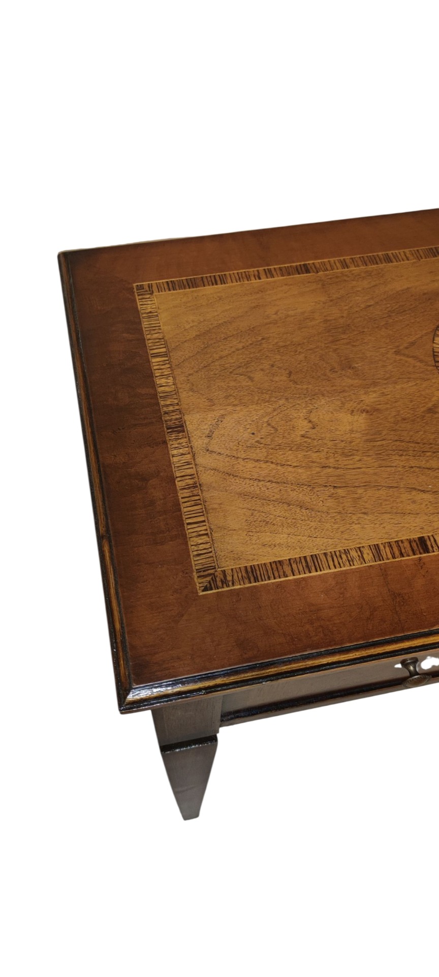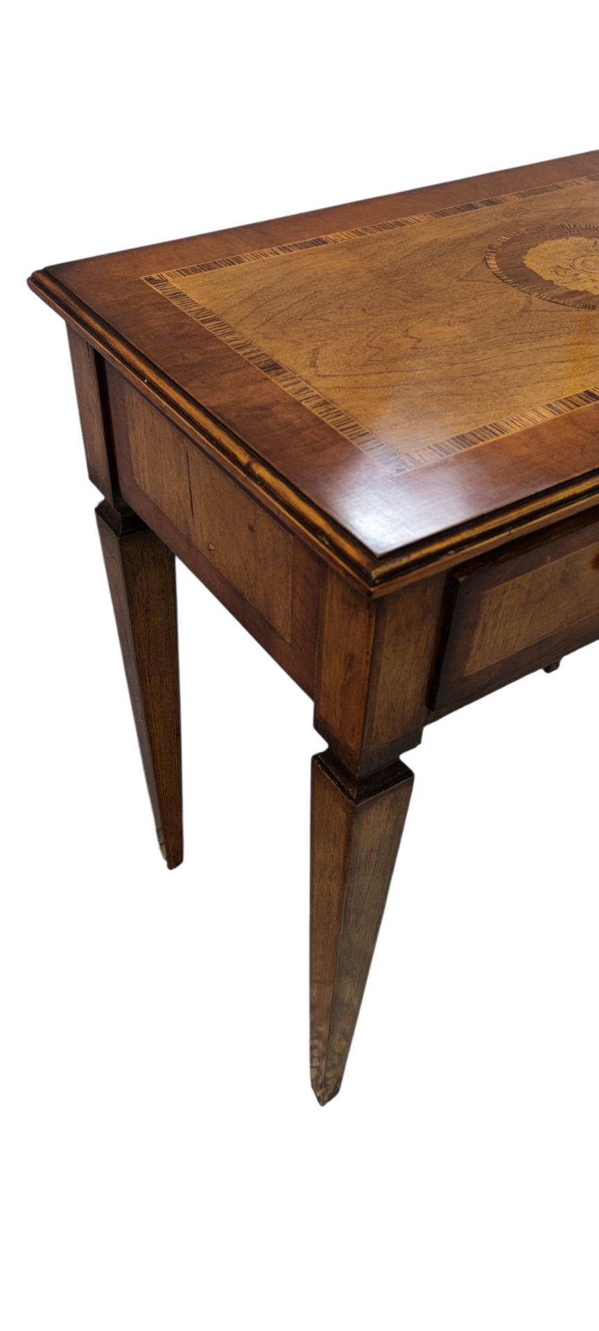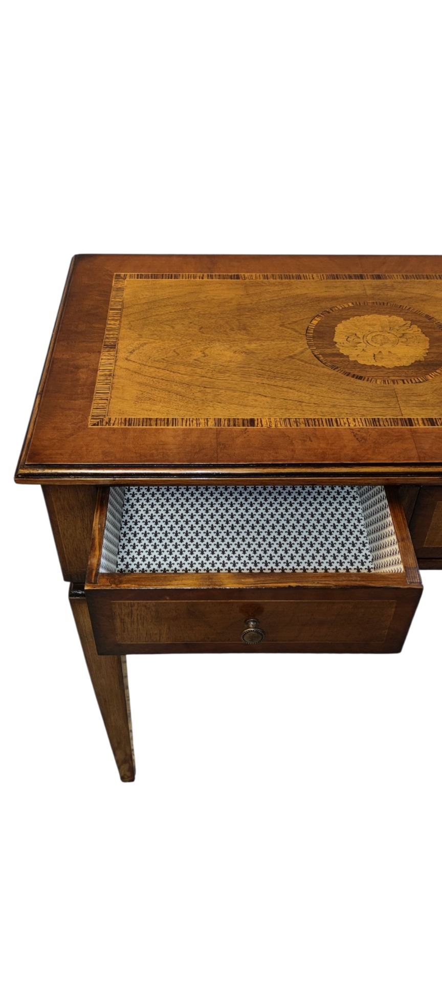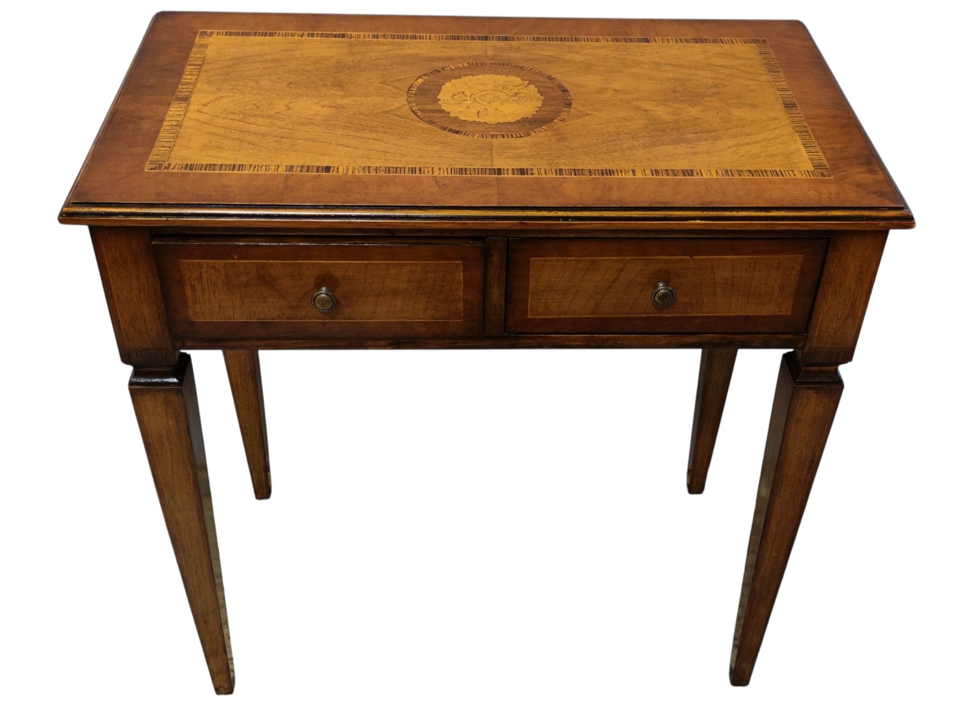 Beautiful directory desk with 2 drawers. Legs shaped as an inverted pyramid. Walnut and maple veneered top. Size: Large width, 40 cm depth, 80 cm height. Period: early 20th century