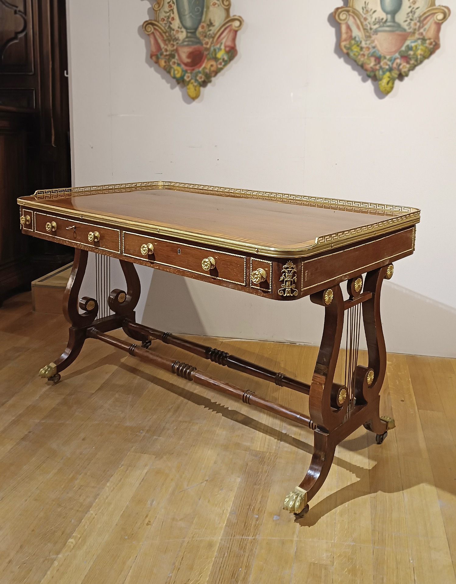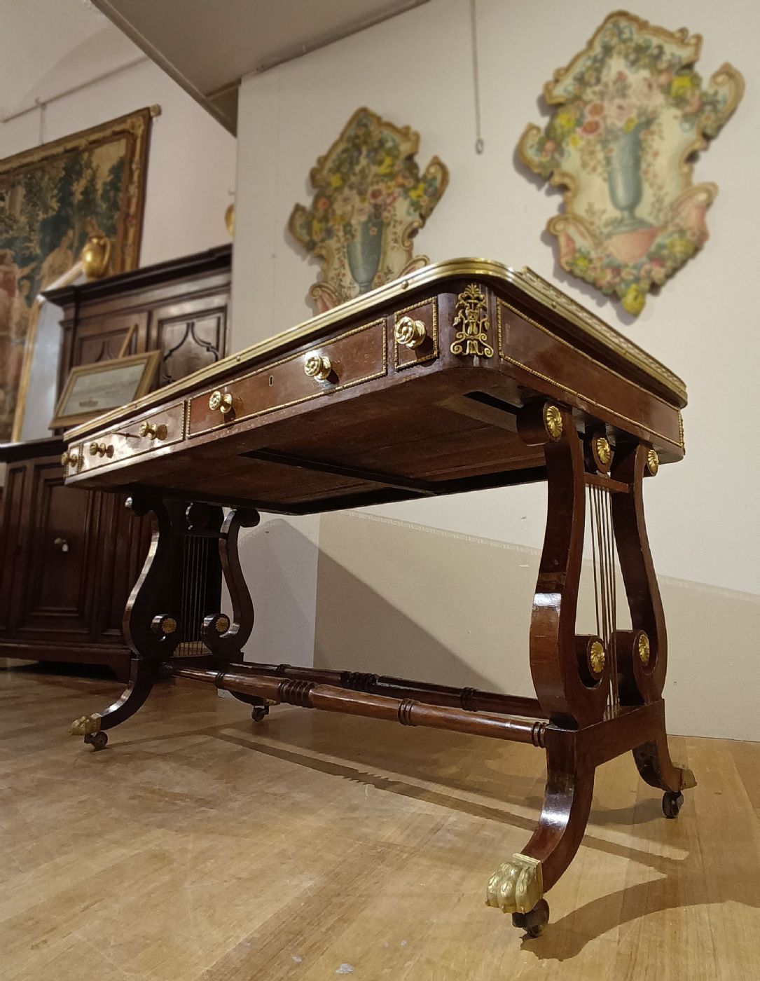 Beautiful and elegant center desk, with high quality inlays in walnut and rosewood, and embellished with lost-wax cast bronze decorations. The desk is distinguished by its lyre legs, joined by turned parts and decorated with floral details in gilded bronze, with legs ending in feral paws, also in gilded bronze, equipped with wheels to facilitate movement. The top has an inlaid band and a balustrade, also in gilded bronze, finely chiseled, which adds further elegance. In the band of the undertop there are three openable drawers with gilded bronze handles: two of medium size and a particular smaller one, located near the right corner, functional for pens and inkwells. It is a desk of great taste and refinement, capable of furnishing any environment with class and elegance. Italian manufacture, reminiscent of the neoclassical style of French cabinetmakers, in the Napoleon III period, around the mid-nineteenth century.