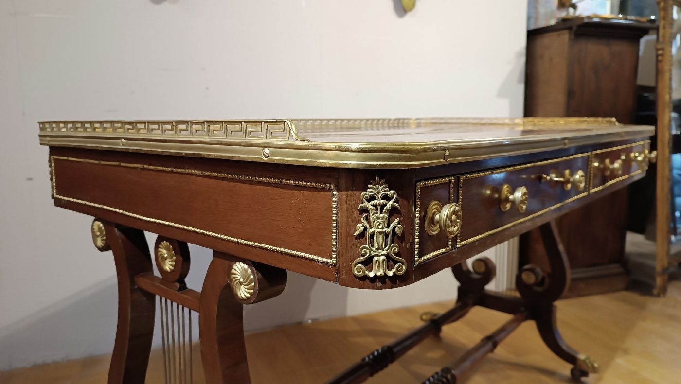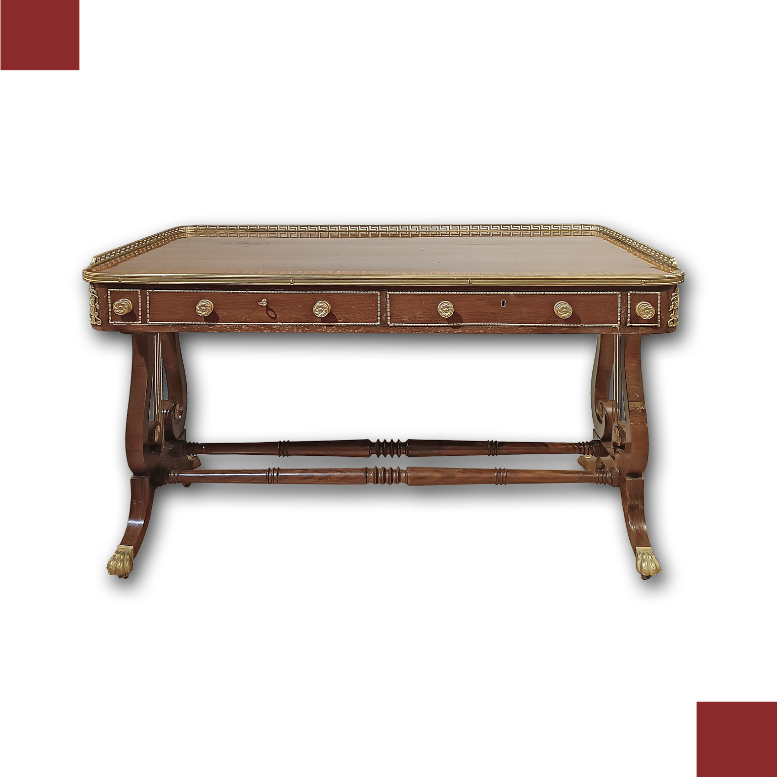 Beautiful and elegant center desk, with high quality inlays in walnut and rosewood, and embellished with lost-wax cast bronze decorations. The desk is distinguished by its lyre legs, joined by turned parts and decorated with floral details in gilded bronze, with legs ending in feral paws, also in gilded bronze, equipped with wheels to facilitate movement. The top has an inlaid band and a balustrade, also in gilded bronze, finely chiseled, which adds further elegance. In the band of the undertop there are three openable drawers with gilded bronze handles: two of medium size and a particular smaller one, located near the right corner, functional for pens and inkwells. It is a desk of great taste and refinement, capable of furnishing any environment with class and elegance. Italian manufacture, reminiscent of the neoclassical style of French cabinetmakers, in the Napoleon III period, around the mid-nineteenth century. Measurements: H x W x D 75 x 122 x 75cm