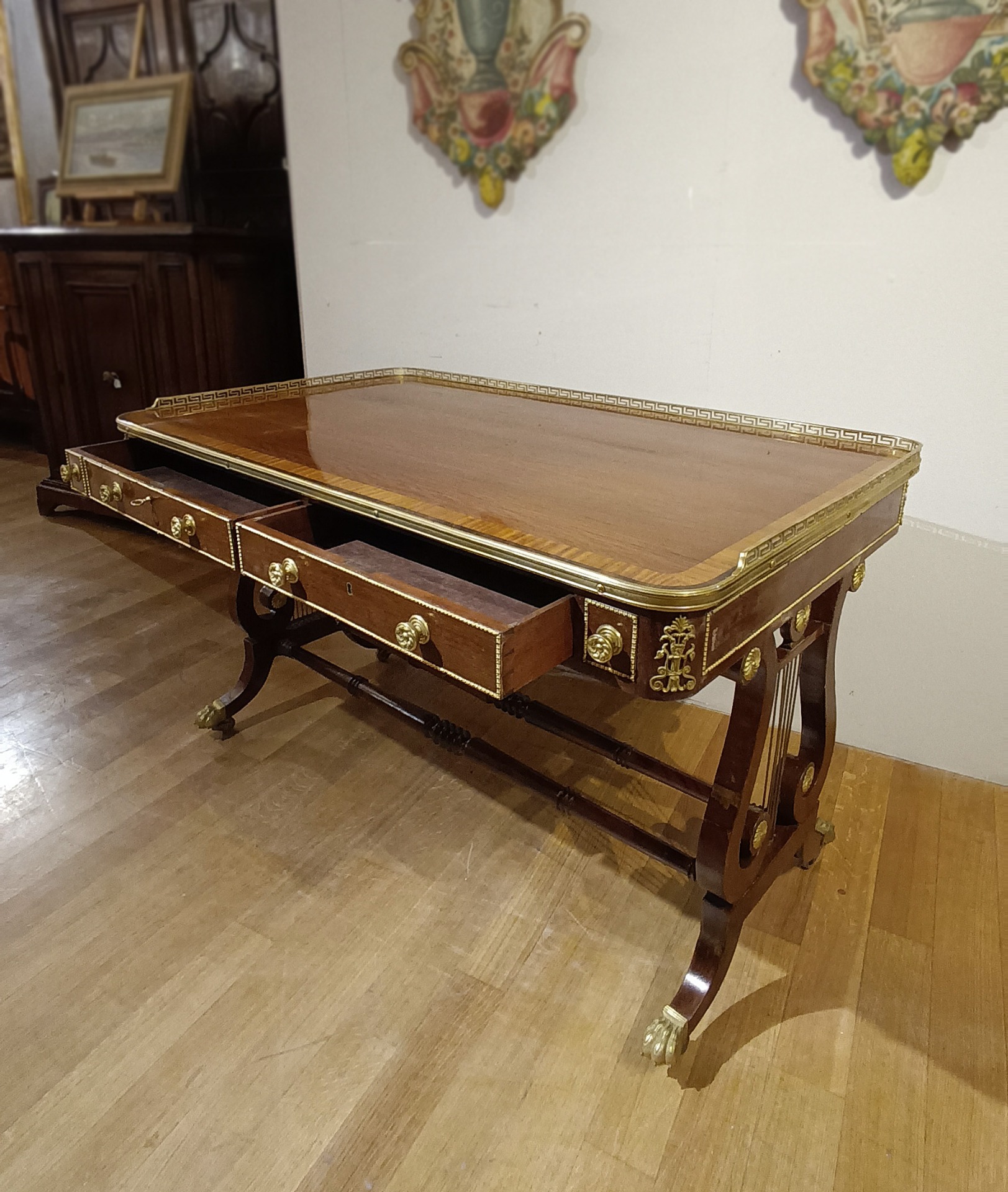 Beautiful and elegant center desk, with high quality inlays in walnut and rosewood, and embellished with lost-wax cast bronze decorations. The desk is distinguished by its lyre legs, joined by turned parts and decorated with floral details in gilded bronze, with legs ending in feral paws, also in...