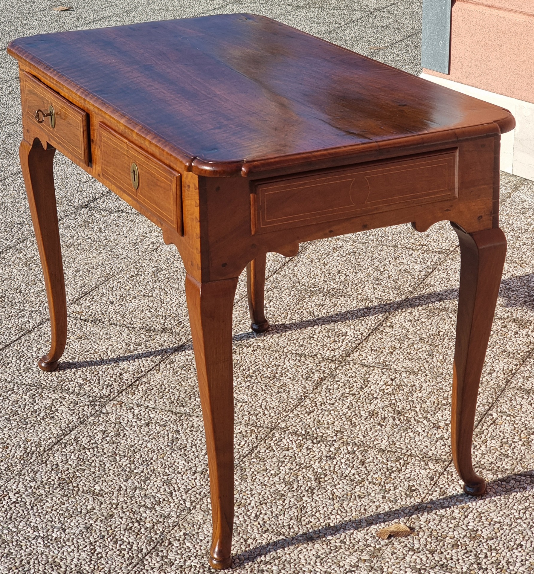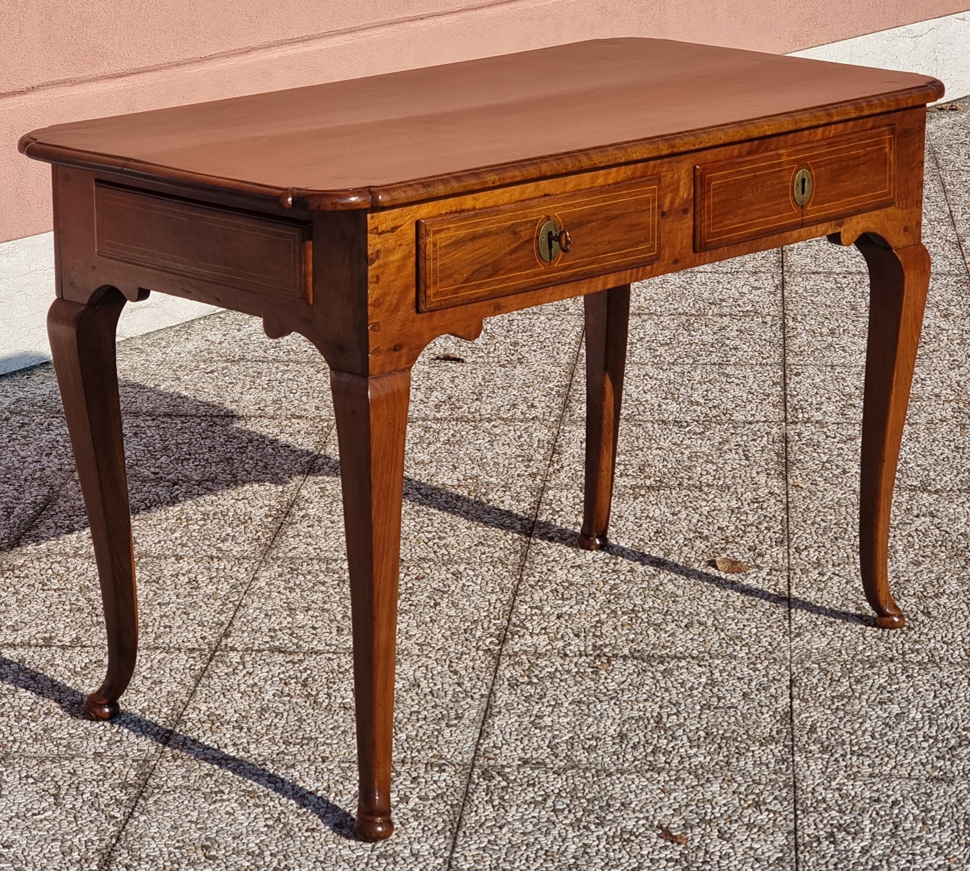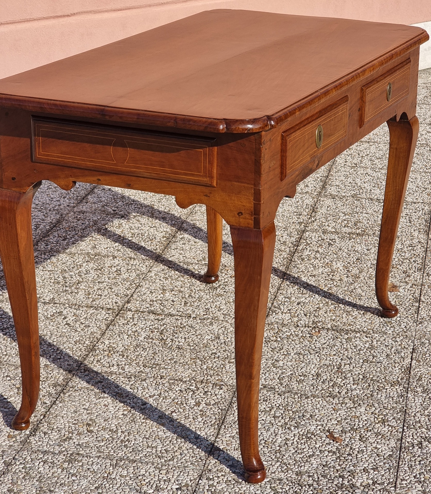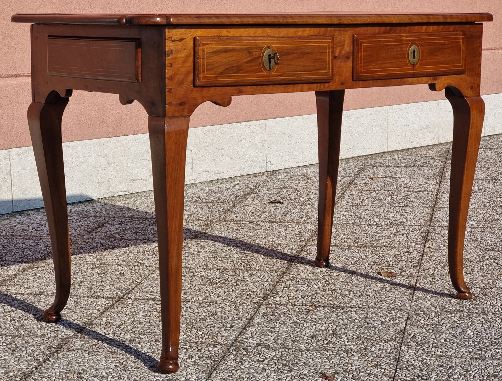 Refined Piedmontese center desk in solid walnut, datable to the second half of the 18th century. The top, made from a single wide walnut plank, reveals the quality of the raw material and the care in execution. The entire piece of furniture is threaded in maple wood, with an elegant double thread framing the fronts of the drawers and the side panels, a distinctive sign of high-level cabinetmaking work. The table has two drawers on the front and two faux drawers on the back, a feature that allows it to be used as a center piece of furniture, perfectly finished on all sides. The moved and tapered legs, in Piedmontese style, give balance and momentum to the whole, while the structure, made with solid interlocking joints, guarantees stability and durability over time. The furniture is in perfect condition, with a warm and uniform patina that enhances the natural wood grain. A beautiful example of eighteenth-century Piedmontese cabinetmaking, sober, elegant and of great craftsmanship. --- Measures: Width 118 cm × Depth 64 cm × Height 79 cm --- Note: For further information, photos or technical details, do not hesitate to contact us. Worldwide shipping available with professional packaging.