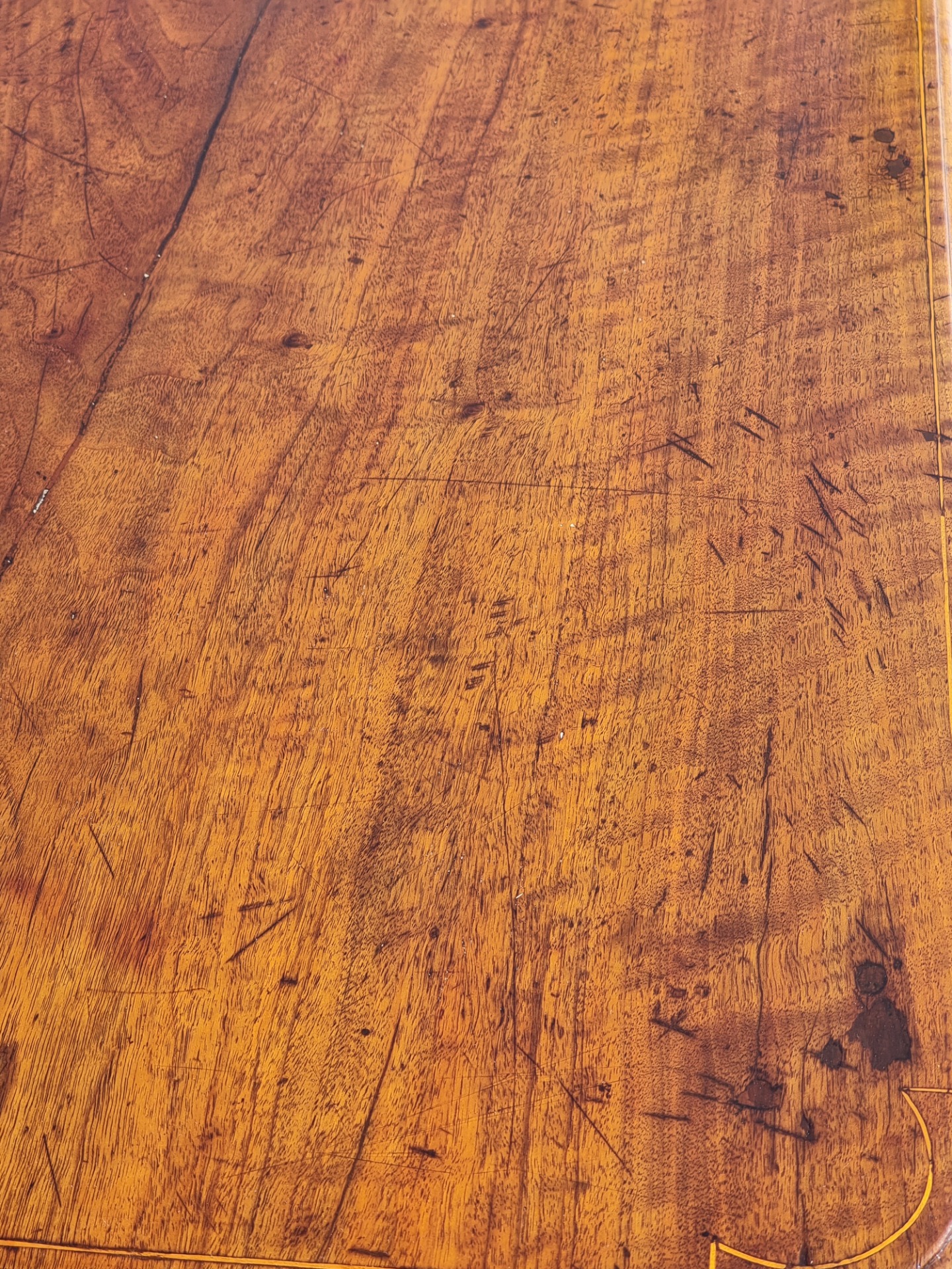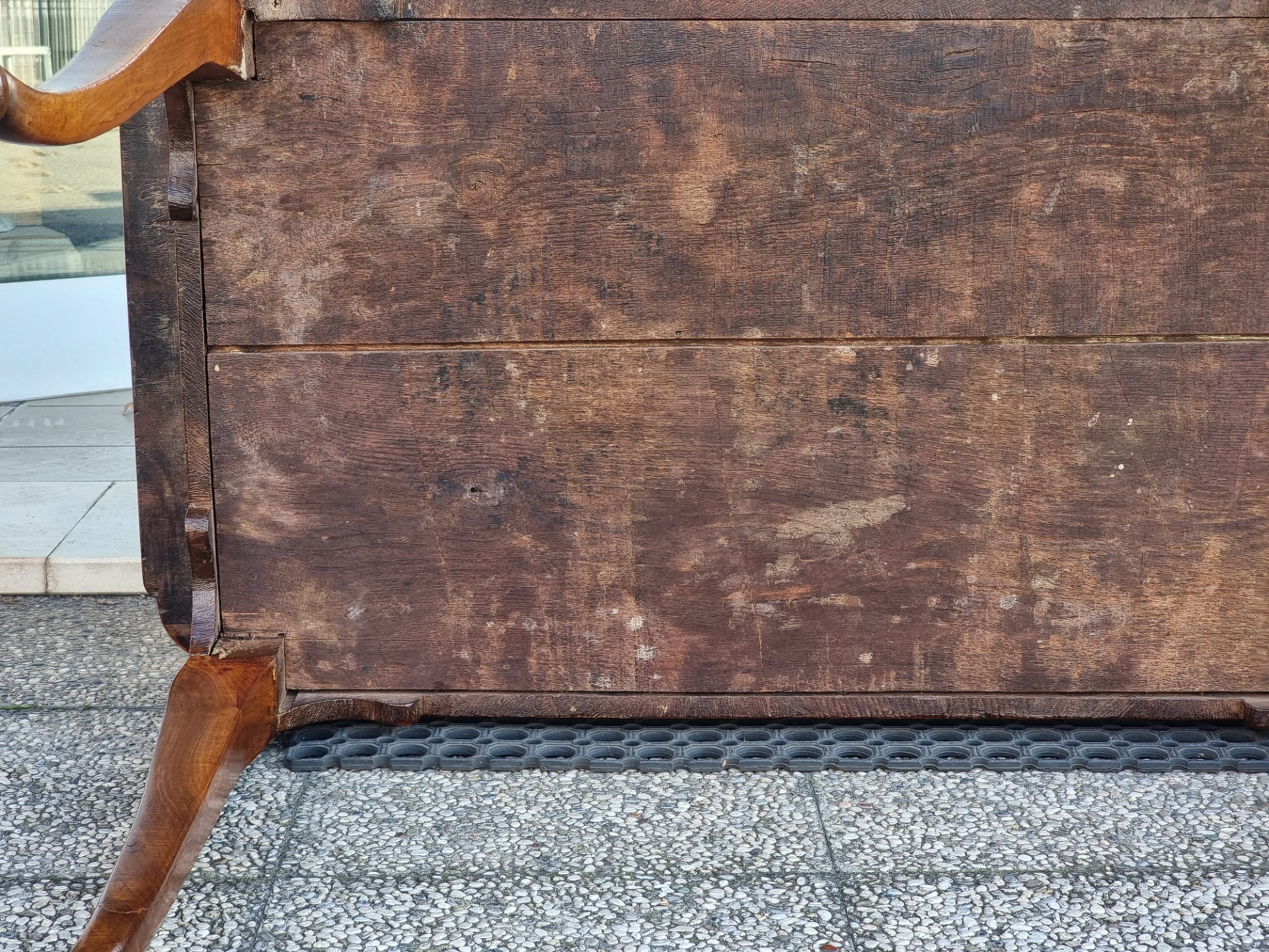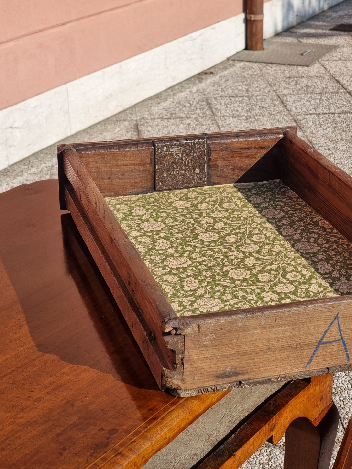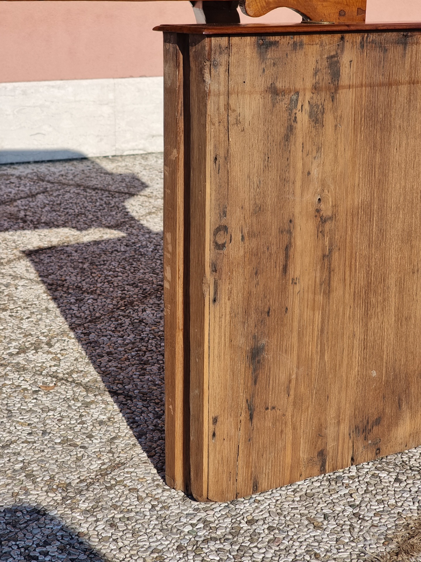 Refined Piedmontese center desk in solid walnut, datable to the second half of the 18th century. The top, made from a single wide walnut plank, reveals the quality of the raw material and the care in execution. The entire piece of furniture is threaded in maple wood, with an elegant double thread framing the fronts of the drawers and the side panels, a distinctive sign of high-level cabinetmaking work. The table has two drawers on the front and two faux drawers on the back, a feature that allows it to be used as a center piece of furniture, perfectly finished on all sides. The moved and tapered legs, in Piedmontese style, give balance and momentum to the whole, while the structure, made with solid interlocking joints, guarantees stability and durability over time. The furniture is in perfect condition, with a warm and uniform patina that enhances the natural wood grain. A beautiful example of eighteenth-century Piedmontese cabinetmaking, sober, elegant and of great craftsmanship. --- Measures: Width 118 cm × Depth 64 cm × Height 79 cm --- Note: For further information, photos or technical details, do not hesitate to contact us. Worldwide shipping available with professional packaging.