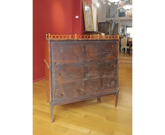 Elegante ribalta a rullo in massello di ciliegio intagliato a mano, impreziosita da un terrazzino in legno di acero. La ribalta richiama uno stile inglese, con gambe troncopiramidali e due cassetti ergonomici ideali per riporre oggetti. La sua particolarità risiede nel terrazzino, decorato con motivi geometrici che conferiscono eleganza al mobile, così come gli intarsi presenti sul piano a ribalta e nel sottopiano. Il piano a ribalta si apre a rullo e al suo interno ospita cassetti in legno di acero, oltre a un piano da scrittoio scorrevole rivestito in pelle marocchina di colore naturale. Questa ribalta, di grande raffinatezza ed eleganza, si presta ad arredare qualsiasi ambiente con classe e gusto. Manifattura toscana del periodo neoclassico, intorno ai primi del XIX secolo.