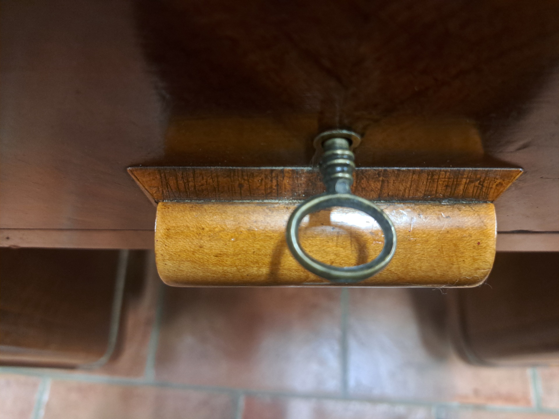 Bella scrivania in radica di noce dell'inizio del '900, epoca Deco, tre cassetti, due sportelli (uno dei quali cela a sua volta altri tre cassetti interni), rivestita internamente di un elegante tessuto color avorio.La scrivania può essere all'occorrenza posizionata anche a centro stanza.